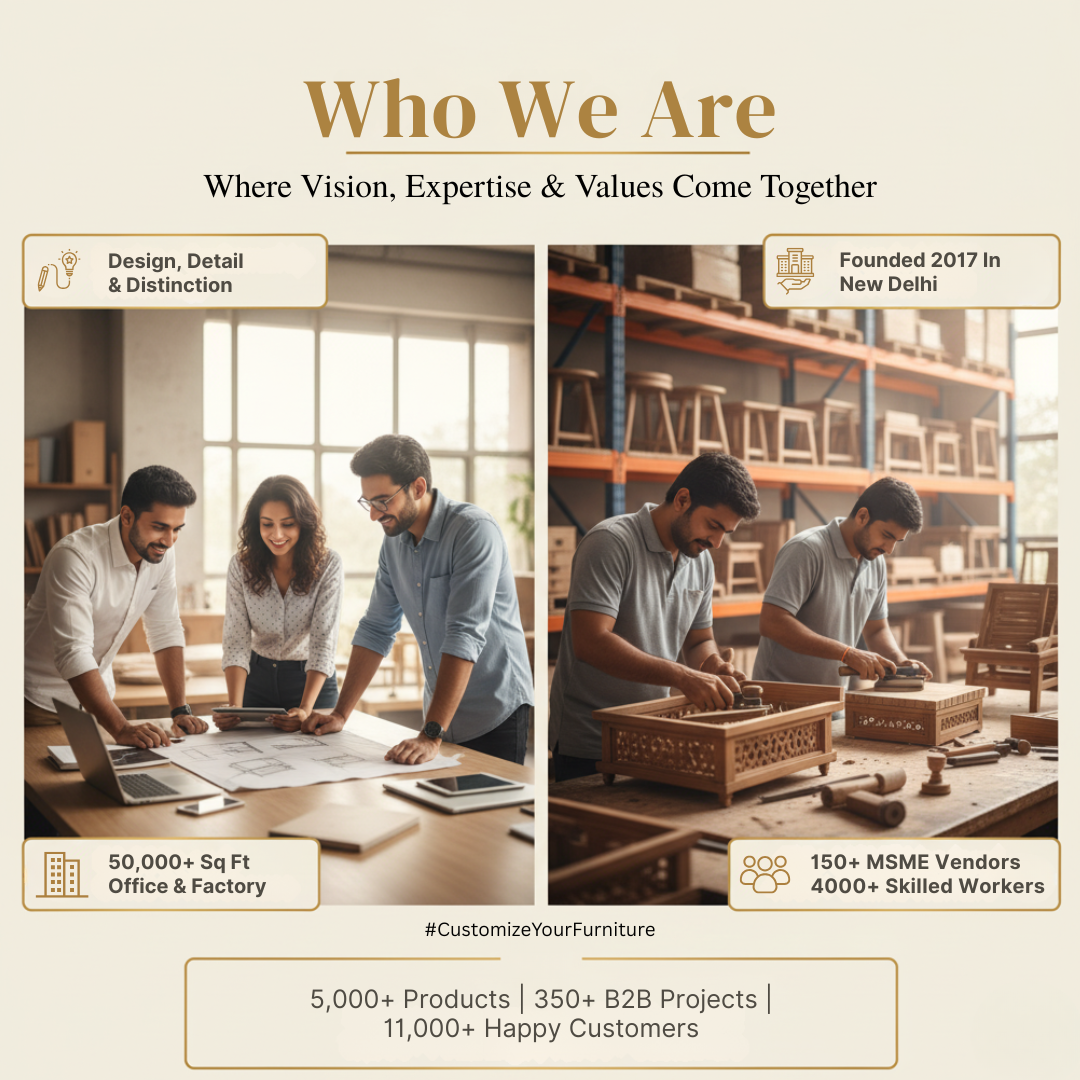 We collaborate with 150+ MSME vendors and empower over 4,000 skilled workers, driving growth for local communities. Over the past nine years, we’ve launched more than 5,000 product SKUs, delivered 18,000+ finishings, served 11,000+ customers, and completed over 350 B2B and commercial furniture projects across India.