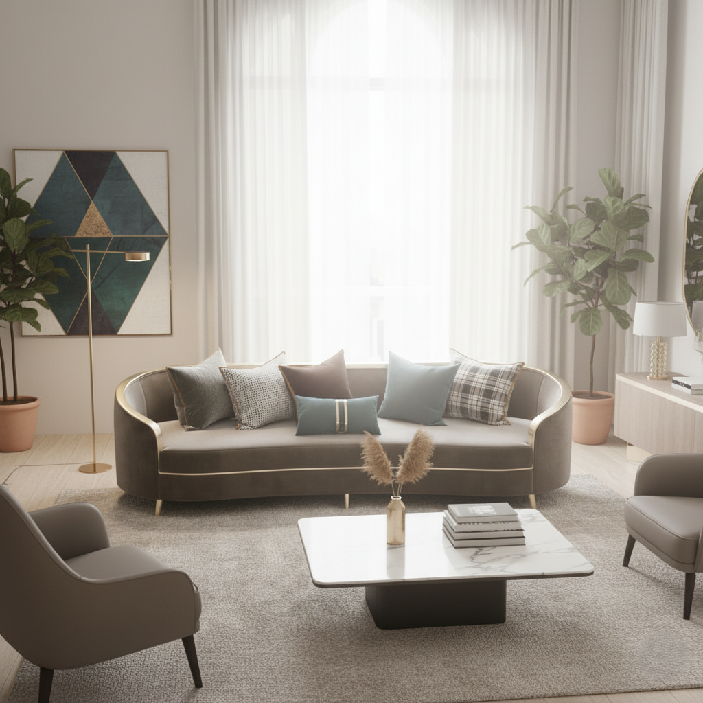 উপাদান : মারান্ডি কাঠ দিয়ে তৈরি মজবুত অভ্যন্তরীণ ফ্রেম এবং ভেলভেট গৃহসজ্জার সামগ্রী, উচ্চ-ঘনত্বের ফোম কুশনিং এবং পাউডার লেপযুক্ত ধাতব পা দিয়ে স্তরযুক্ত