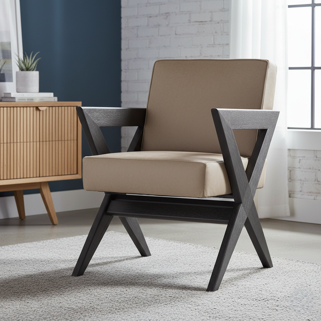 Distinctive X-Shaped Base/Arms: A standout feature is the thick, angular wooden frame that forms an "X" or cross-pattern at the sides, creating both the legs and integrated armrests.
