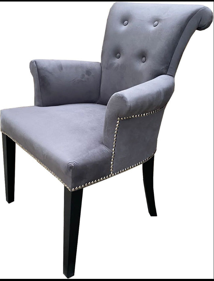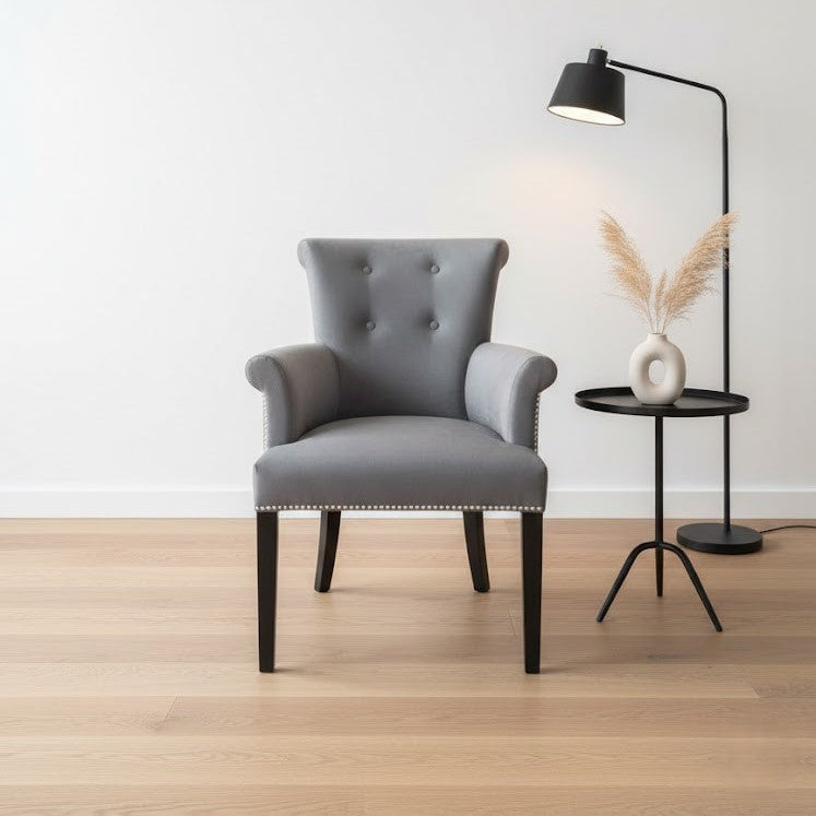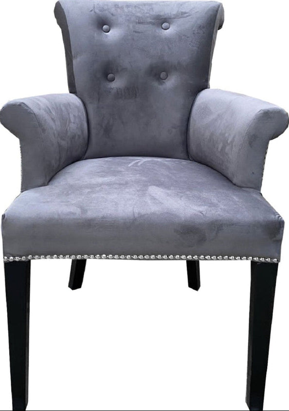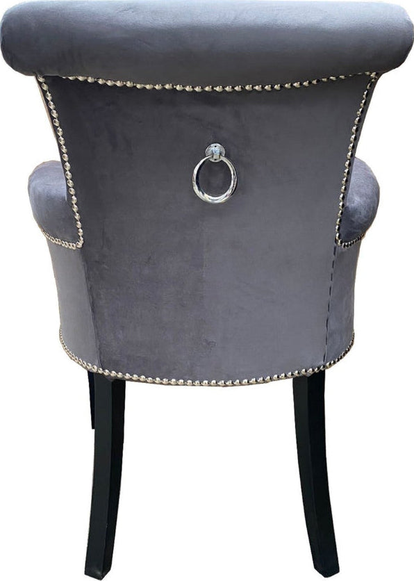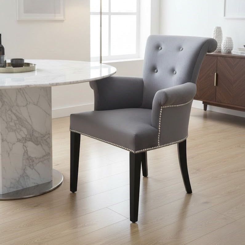 Plush Velvet Upholstery: The entire chair is covered in a soft, grey velvet fabric, offering a rich tactile feel and a subtle sheen