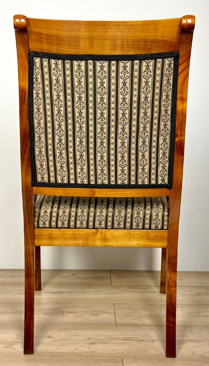 Striped & Patterned Upholstery: Both the seat and the backrest feature a sophisticated striped fabric with an intricate patterned border or central motif, often seen in classical designs. The colours appear to be black, gold, and cream.