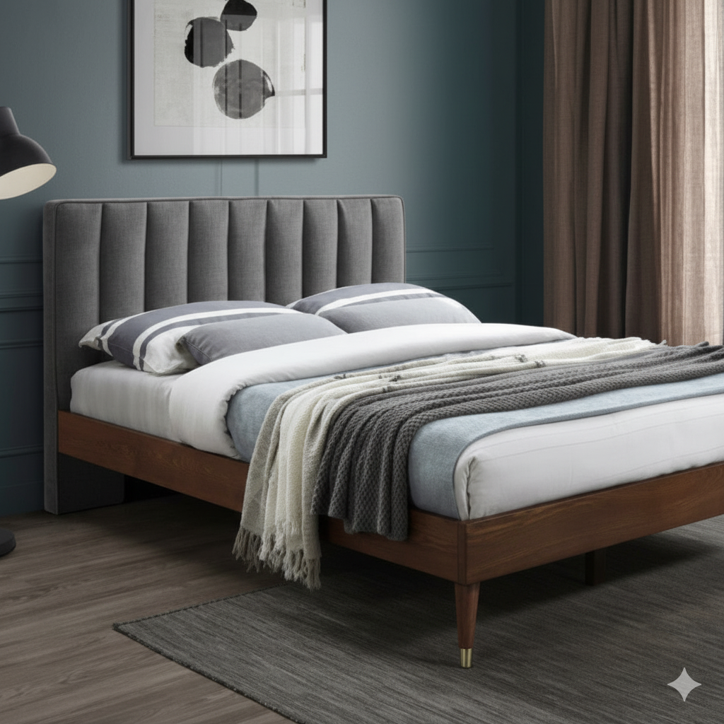 উপাদান: উচ্চমানের সলিড কাঠের তৈরি ফ্রেম, অভ্যন্তরীণ কাঠামো সহ বাণিজ্যিক আইএসআই প্লাইবোর্ড, ল্যামিনেট ফিনিশ, গৃহসজ্জার সামগ্রীযুক্ত ধূসর হেডবোর্ড এবং কাঠের পা, ধাতব ক্যাপ