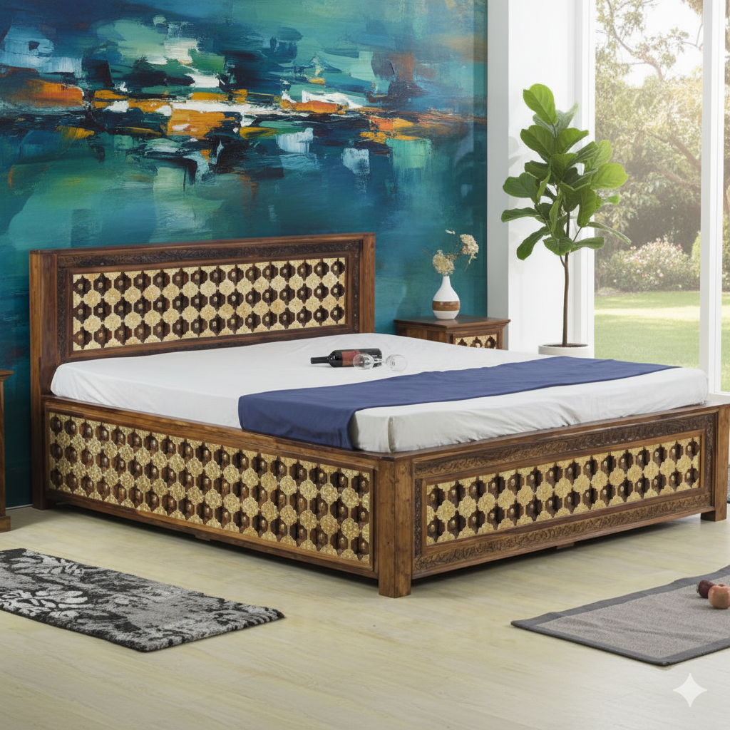 উপাদান: উচ্চমানের সলিড কাঠ দিয়ে তৈরি ফ্রেম, অভ্যন্তরীণ কাঠামো সহ বাণিজ্যিক আইএসআই প্লাইবোর্ড, প্রিমিয়াম সলিড সেগুন কাঠ এবং ব্যহ্যাবরণ ম্যালামাইন পলিশ দিয়ে তৈরি অ্যান্টিক ধাতু সোনালী শীট