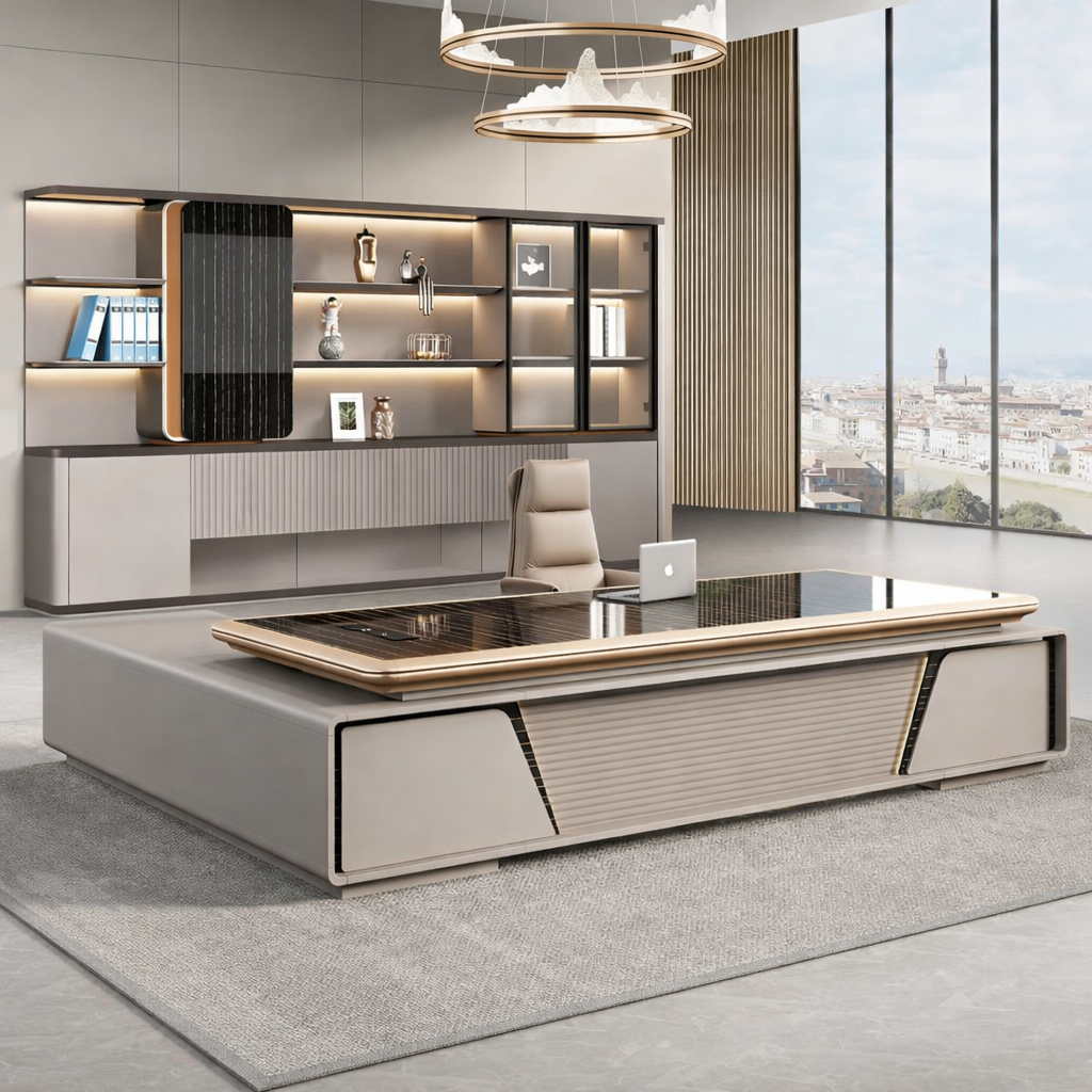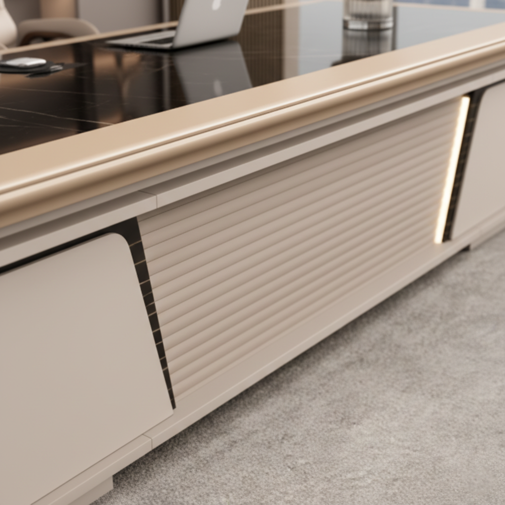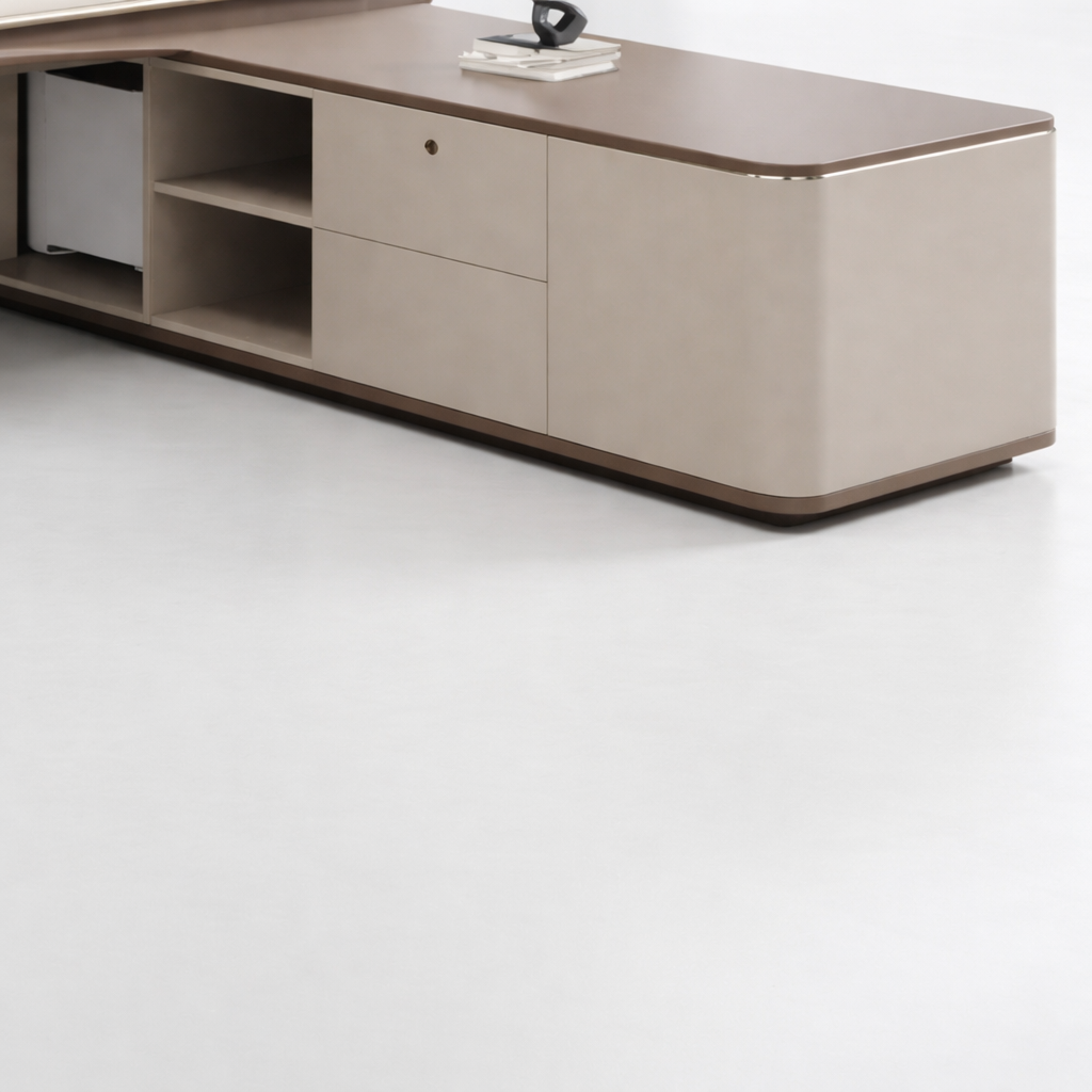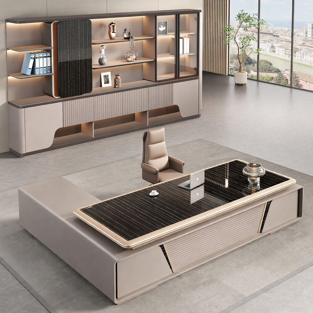 বৈশিষ্ট্য: Spacious L-shape worktop, integrated side storage unit, rounded safety edges, concealed cable grommet, sturdy base, ideal for luxury CEO cabins.