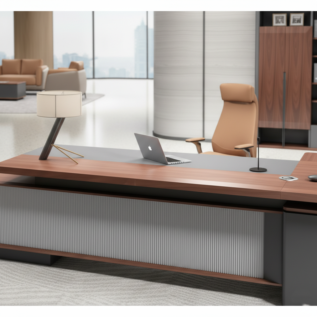 ডিরেক্টর এল-শেপ অফিস টেবিল আধুনিক ডেস্ক ড্রয়ার, রিভার্সিবল ওরিয়েন্টেশন, সিপিইউ স্টোরেজ এবং ওয়্যার ম্যানেজমেন্ট সহ পার্টিকেল বোর্ডে তৈরি