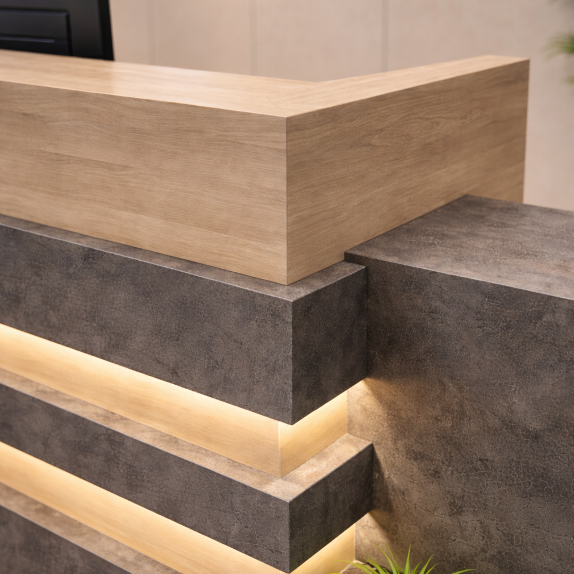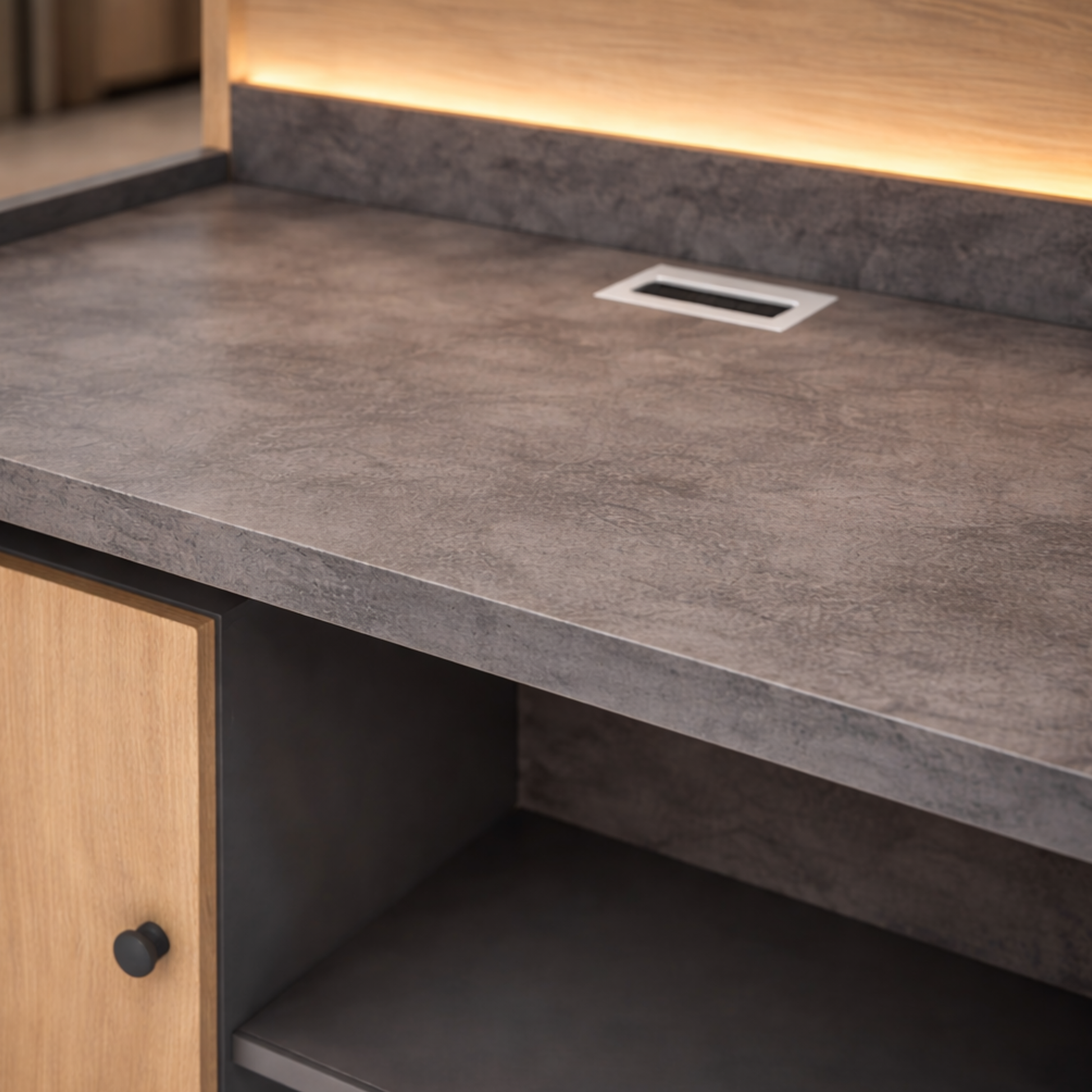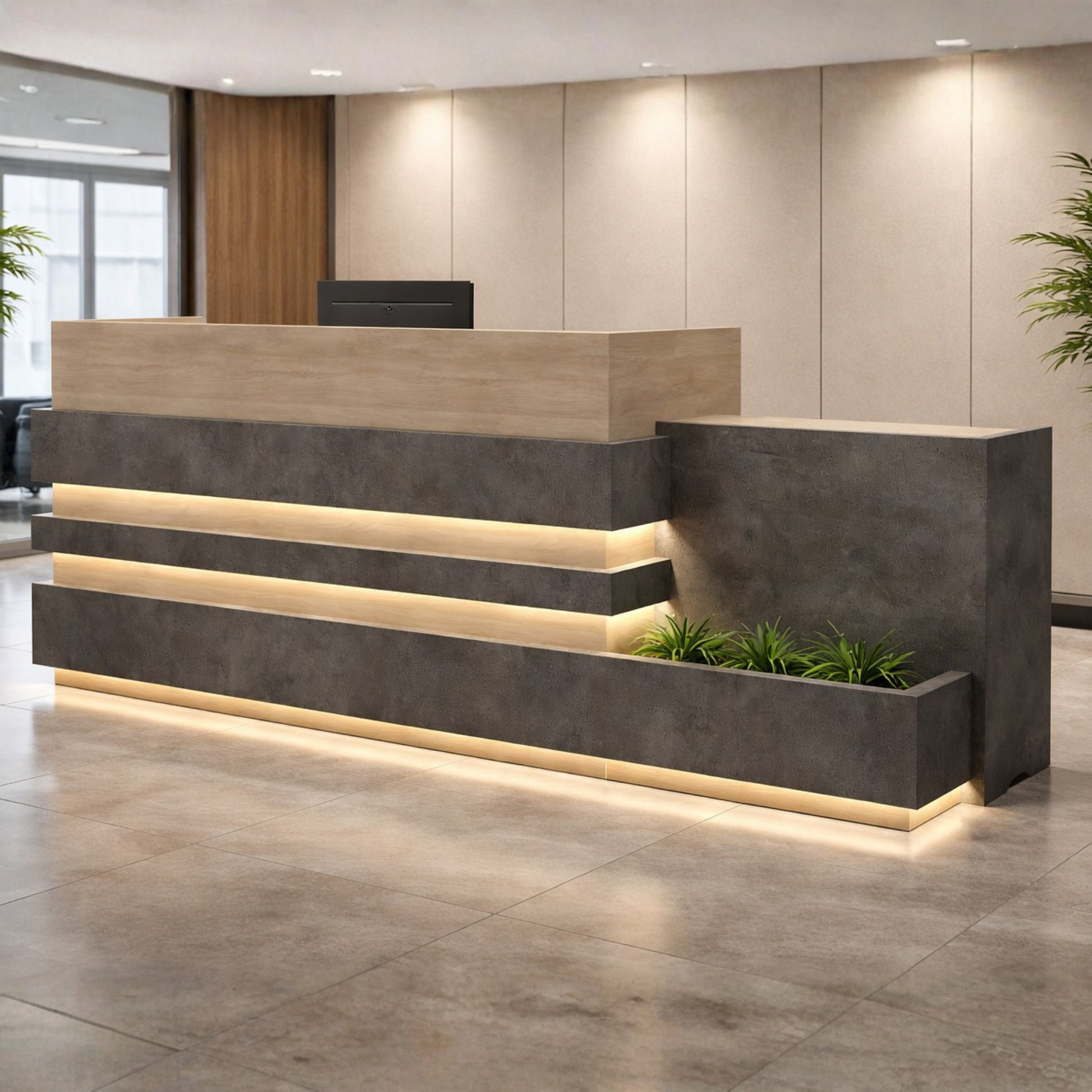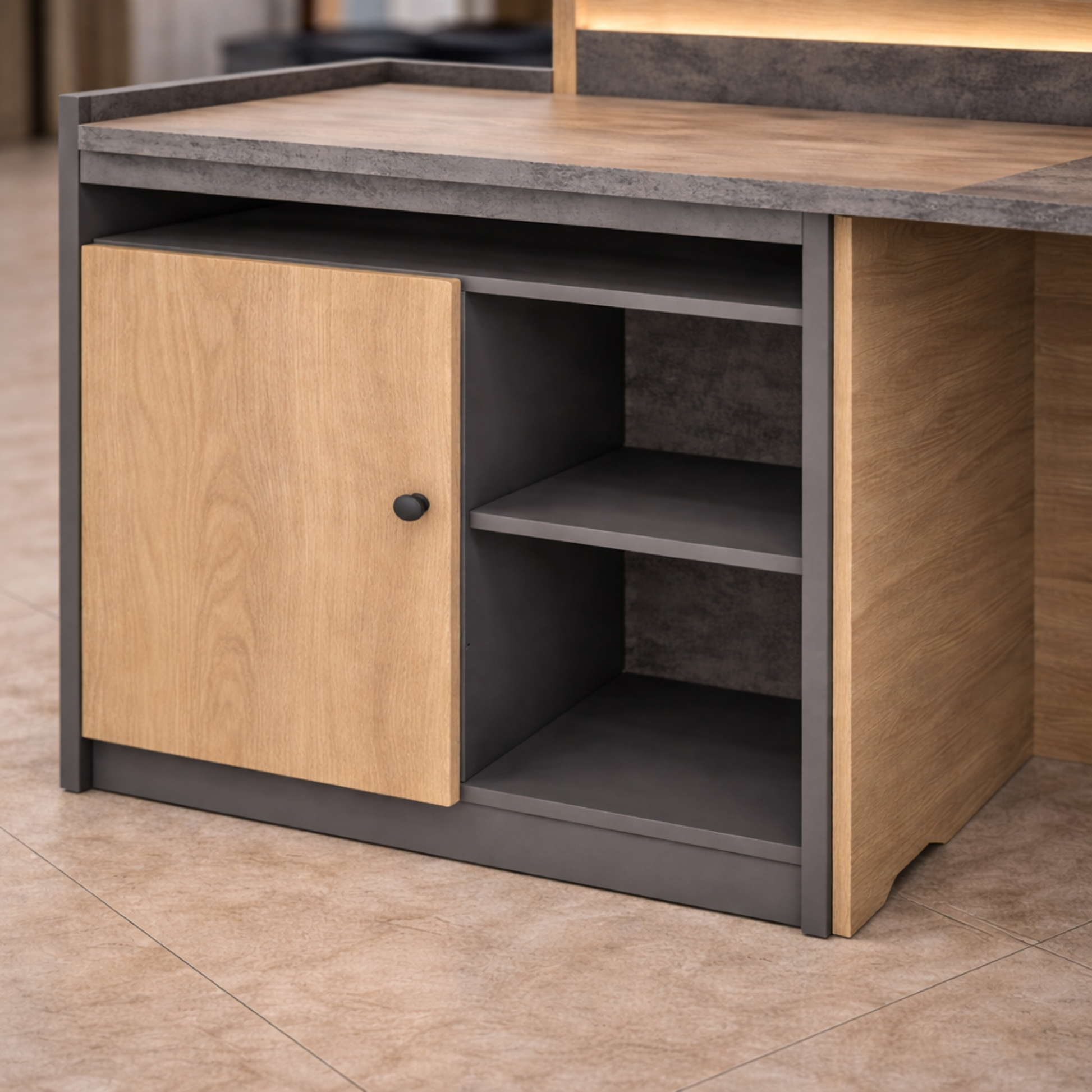 অফিসের জন্য আধুনিক অভ্যর্থনা টেবিল মেলামাইন এবং ১টি ক্যাবিনেট এবং স্টোরেজ দিয়ে তৈরি - আখরোট এবং কার্বন ধূসর