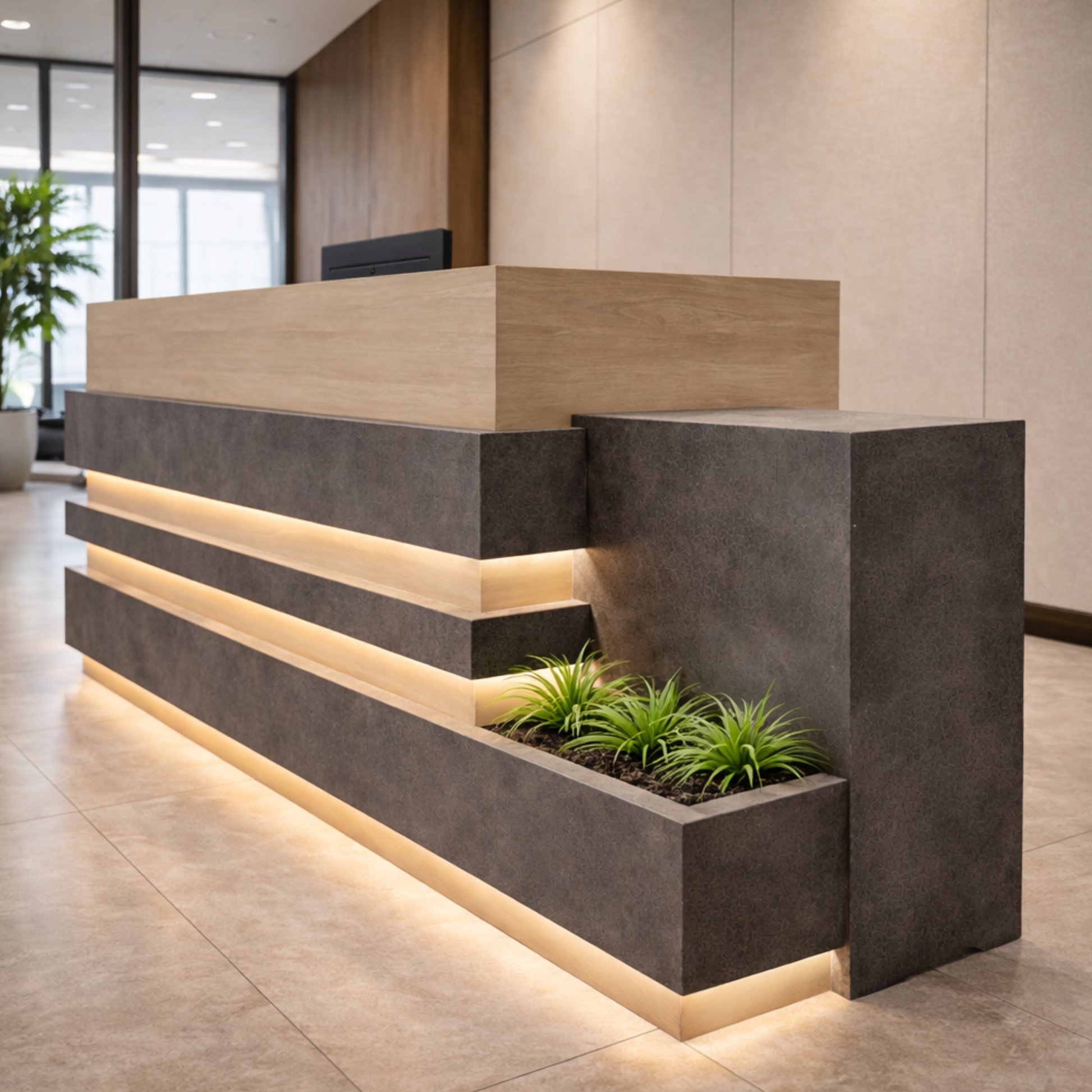 বৈশিষ্ট্য: ১টি ড্রয়ার স্টোরেজ এবং খোলার যোগ্য বাক্স সহ অভ্যর্থনা টেবিল, তারের ব্যবস্থাপক, তাক লাগানোর জায়গা সহ ১টি ক্যাবিনেট এবং LED লাইট অন্তর্ভুক্ত।
