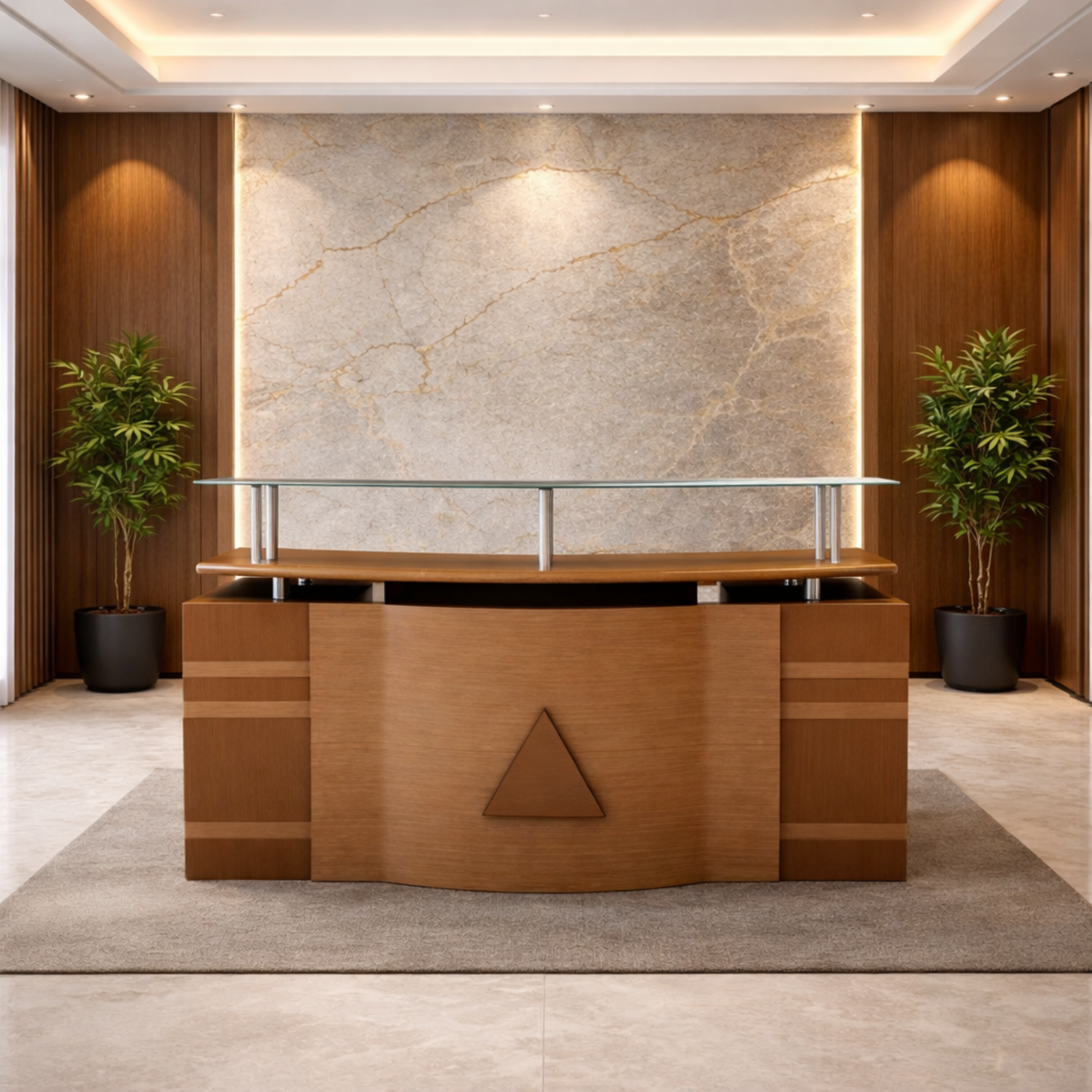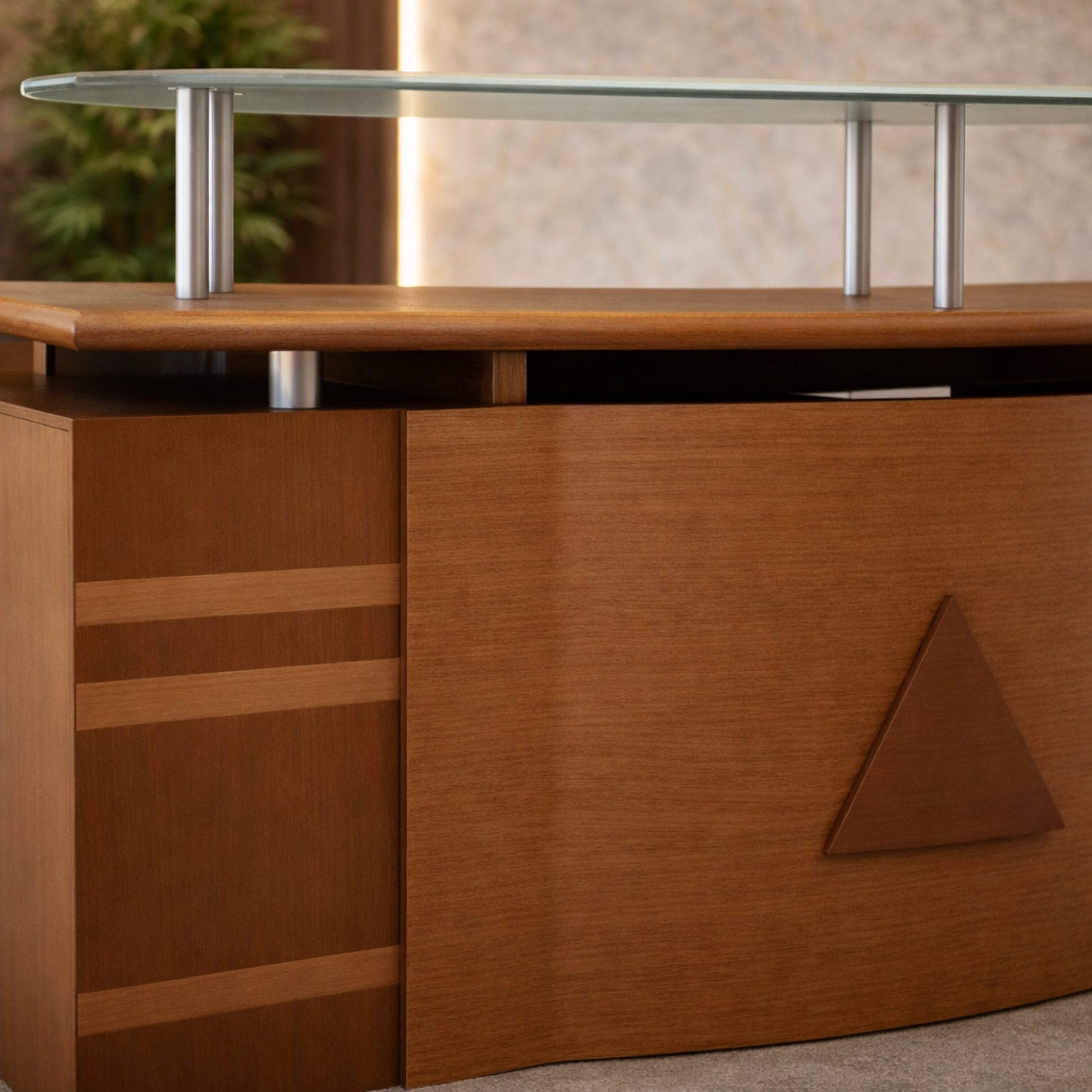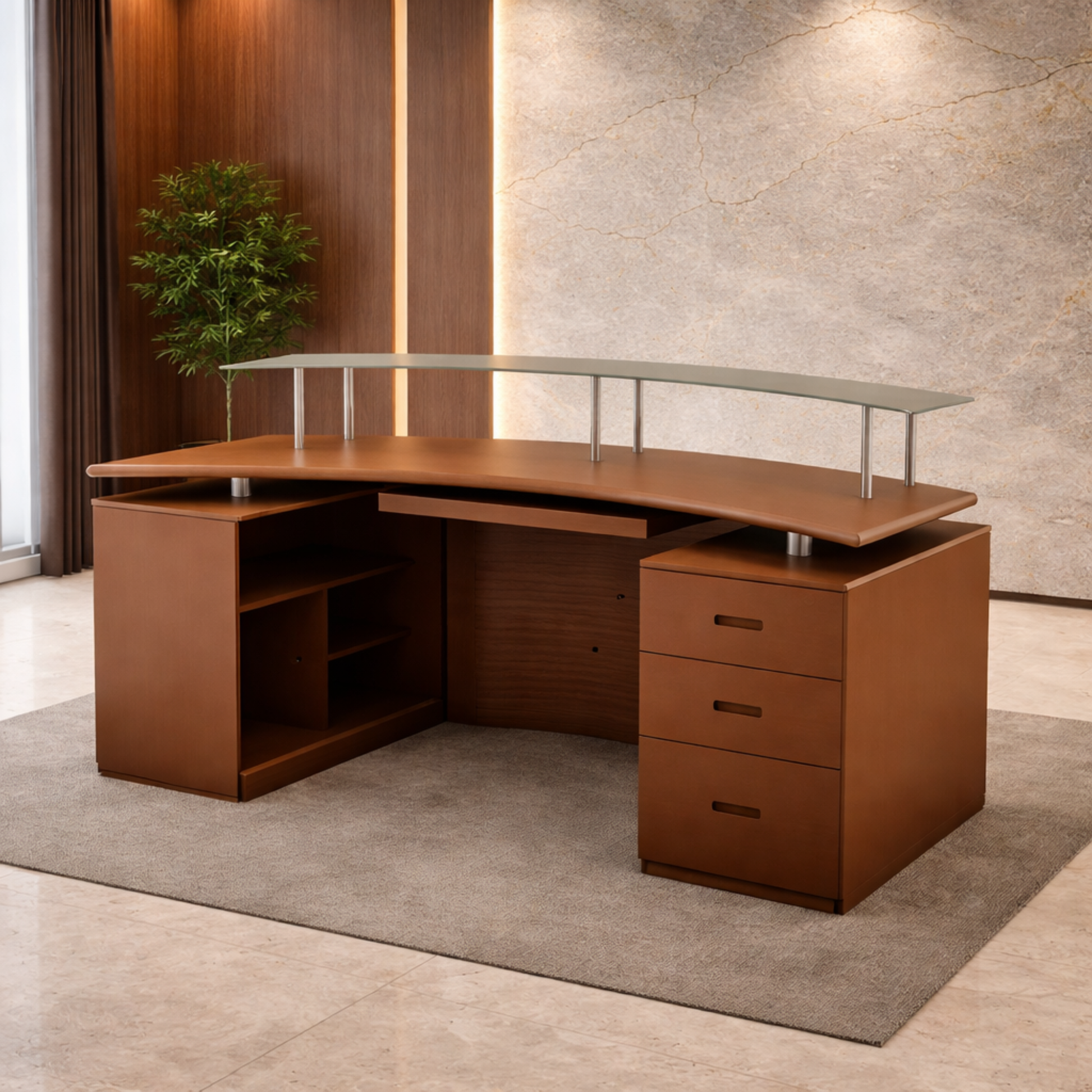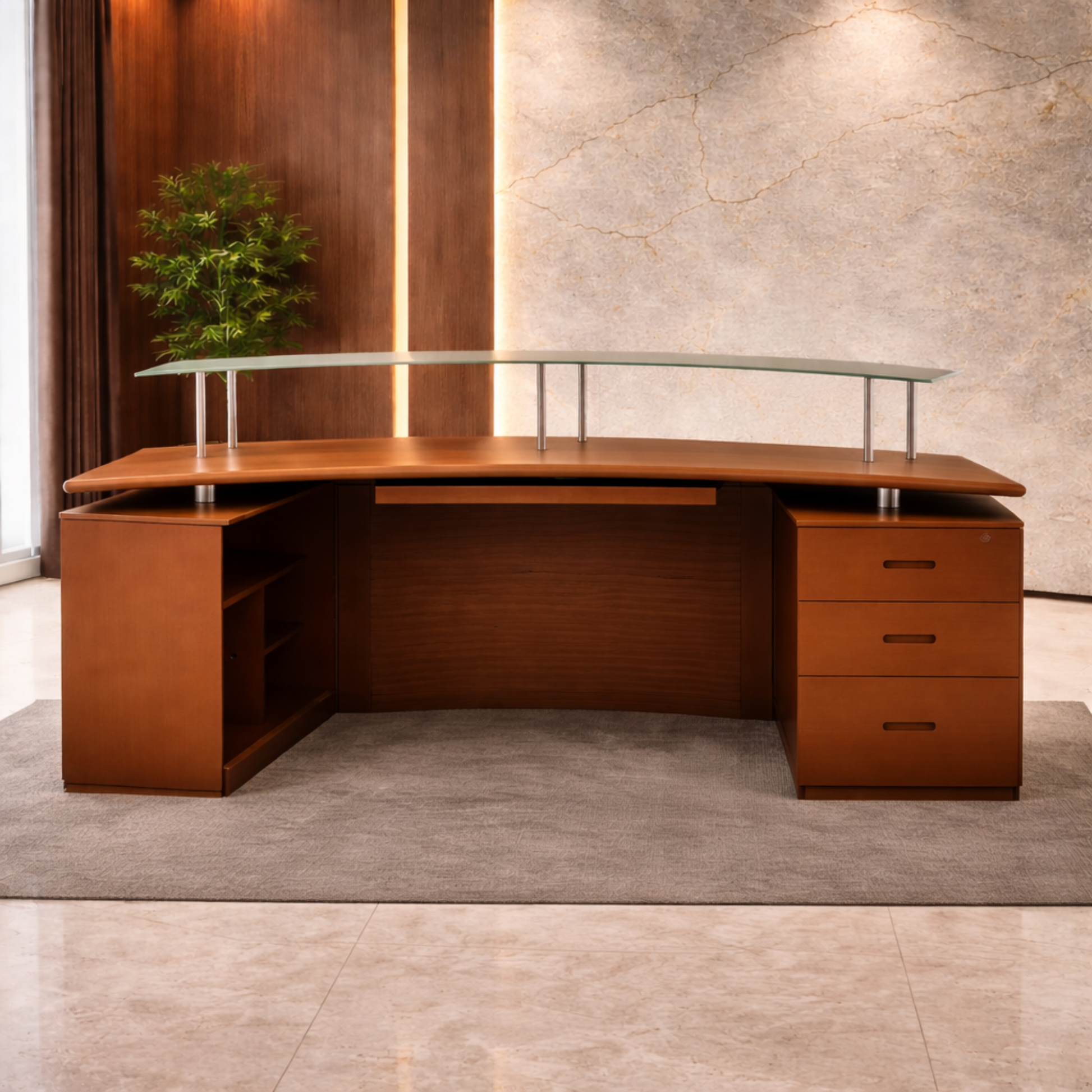 ফাইল স্টোরেজ ক্যাবিনেট, এলিভেটেড শেল্ফ এবং কাচের টপ শেল্ফ সহ প্লাই বোর্ডে তৈরি রিসেপশন টেবিল - ব্রাউন
