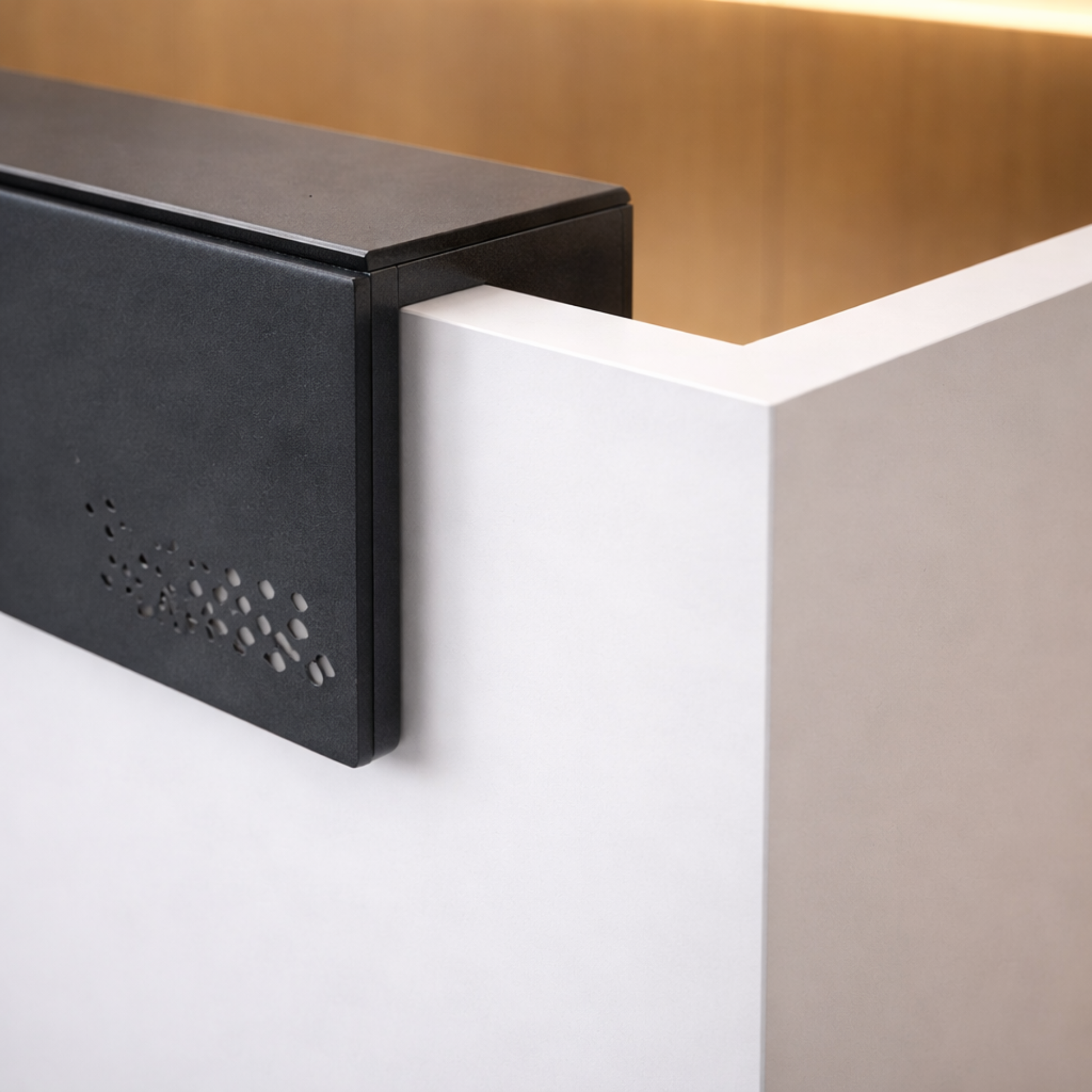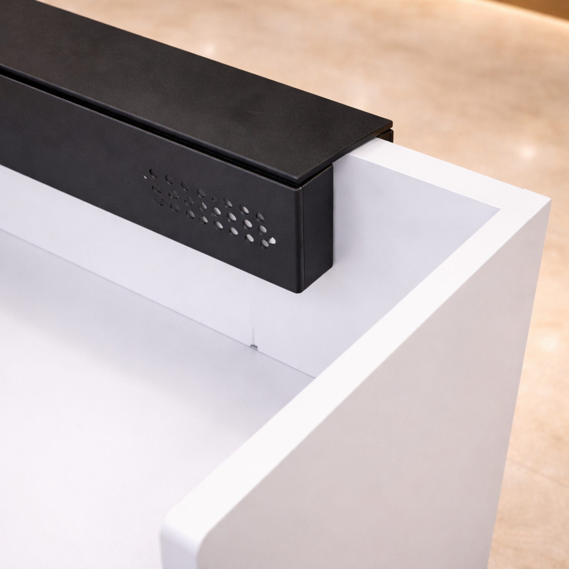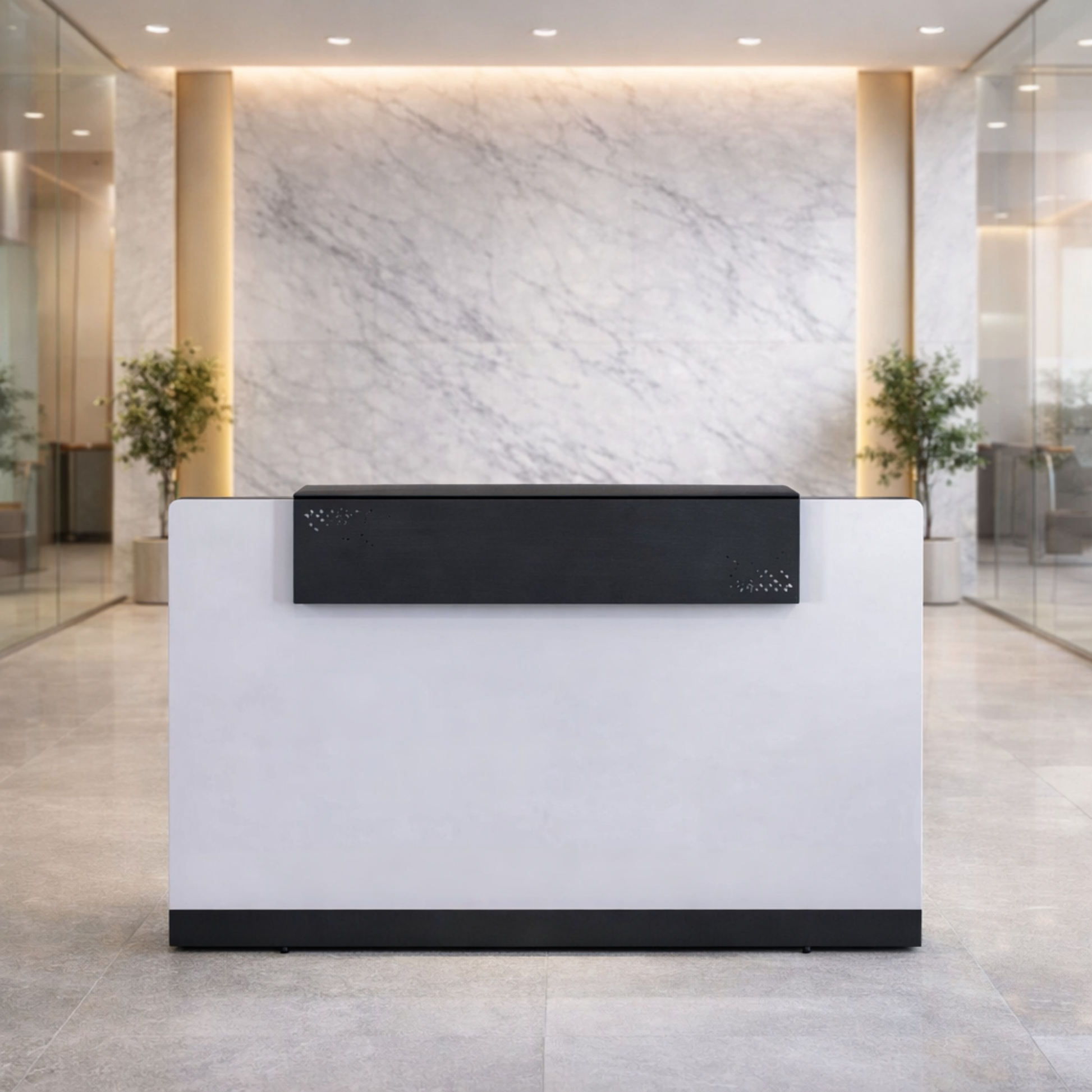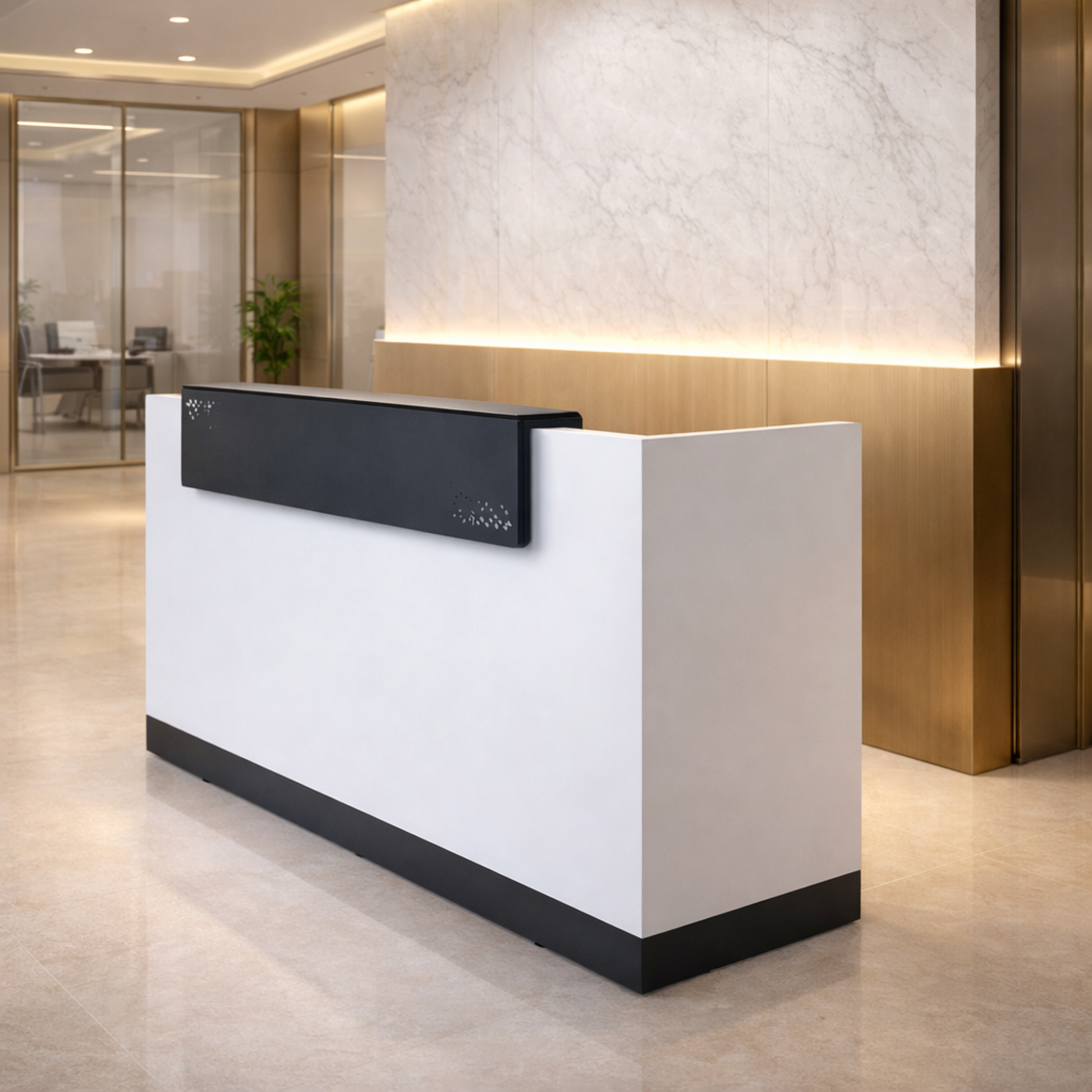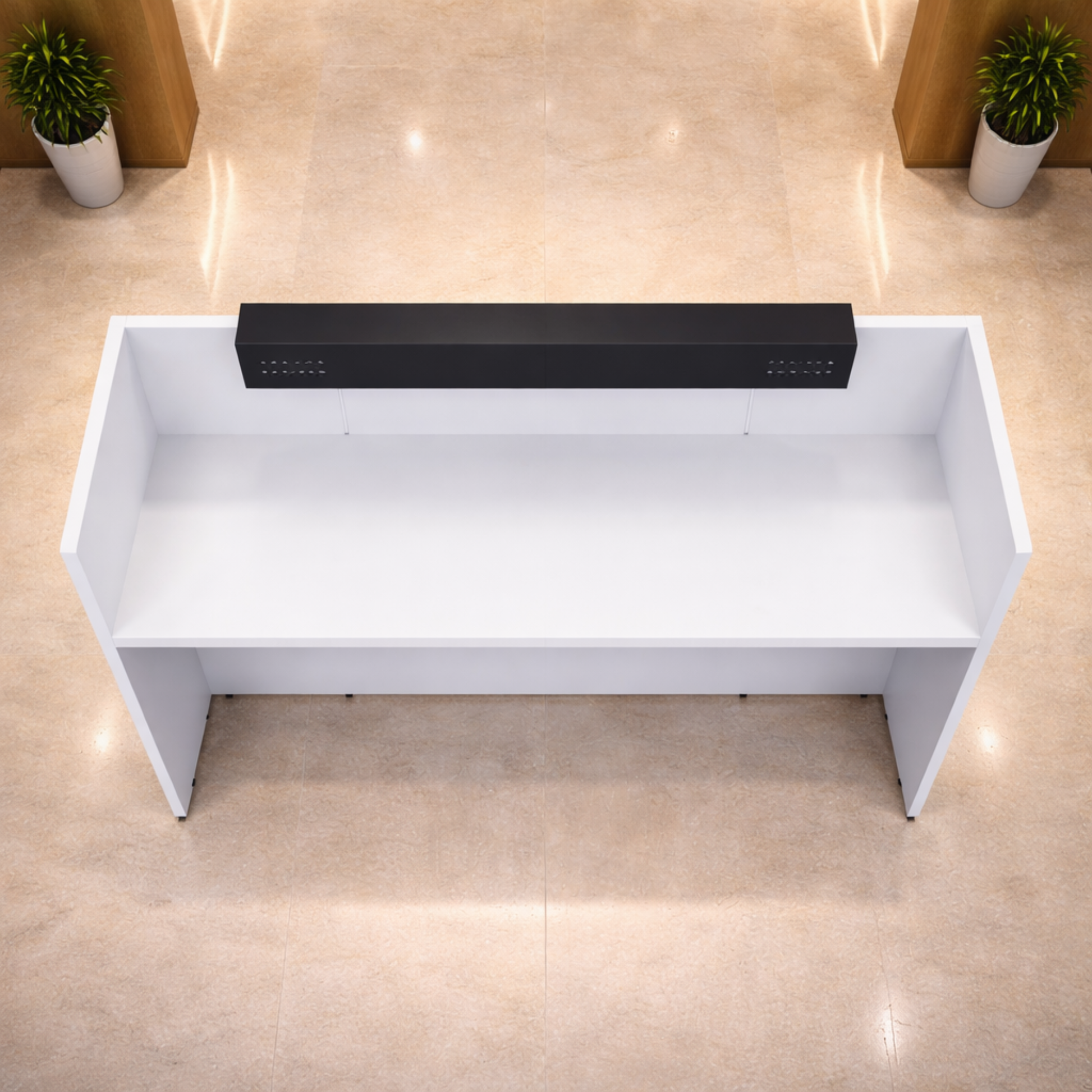 অফিস এবং হোটেলের ফ্রন্ট ডেস্কের জন্য অভ্যর্থনা টেবিল, তারযুক্ত ম্যানেজার সহ ইঞ্জিনিয়ারড কাঠ এবং কালো পাউডার লেপা কিক প্লেটে তৈরি - কালো এবং সাদা