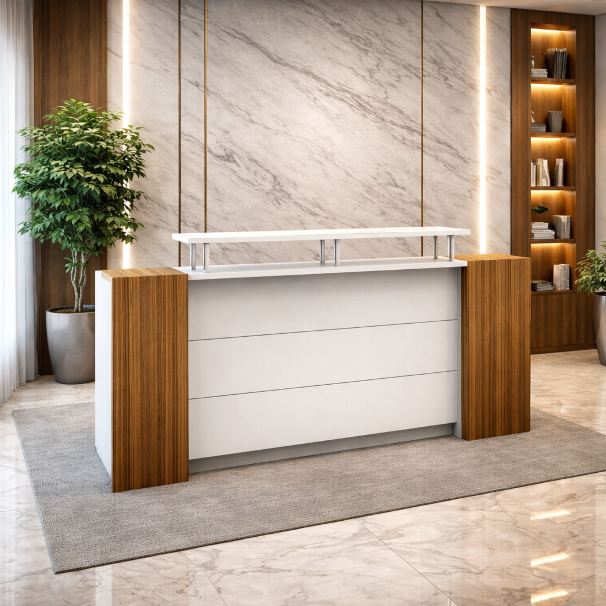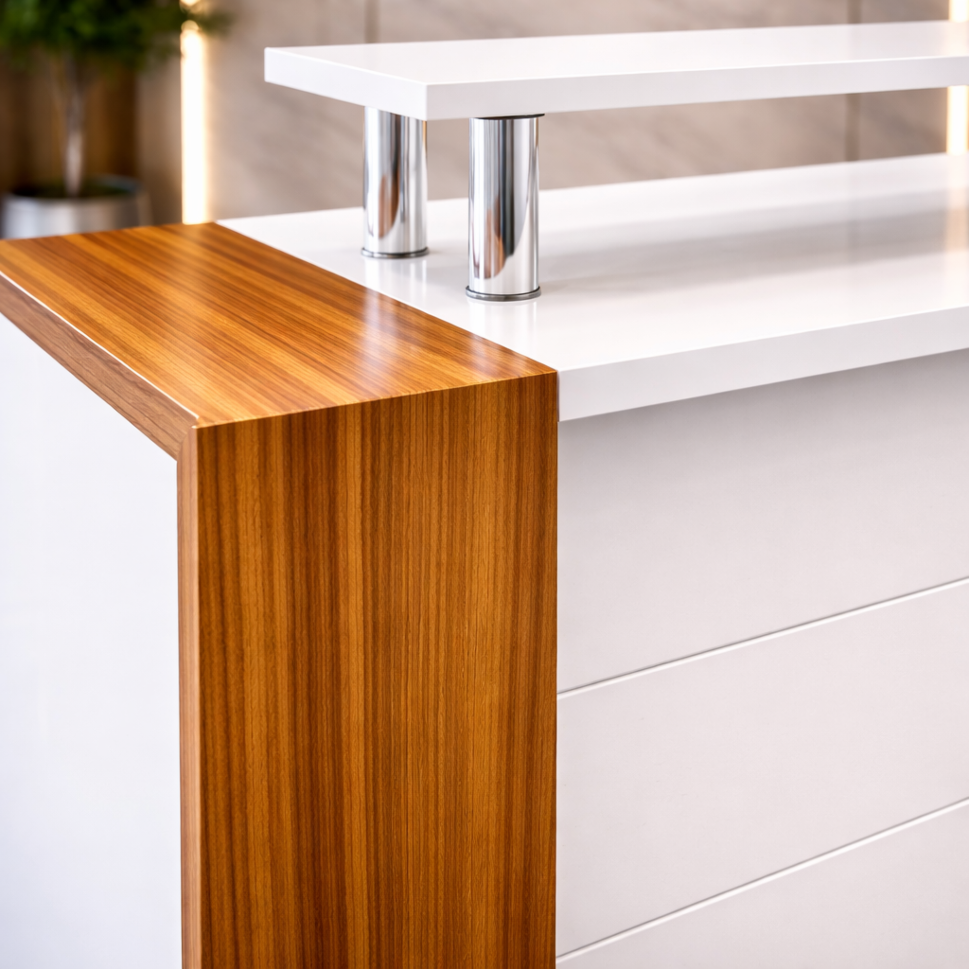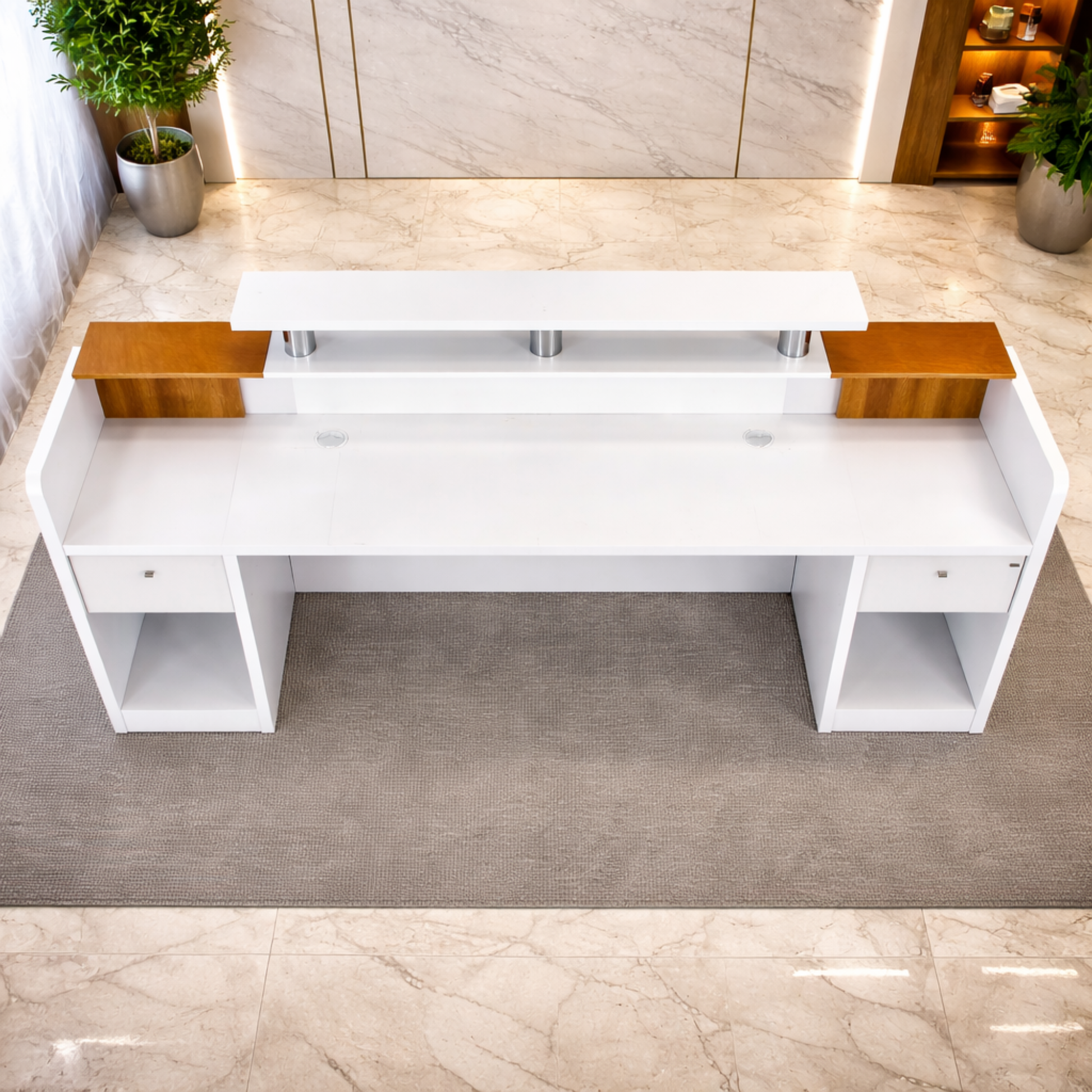 অফিস এবং হোটেলের ফ্রন্ট ডেস্কের জন্য অভ্যর্থনা টেবিল ইঞ্জিনিয়ারড কাঠ দিয়ে তৈরি, সাদা ল্যামিনেট সহ 1টি লকযোগ্য ড্রয়ার এবং শাটার ইউনিট - বাদামী এবং সাদা