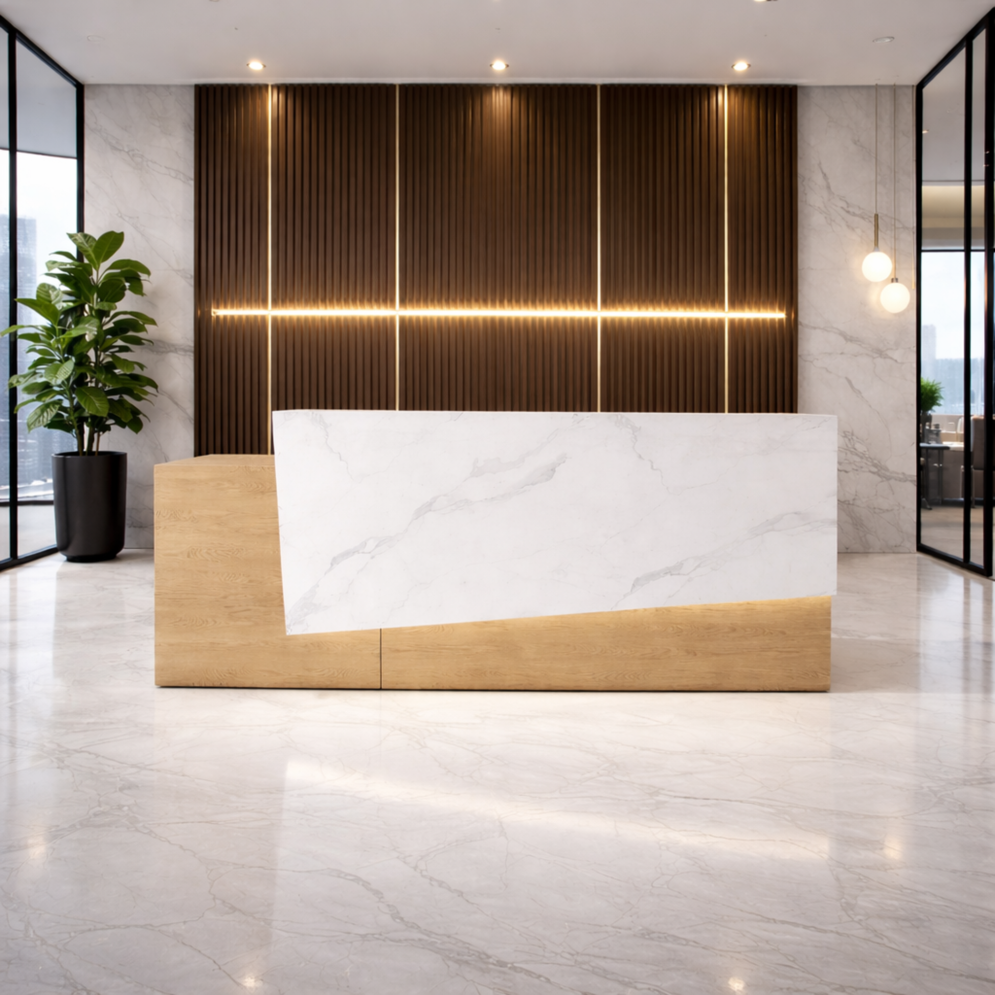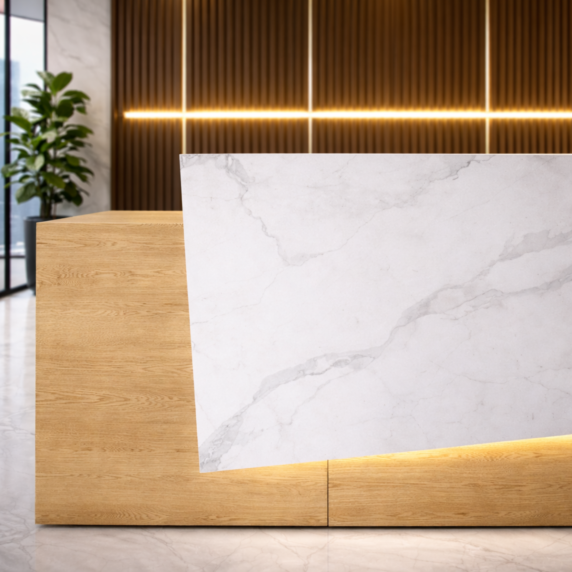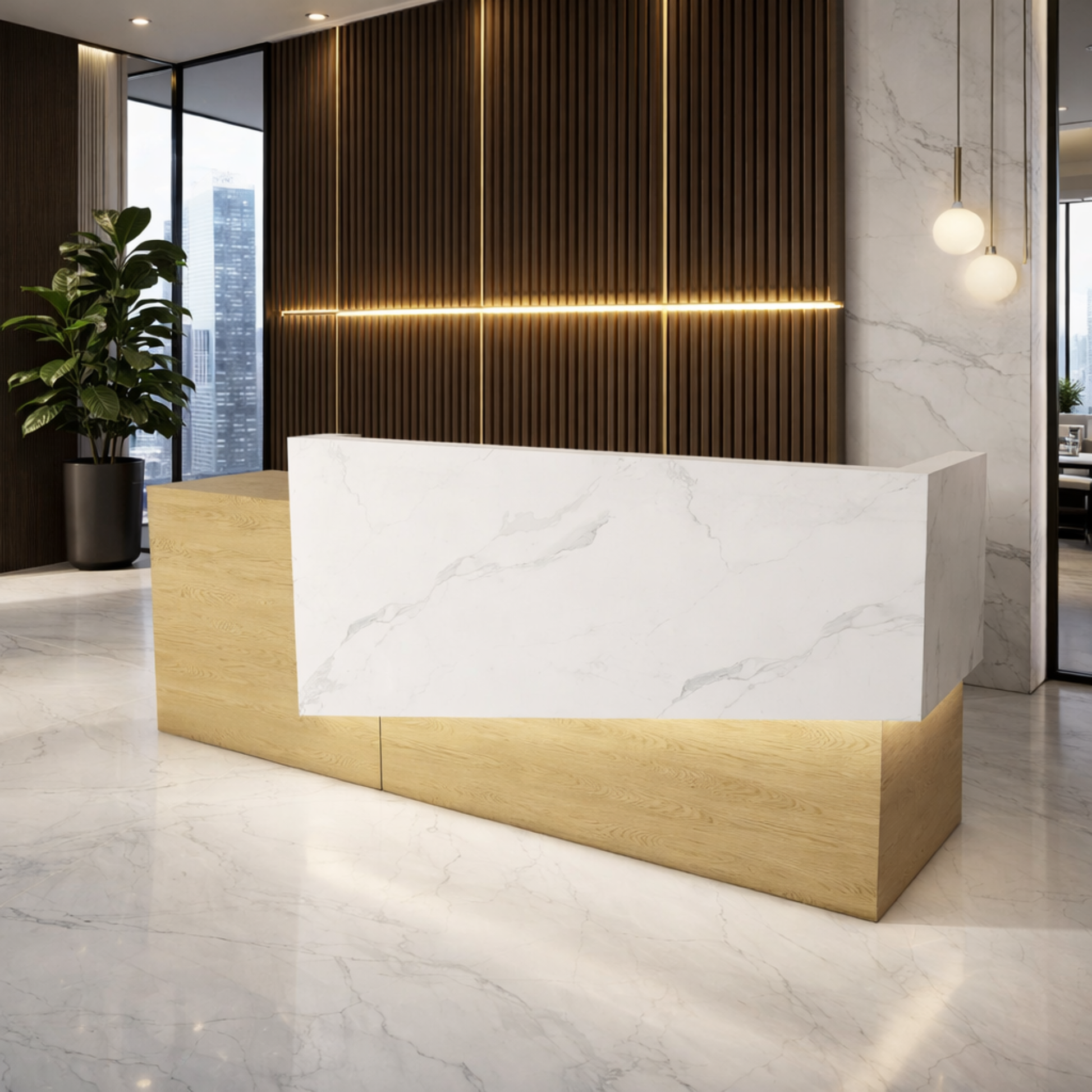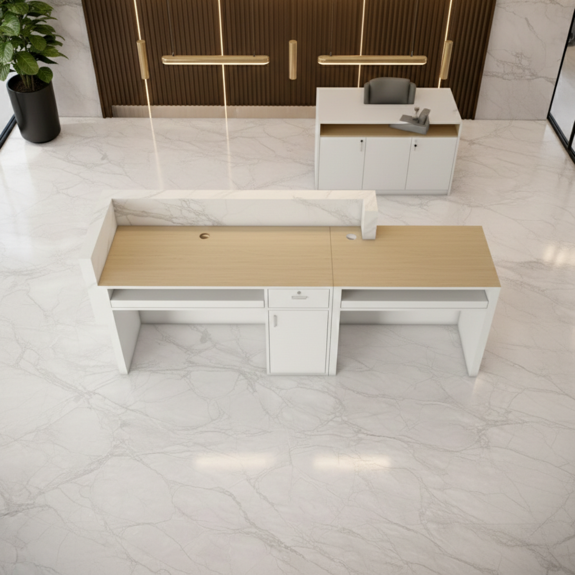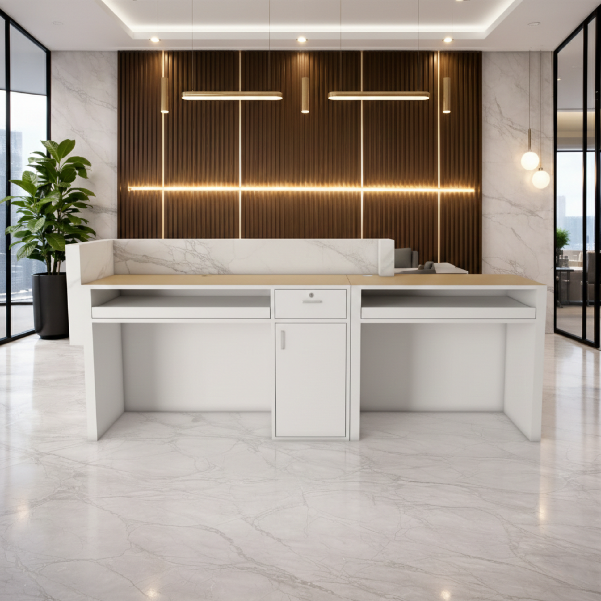 অফিসের জন্য বিলাসবহুল আধুনিক কাউন্টারের জন্য অভ্যর্থনা টেবিল মার্বেল প্যাটার্ন এবং ওয়্যার ম্যানেজার কীবোর্ড ট্রে এবং মাল্টি স্টোরেজ সহ MDF দিয়ে তৈরি স্টাইলিশ ডিজাইন - সাদা এবং বাদামী