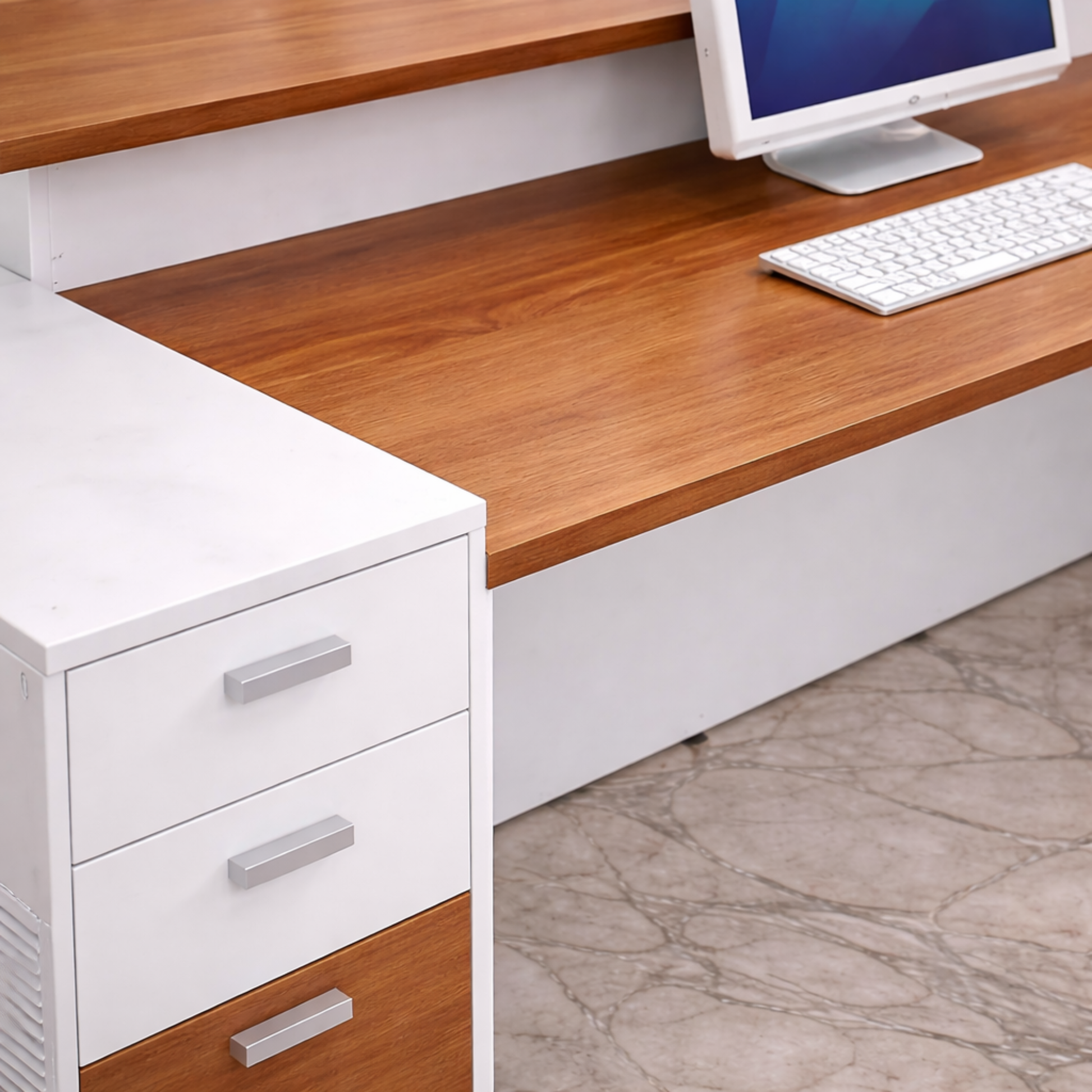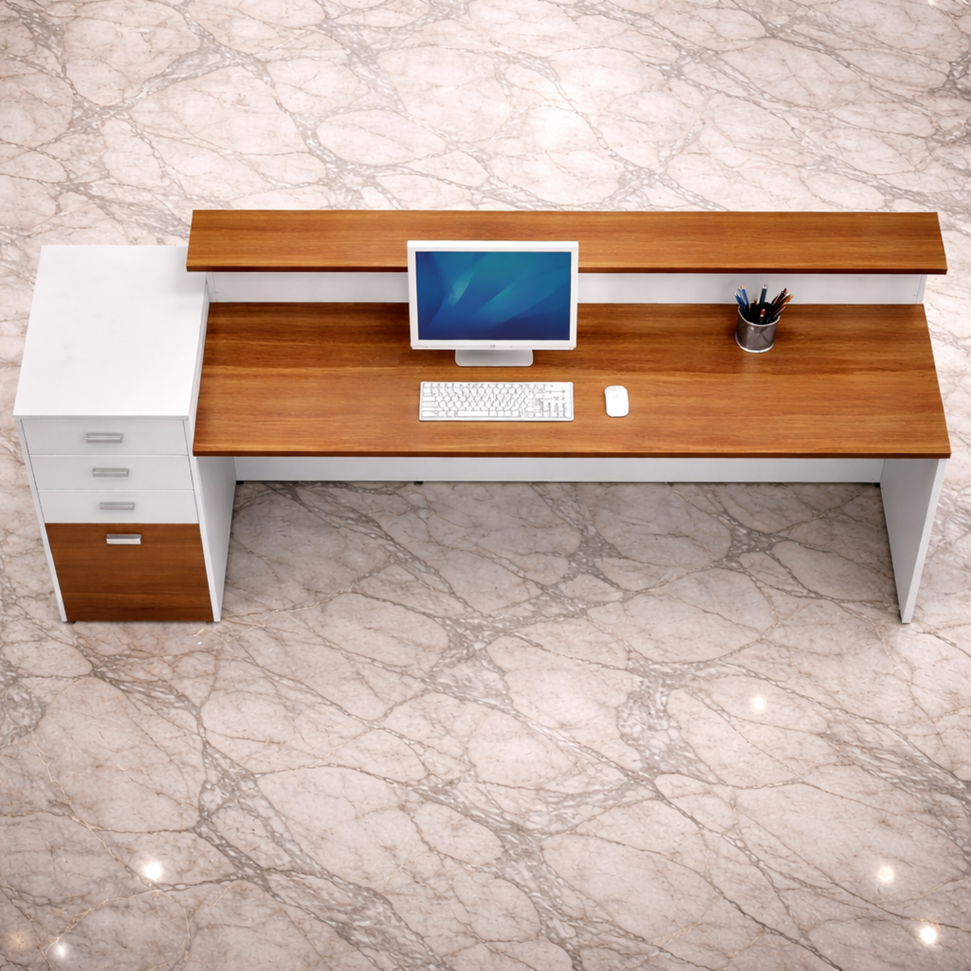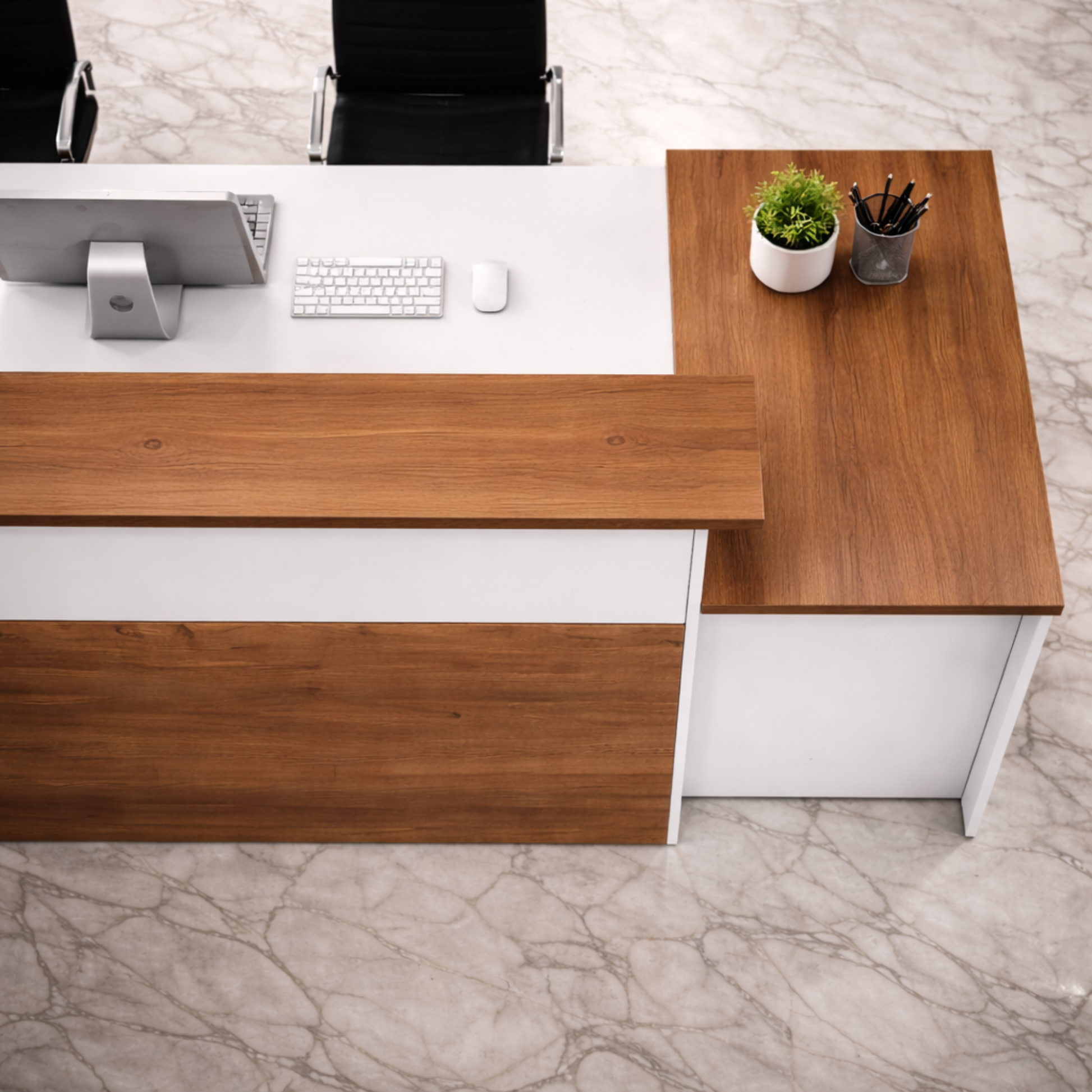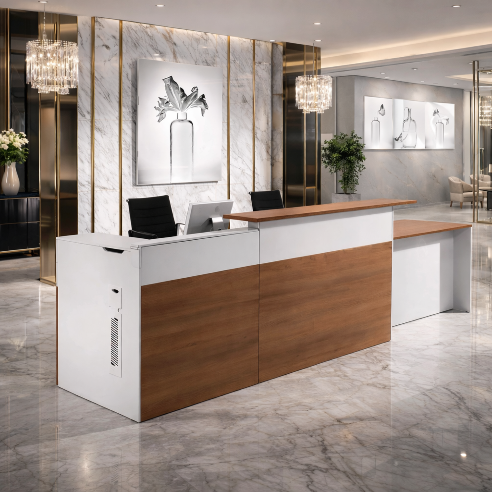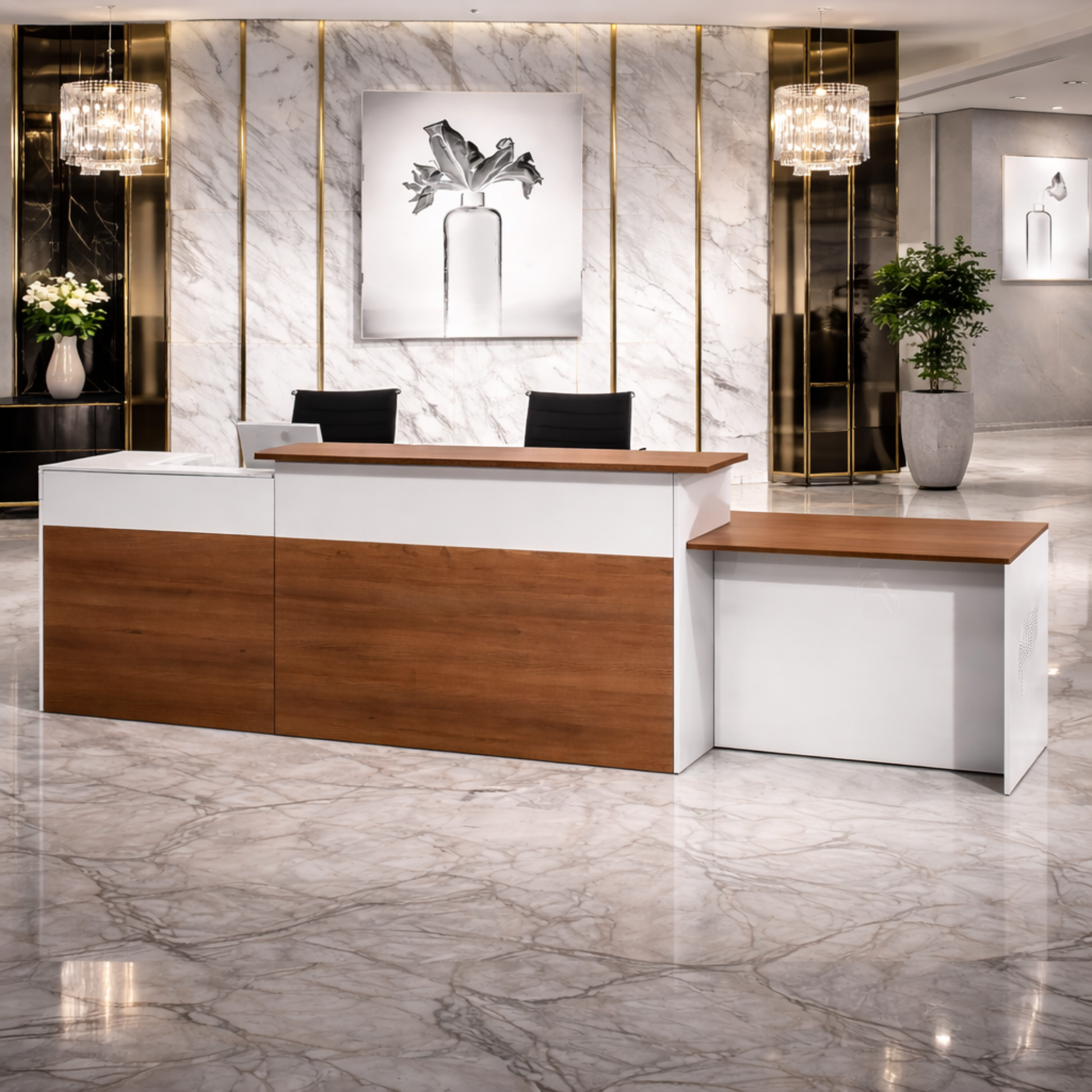 ইঞ্জিনিয়ারড কাঠ এবং ল্যামিনেটে তৈরি অভ্যর্থনা টেবিল একটি দুর্দান্ত, অত্যন্ত টেকসই উপাদান এবং প্রিমিয়াম আসবাবপত্রের জন্য একটি বিশ্বমানের