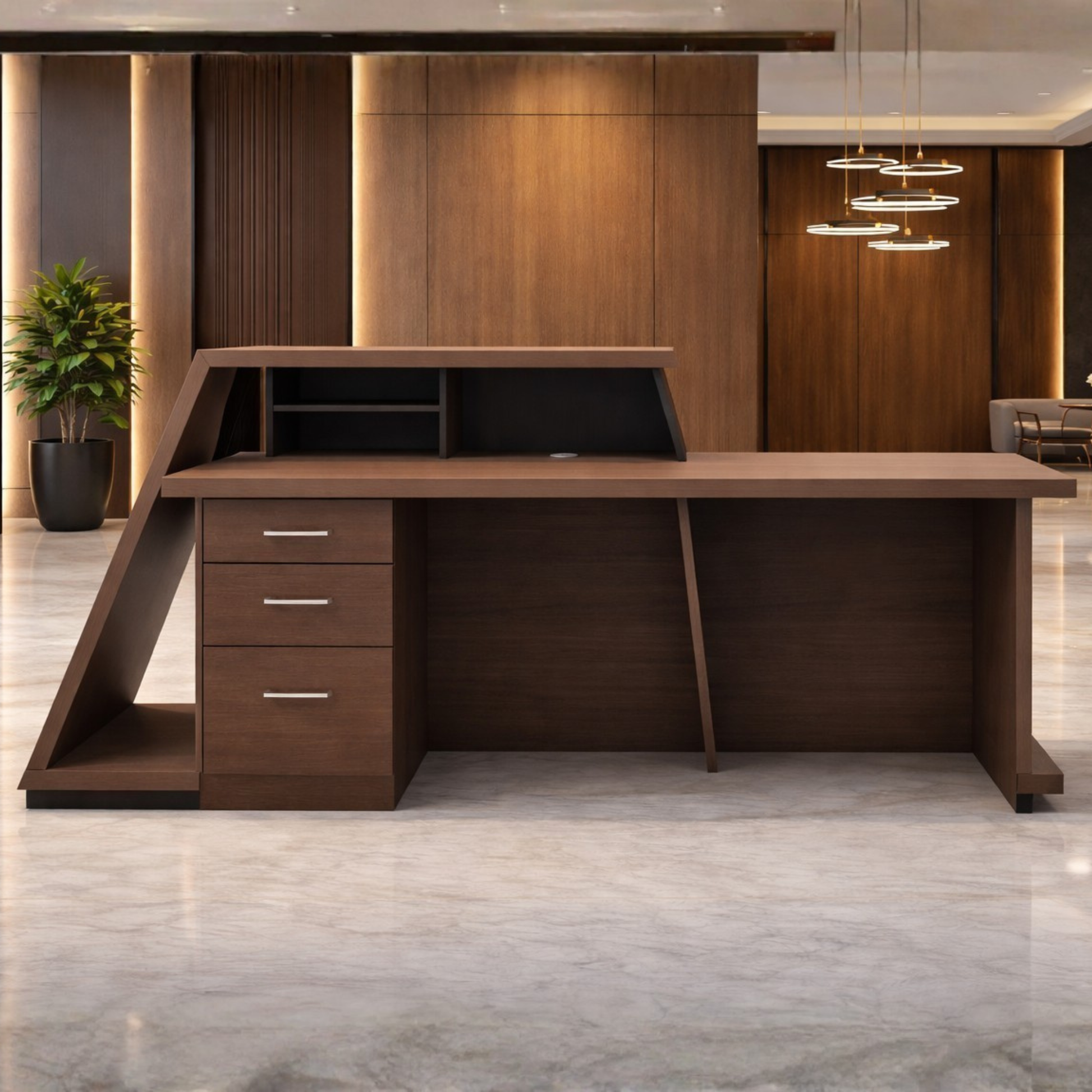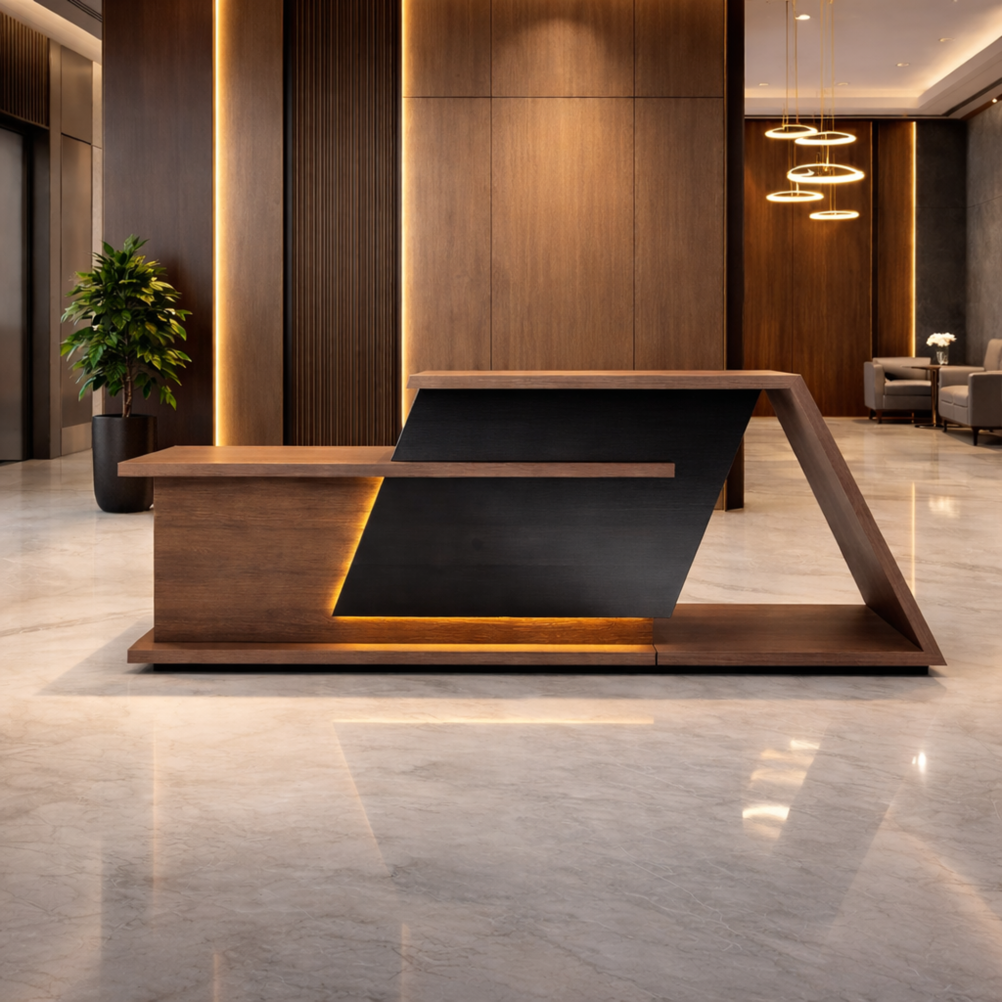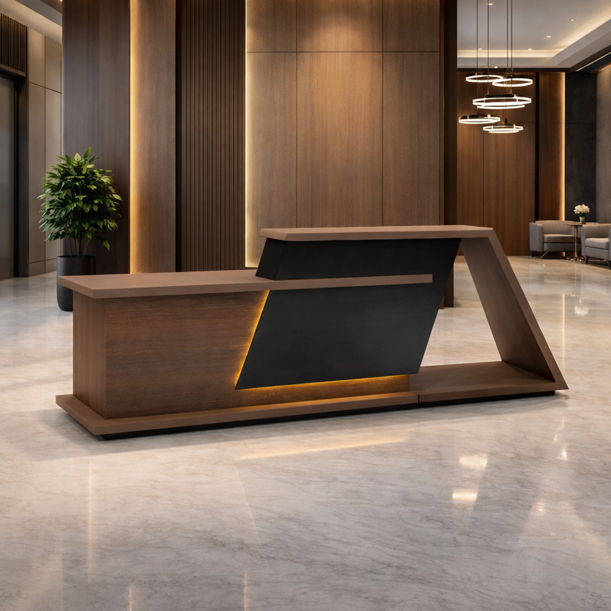 ইঞ্জিনিয়ারড কাঠ দিয়ে তৈরি রিসেপশন টেবিলটি আখরোট, চকচকে কালো এবং কর্দমাক্ত ধূসর ল্যামিনেটের সমন্বয়ে তৈরি। অন্তর্নির্মিত ওয়্যার ম্যানেজমেন্ট গ্রোমেট দিয়ে ডিজাইন করা হয়েছে।