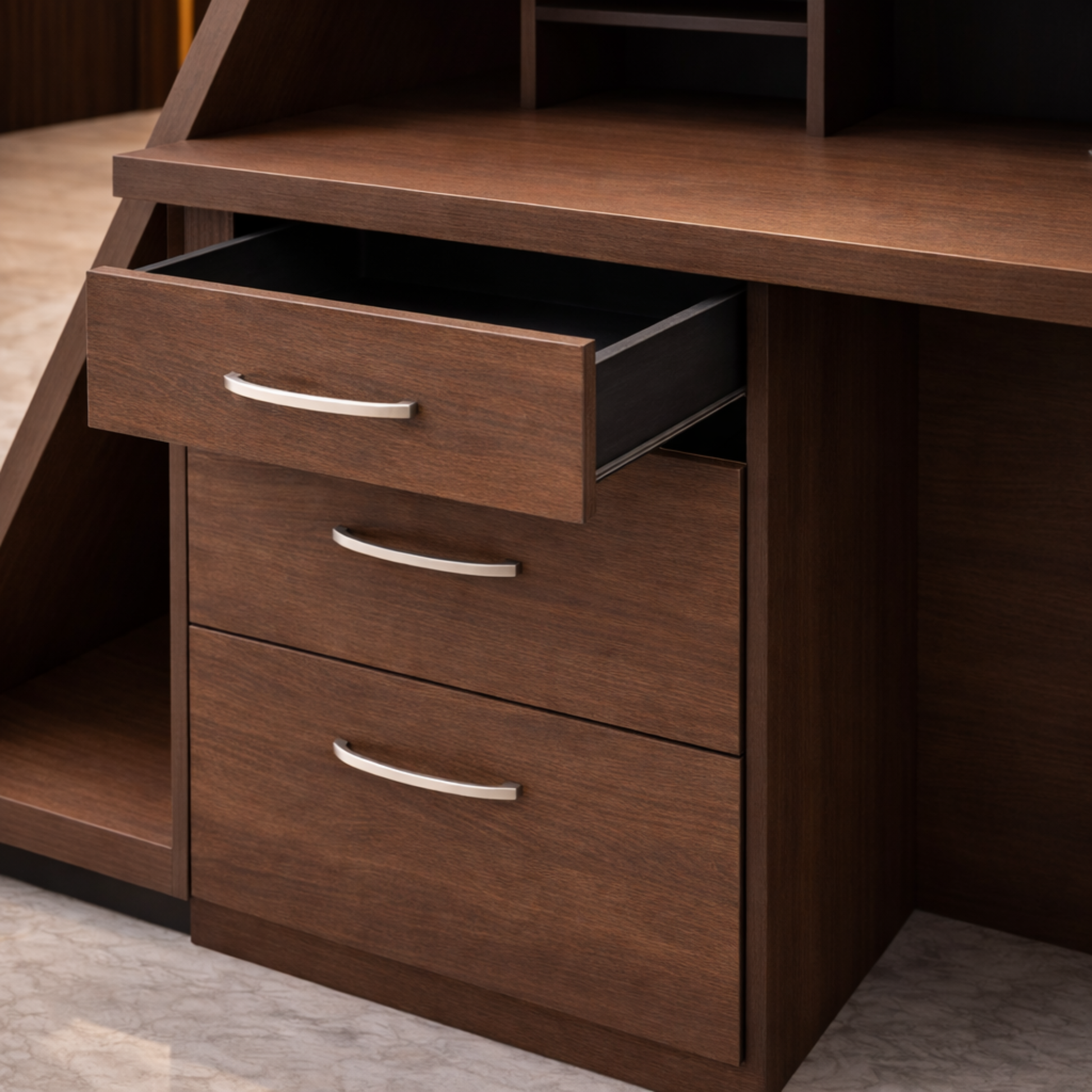 ইঞ্জিনিয়ারড কাঠ দিয়ে তৈরি অভ্যর্থনা টেবিলটি আখরোট, চকচকে কালো এবং কর্দমাক্ত ধূসর ল্যামিনেটের সংমিশ্রণে তৈরি। অন্তর্নির্মিত ওয়্যার ম্যানেজমেন্ট গ্রোমেট দিয়ে ডিজাইন করা হয়েছে