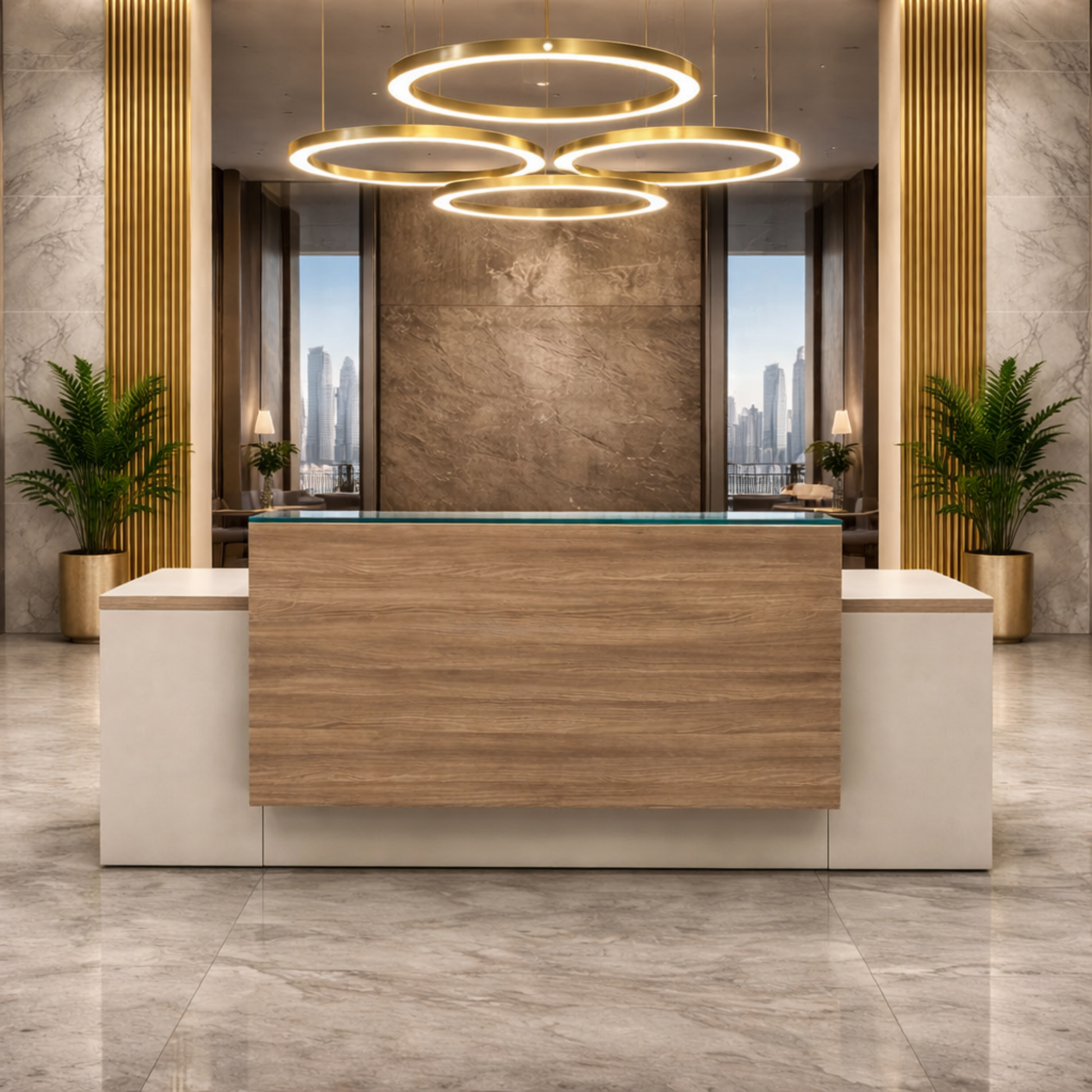বৈশিষ্ট্য: অভ্যর্থনা টেবিল - ২ জনের আসনের কাউন্টার এবং খোলা যায় এমন শাটার এবং ক্যাবিনেট