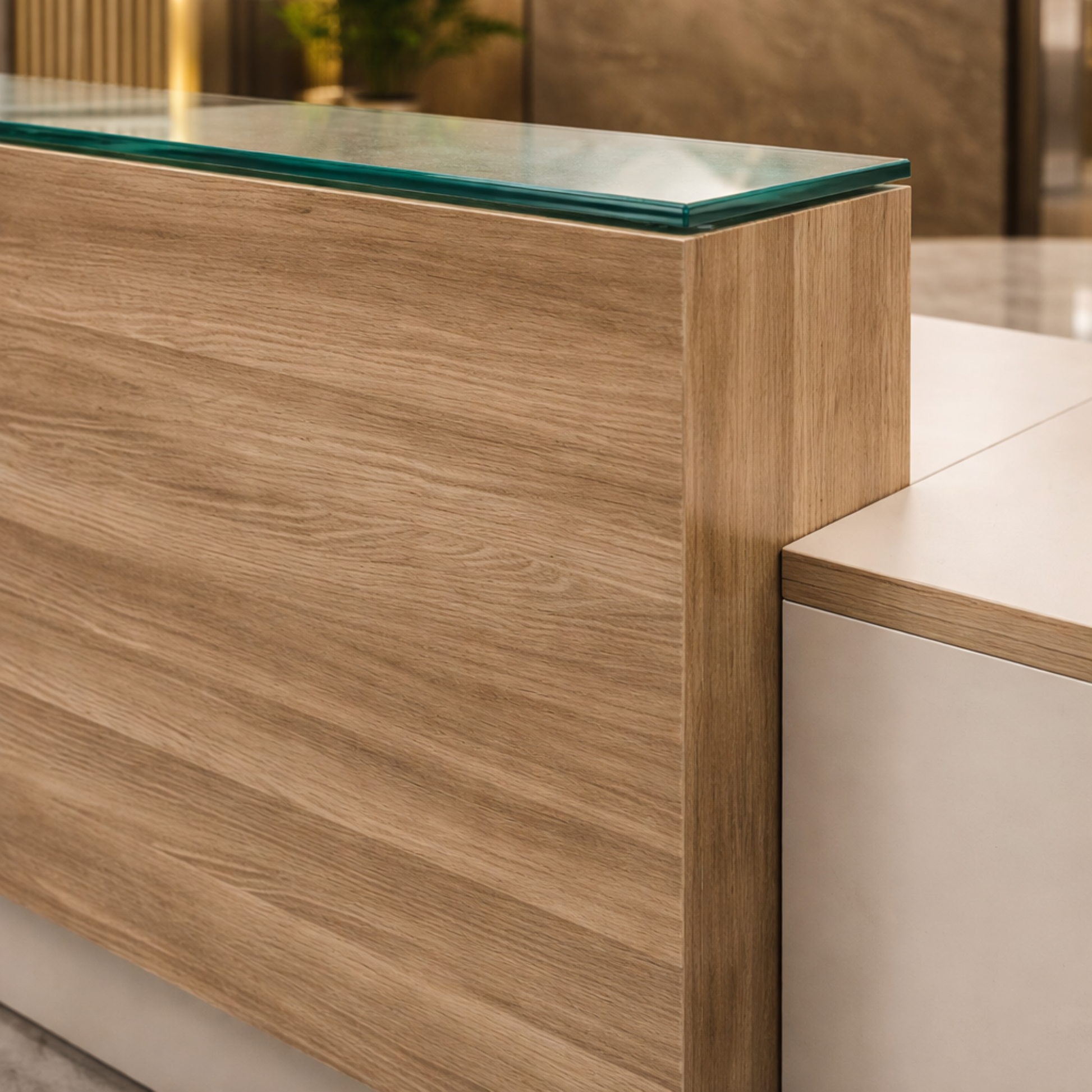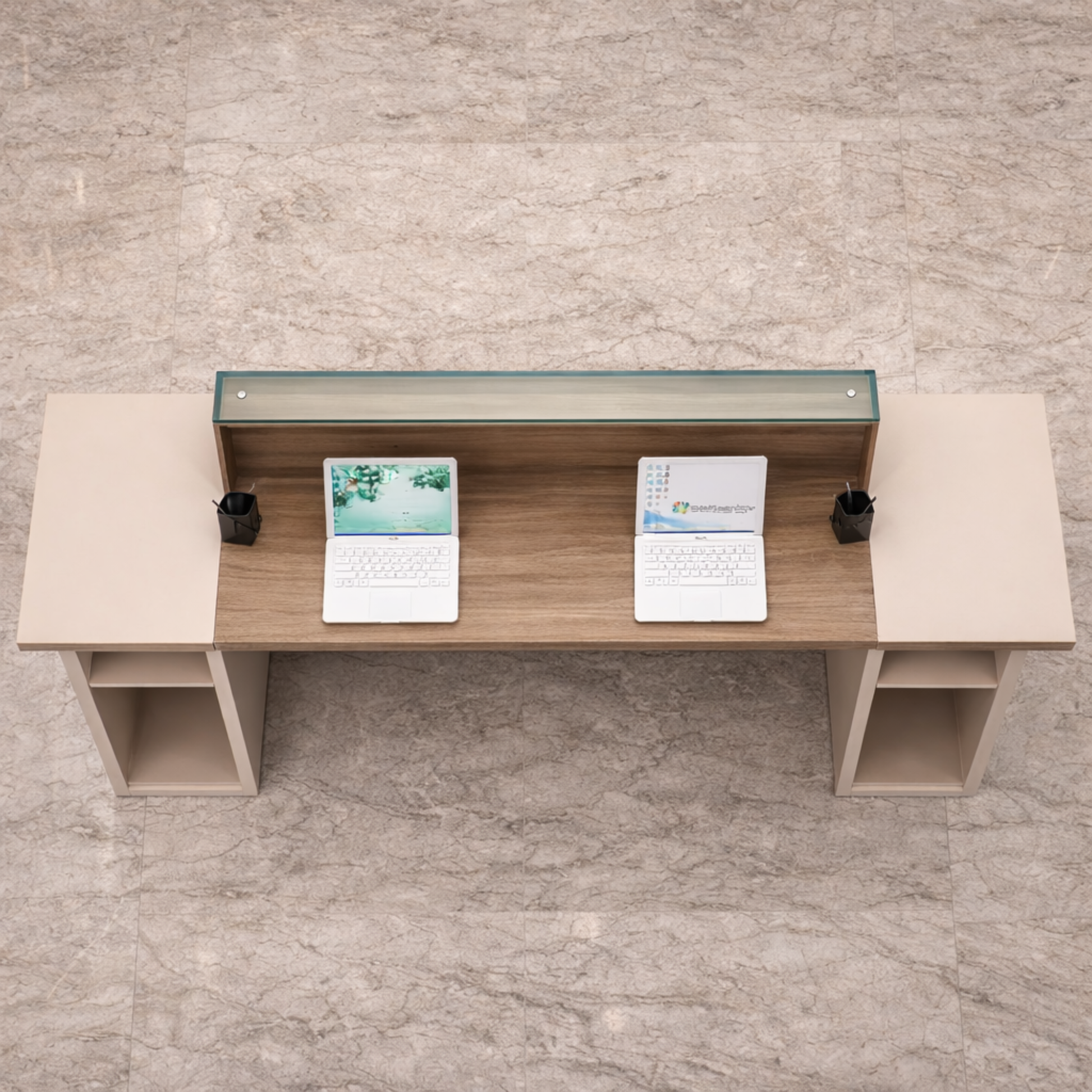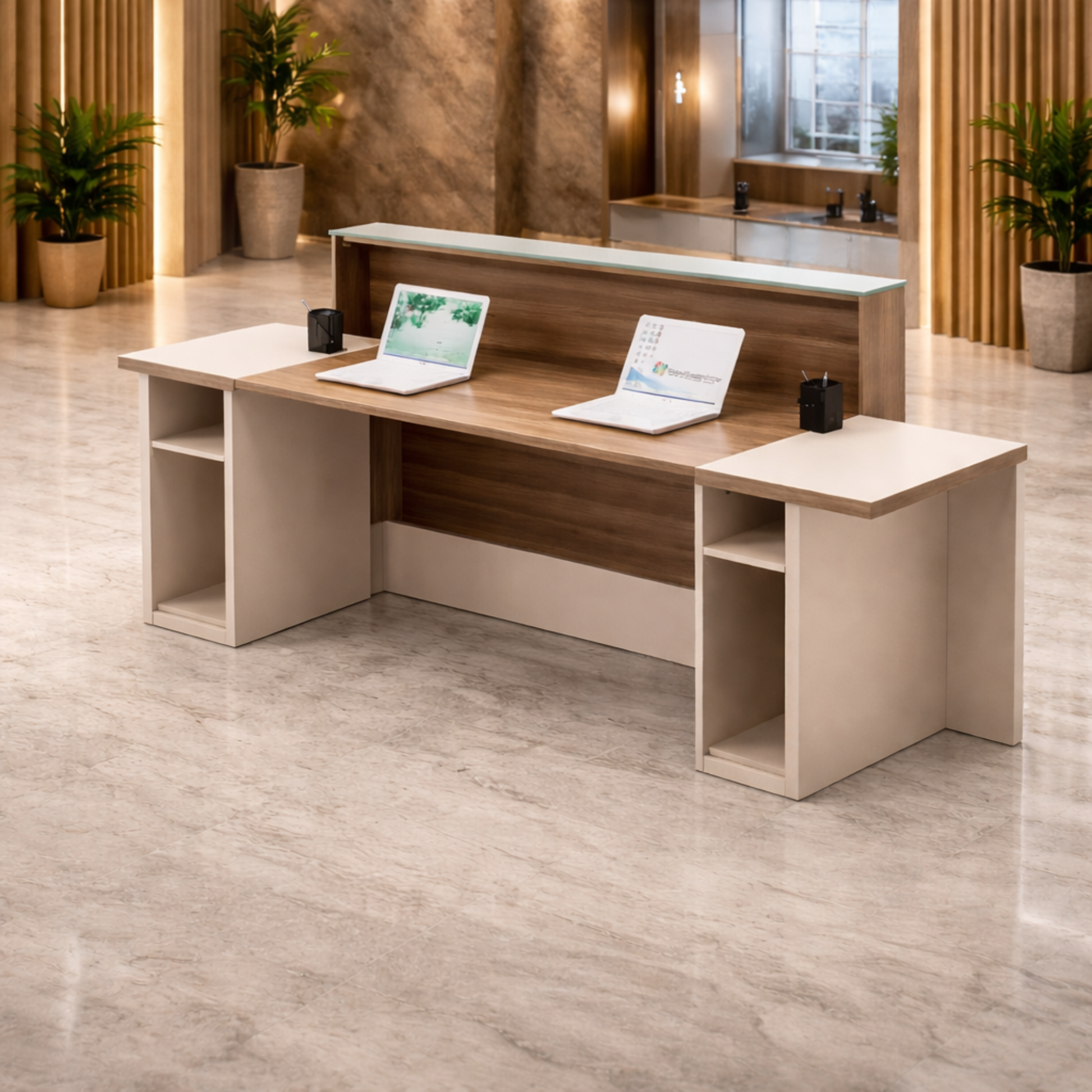 অফিসের জন্য স্টাইলিশ বড় রিসেপশন টেবিল, মেলামাইন দিয়ে তৈরি, ২ জনের আসনের কাউন্টার এবং খোলা যায় এমন শাটার এবং ক্যাবিনেট - হালকা আখরোট