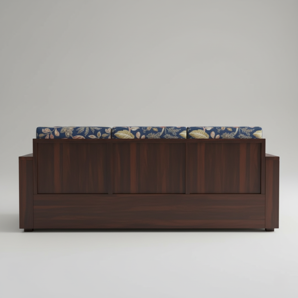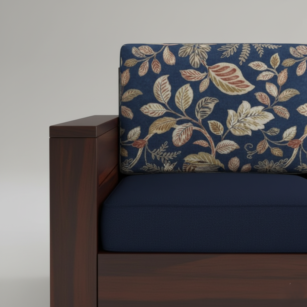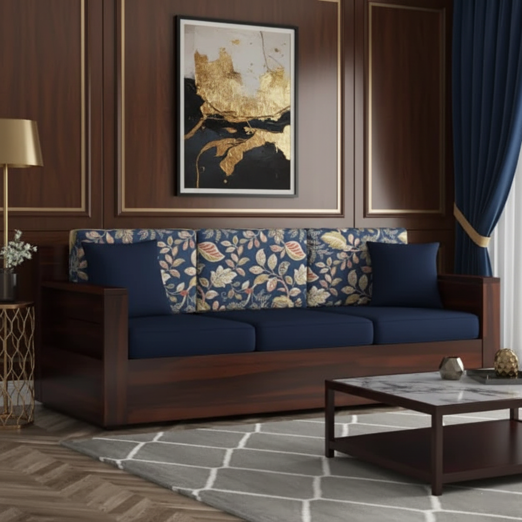 घर के लिए 3 सीटर लकड़ी का सोफा, फर्नीचर, असबाब, फ़ैब्रिक, प्रीमियम आरामदायक सोफा, लिविंग रूम के लिए टिकाऊ डिज़ाइन - नेवी ब्लू