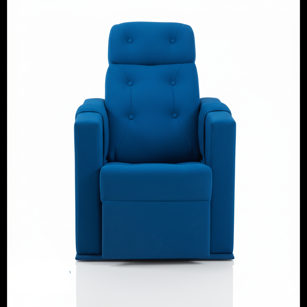 तकिये के ऊपर आर्मरेस्ट वाली लकड़ी की हल्की नीली कुर्सी