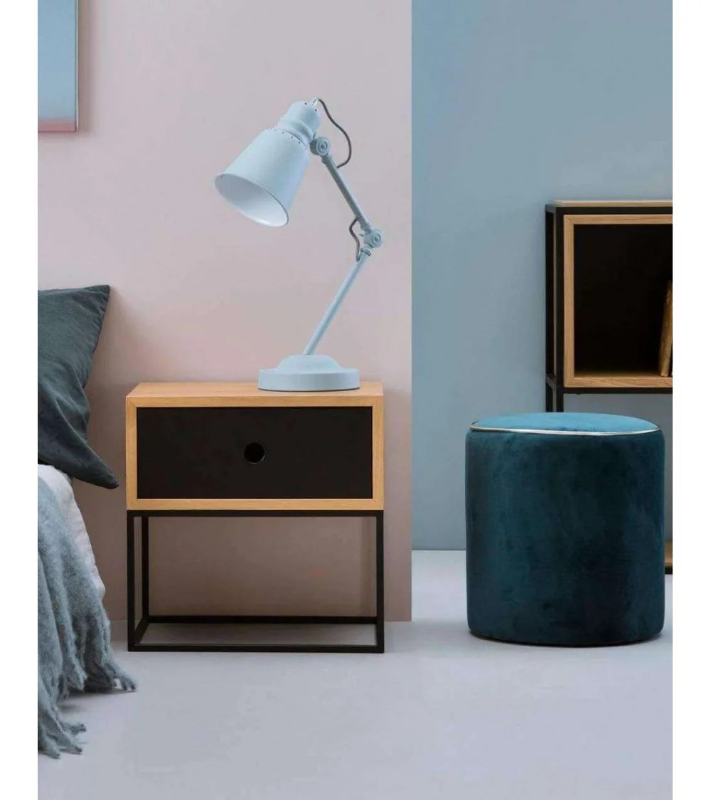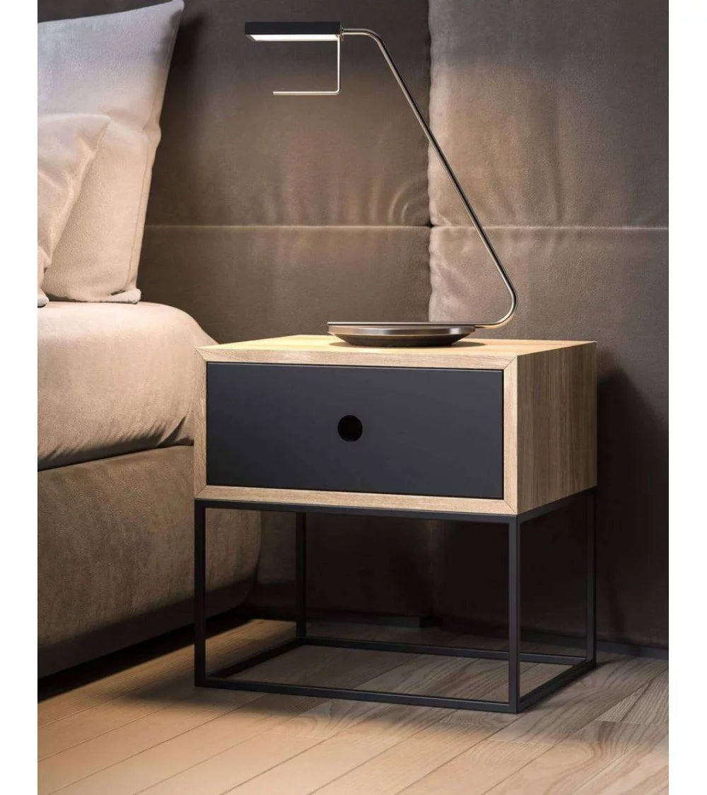 धातु फ्रेम बेस में दराज के साथ लकड़ी की साइड टेबल
