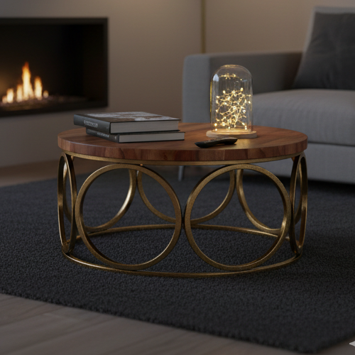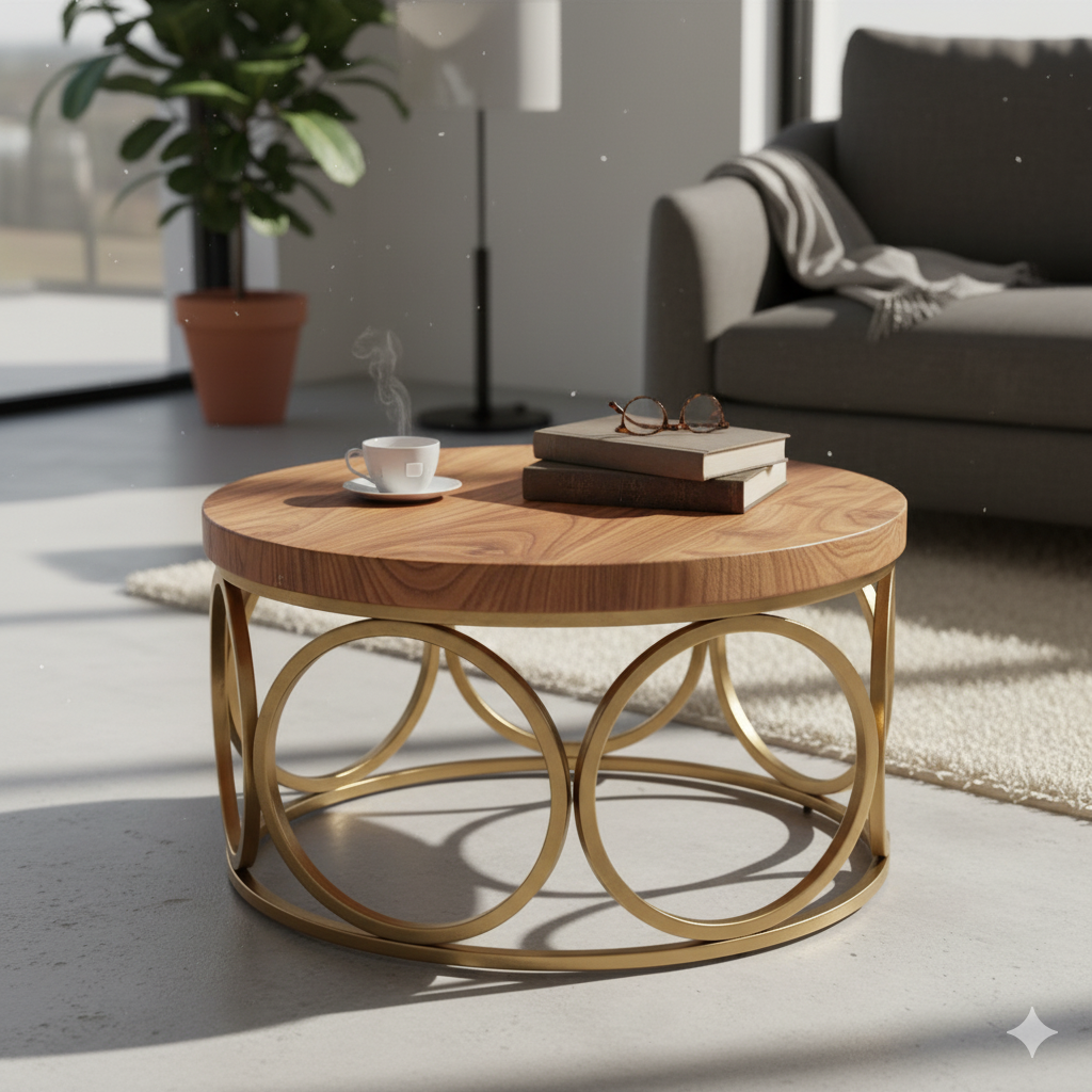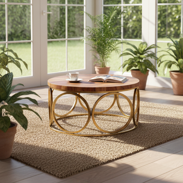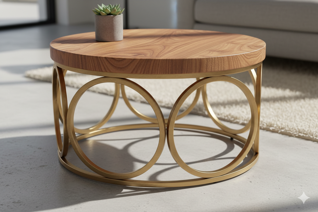 लकड़ी के टॉप और सुनहरे धातु के फ्रेम में गोल आकार की साइड टेबल