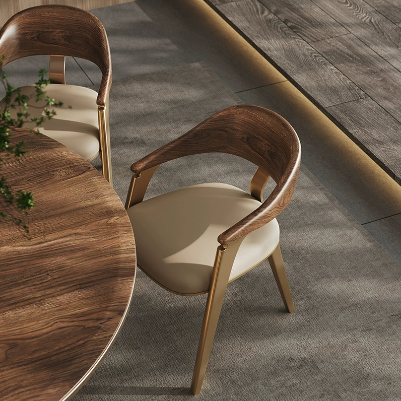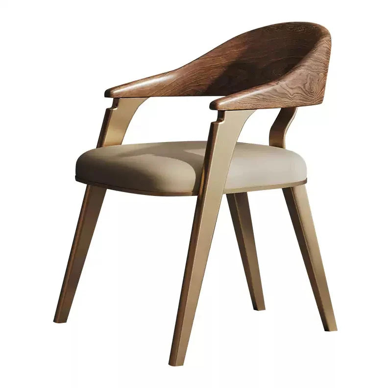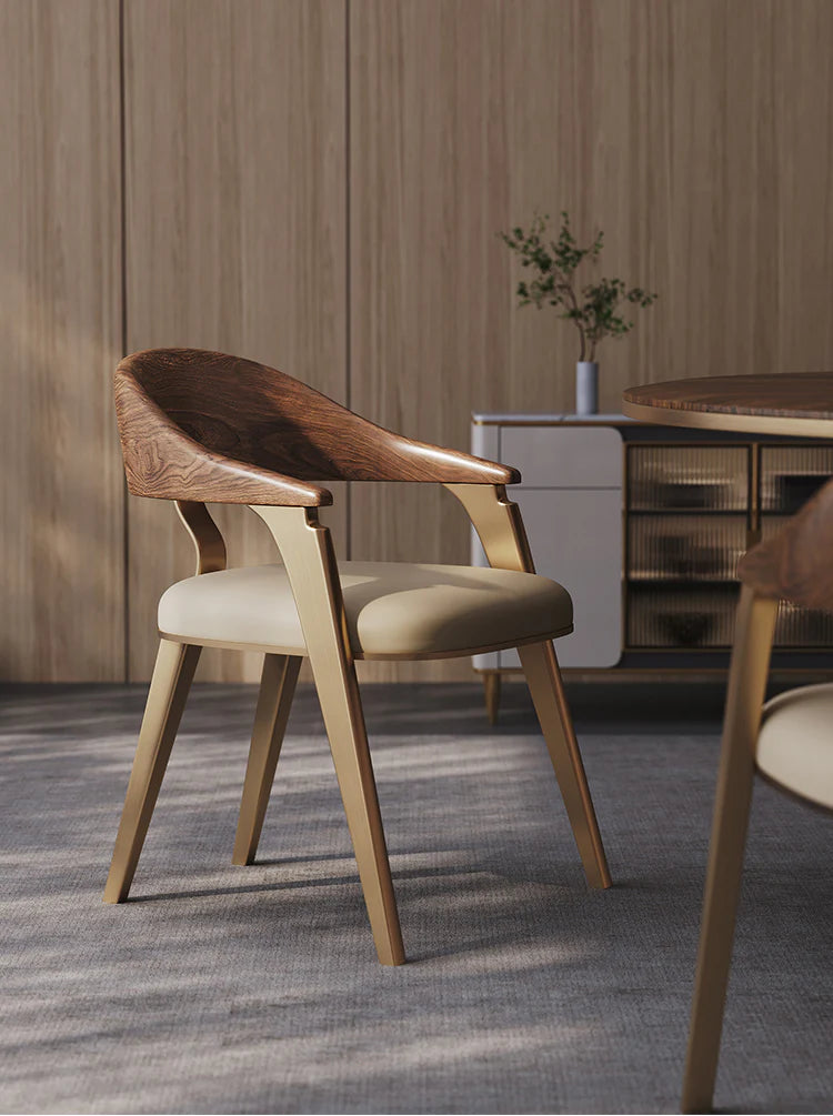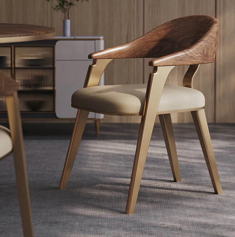 फ़ीचर: Mid-Century Modern Glamour: The chair features a sophisticated silhouette that blends organic wood forms with sleek metallic accents, creating a high-end, designer aesthetic.