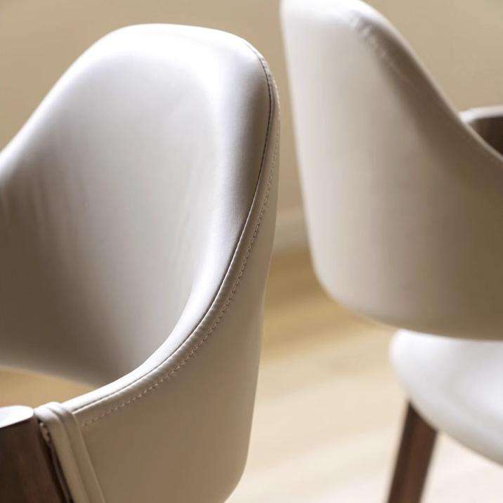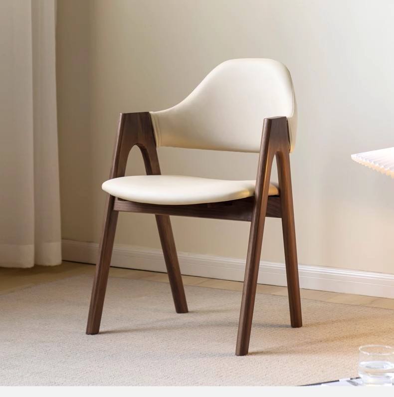 Distinctive Cutout Armrests: A standout design element is the integrated wooden armrests that feature a unique triangular or arch-shaped cutout, adding a light, architectural touch.