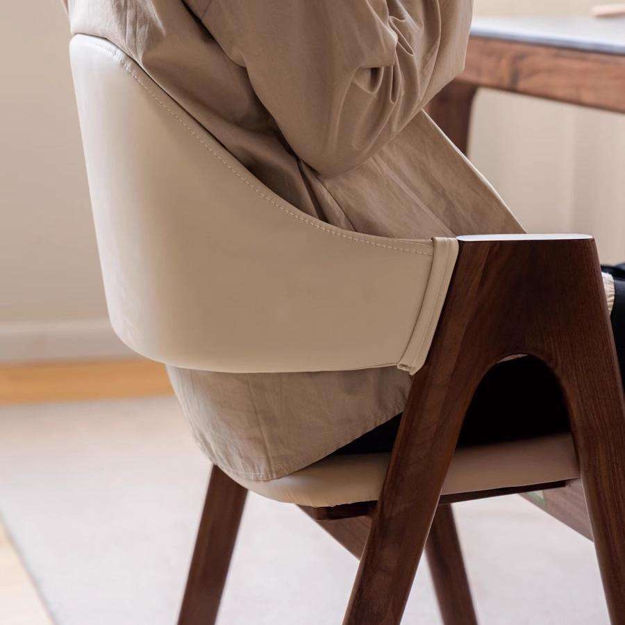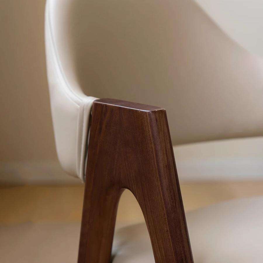 Contrasting Two-Tone Materials: The chair beautifully combines a rich, dark walnut-finished solid wood frame with smooth, matte cream or off-white upholstery (likely faux leatherette).
