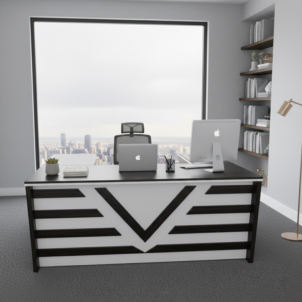 पार्टिकल बोर्ड से बनी डायरेक्टर और एग्जीक्यूटिव एल-आकार की ऑफिस टेबल, साइड ड्रॉअर और खुले शटर के साथ