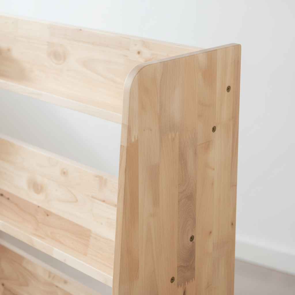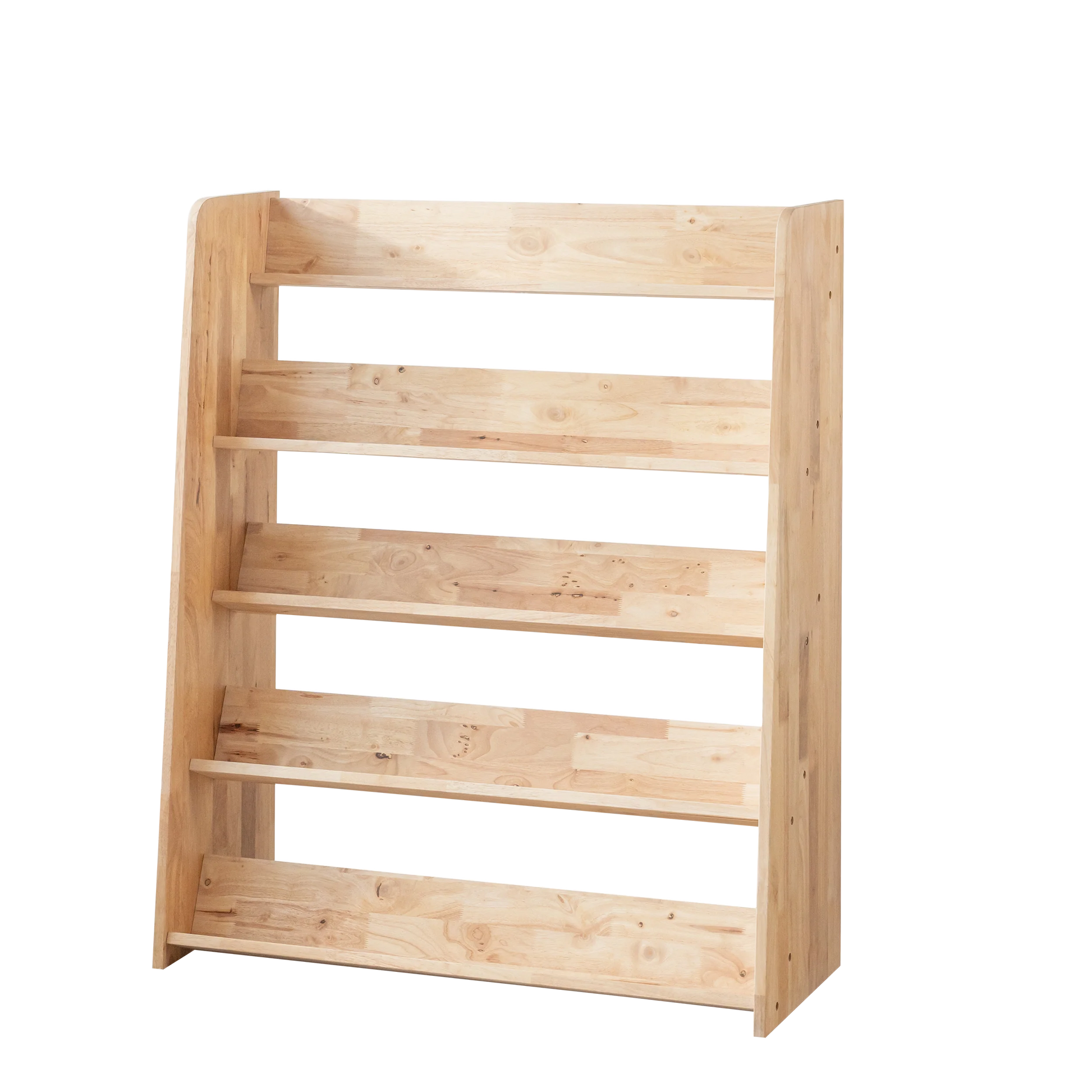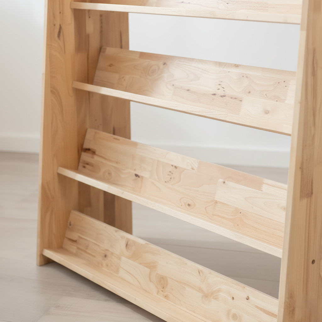 Feature: Front-facing tiered shelves for easy book visibility, spacious storage, stable base, child-safe edges, and an open design that encourages independent reading habits.