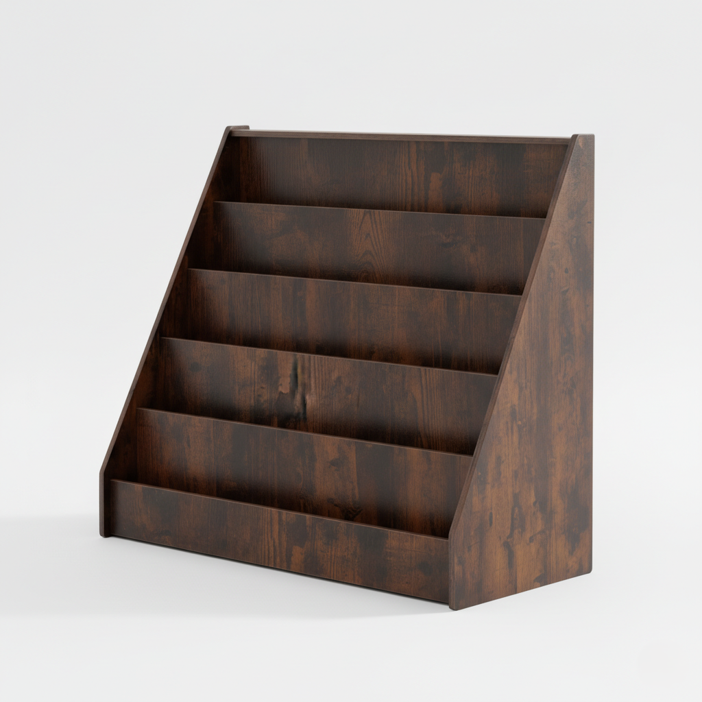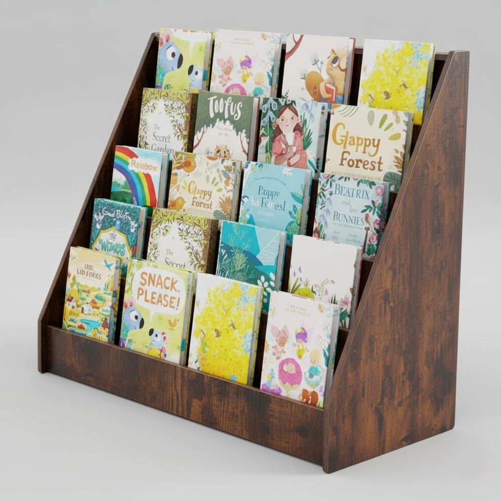 Feature: Multi-level front-facing shelves for easy book visibility, compact footprint, sturdy wooden frame, child-safe edges, and stable base support.