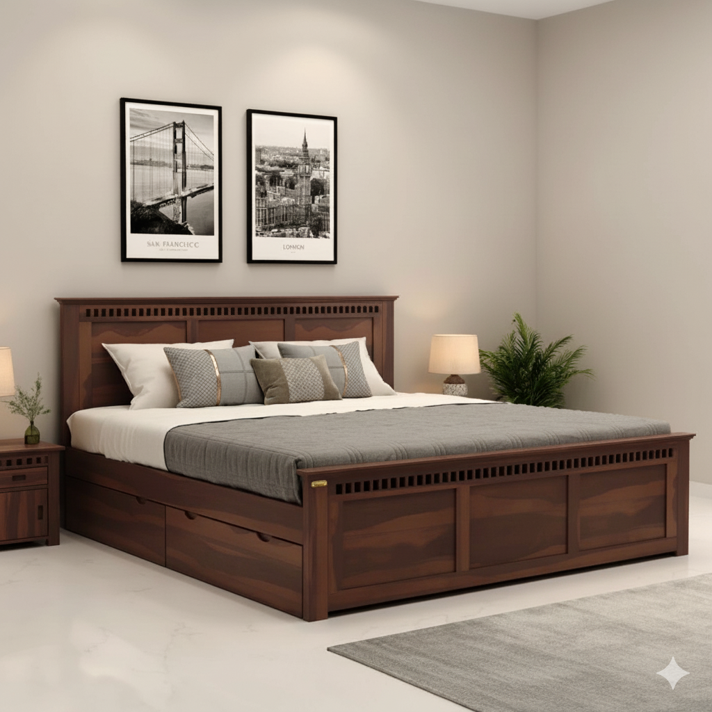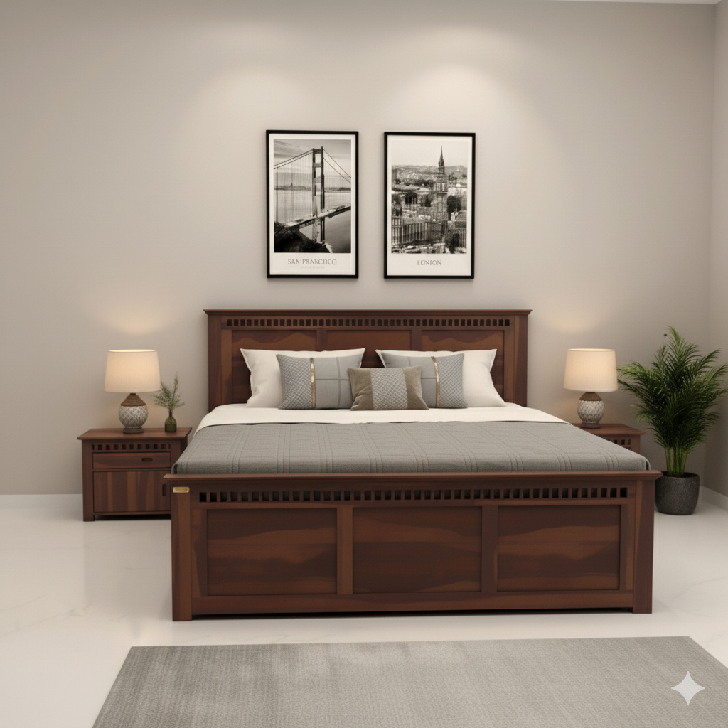 सामग्री: प्रीमियम शीशम की लकड़ी से तैयार किया गया किंग-साइज़ बेड, जिसमें स्लॉटेड हेड/फुटबोर्ड, समृद्ध अखरोट फिनिश में विशाल अंडर-बेड स्टोरेज के लिए चिकनी हाइड्रोलिक लिफ्ट शामिल है।