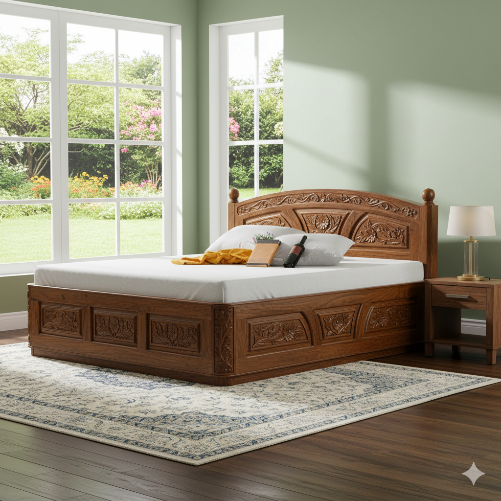विशेषता :- लक्जरी डिज़ाइन किंग साइज़ बेड हाइड्रोलिक लिफ्ट तंत्र के साथ बिल्ट-इन स्टोरेज