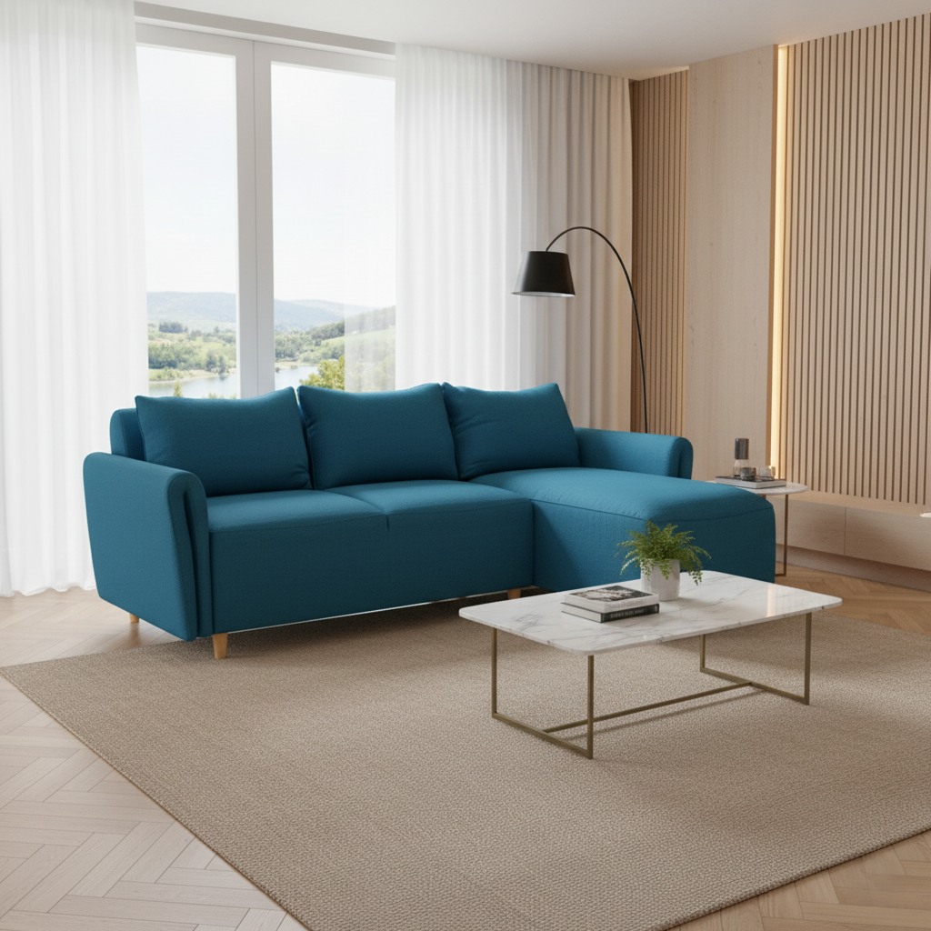 घर और फर्नीचर के लिए 5 सीटर सोफा, असबाब कपड़े, लिविंग रूम के लिए आधुनिक और टिकाऊ डिज़ाइन - नीला