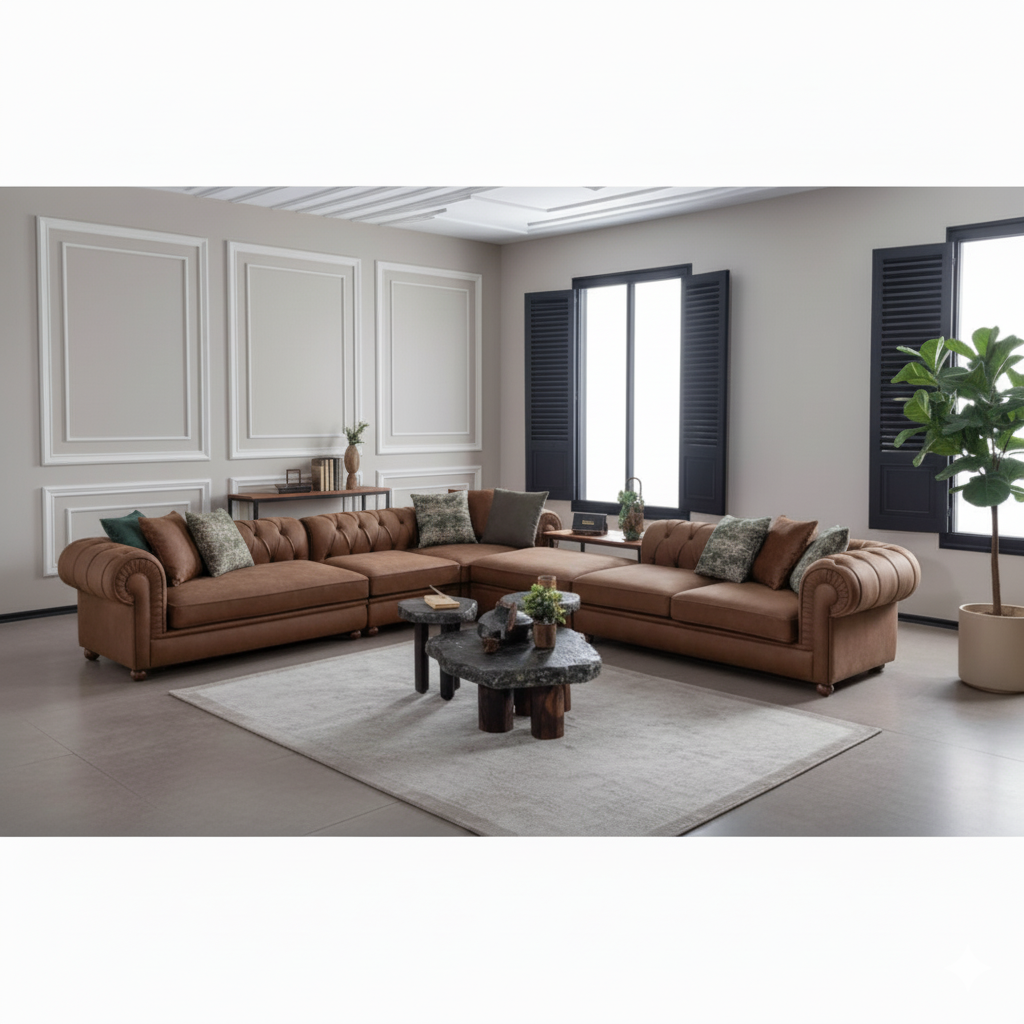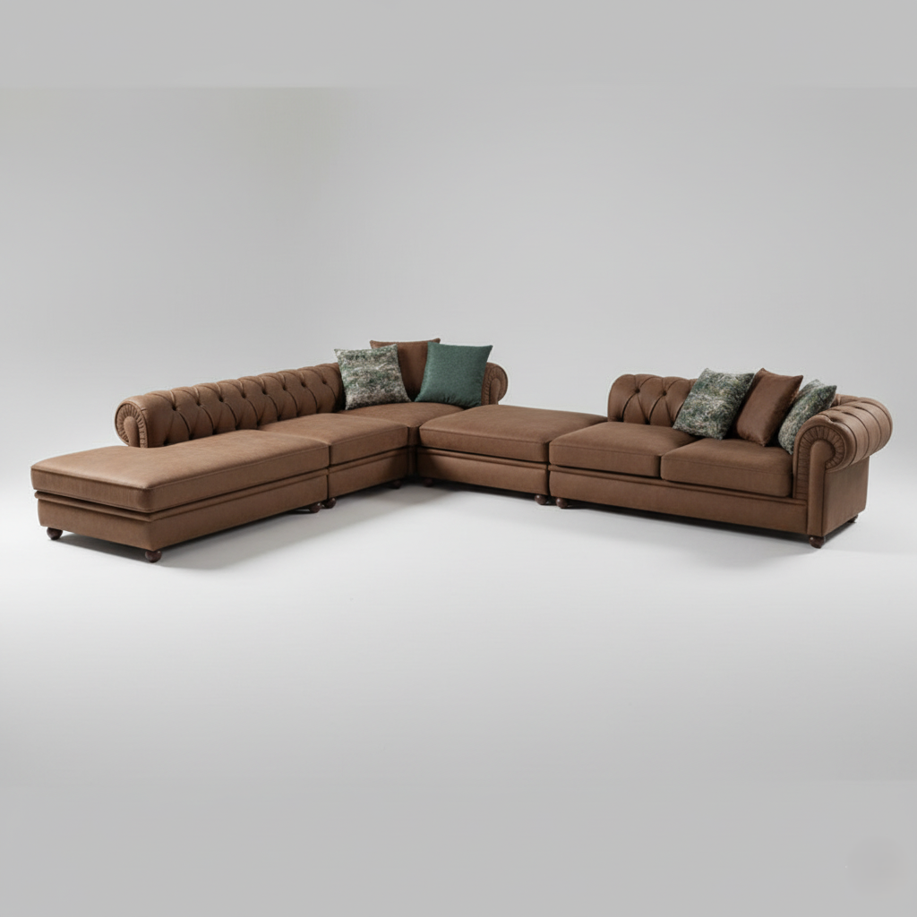 एल आकार का सेक्शनल सोफा, घर के फर्नीचर के लिए आधुनिक लक्जरी, टफ्टेड डिज़ाइन, लेदरेट और मुलायम पैडेड, लिविंग रूम के लिए टिकाऊ