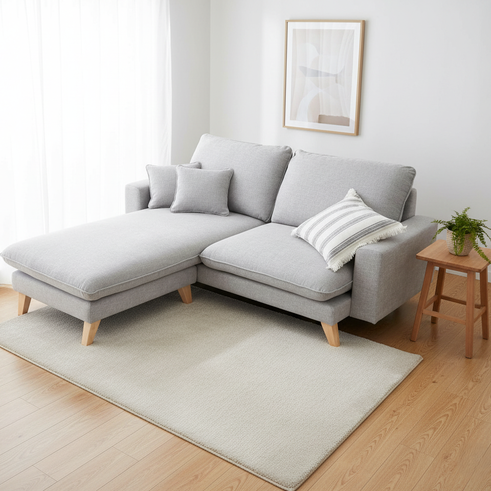 घर के फर्नीचर के लिए एल आकार का सोफा, आधुनिक और अनोखा डिज़ाइन और सागौन की लकड़ी के पैरों के साथ लकड़ी का फ्रेम