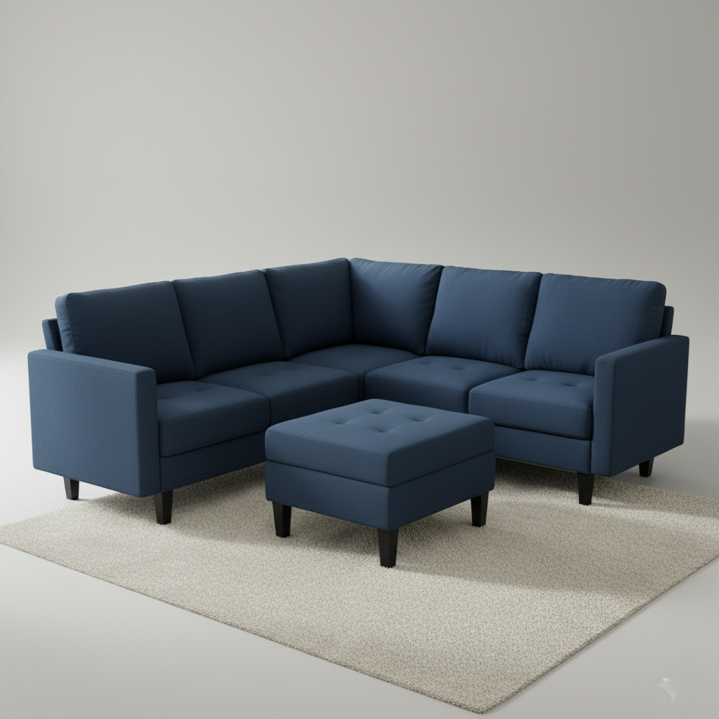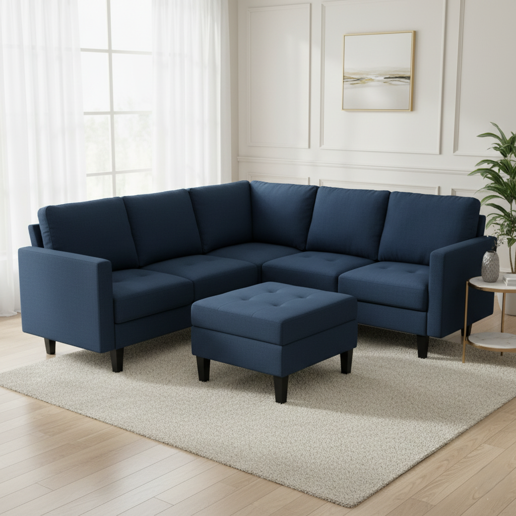 एल आकार का 5 सीटर सोफा, बेहतरीन गुणवत्ता वाली लकड़ी की संरचना और पॉलिश किए हुए पैरों के साथ, कार्यालय और घर, लिविंग रूम | वेटिंग रूम | मीटिंग रूम के लिए उपयुक्त