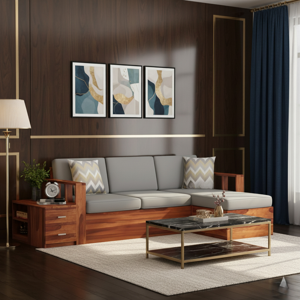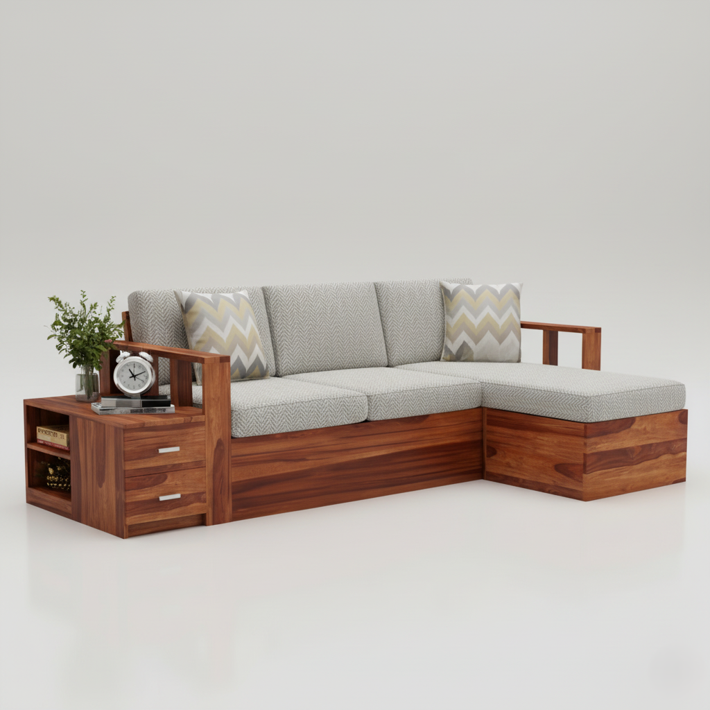 घर के फर्नीचर के लिए एल आकार का लकड़ी का सोफा, असबाब कपड़ा, प्रीमियम आरामदायक सोफा, लिविंग रूम के लिए टिकाऊ डिज़ाइन - ग्रे