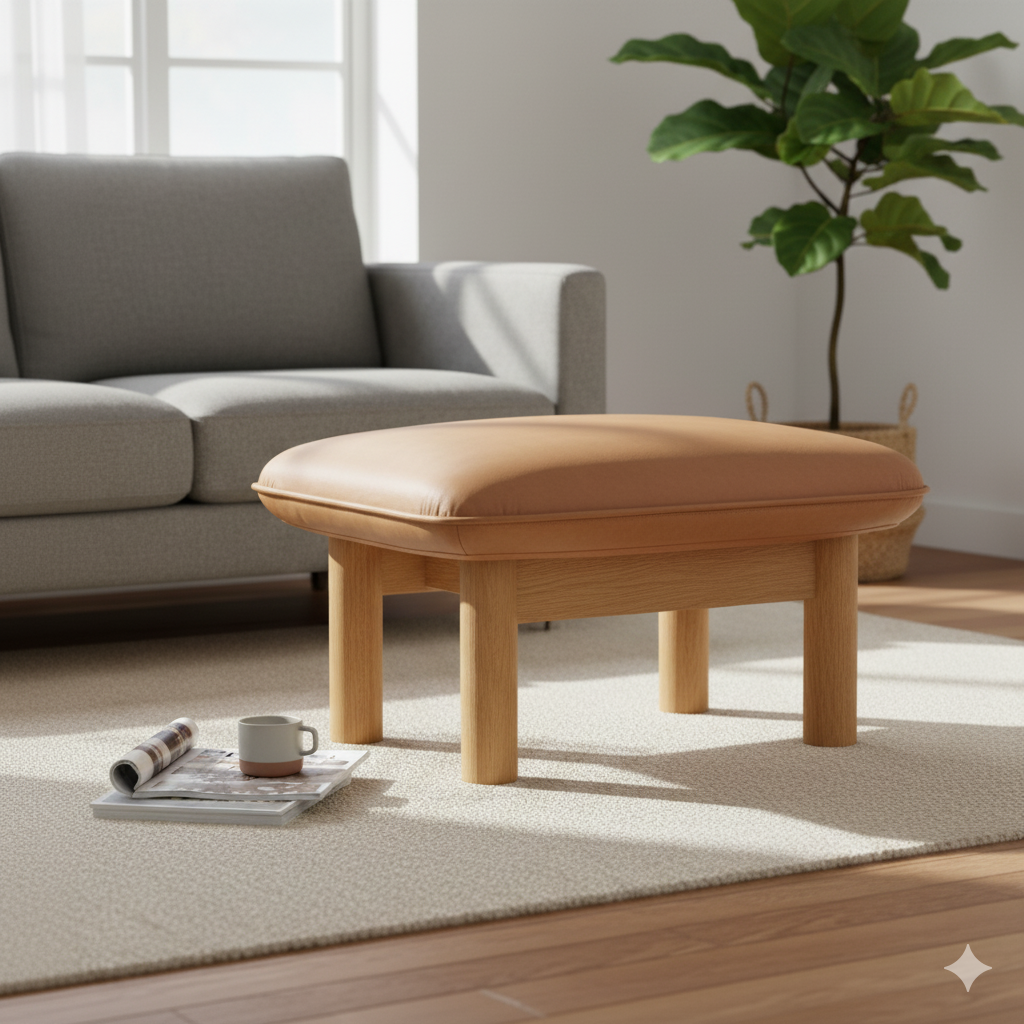 लेदरेट अपहोल्स्ट्री और लकड़ी के बेस वाला ओटोमन