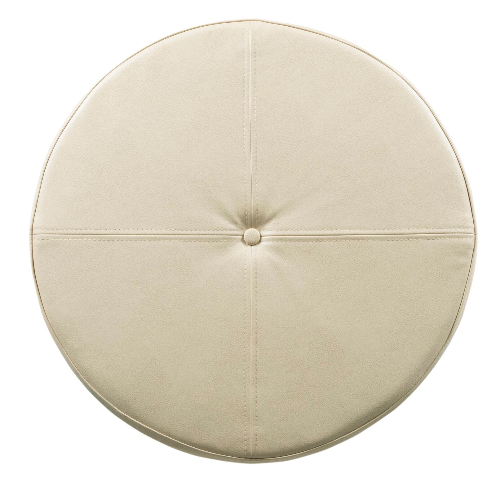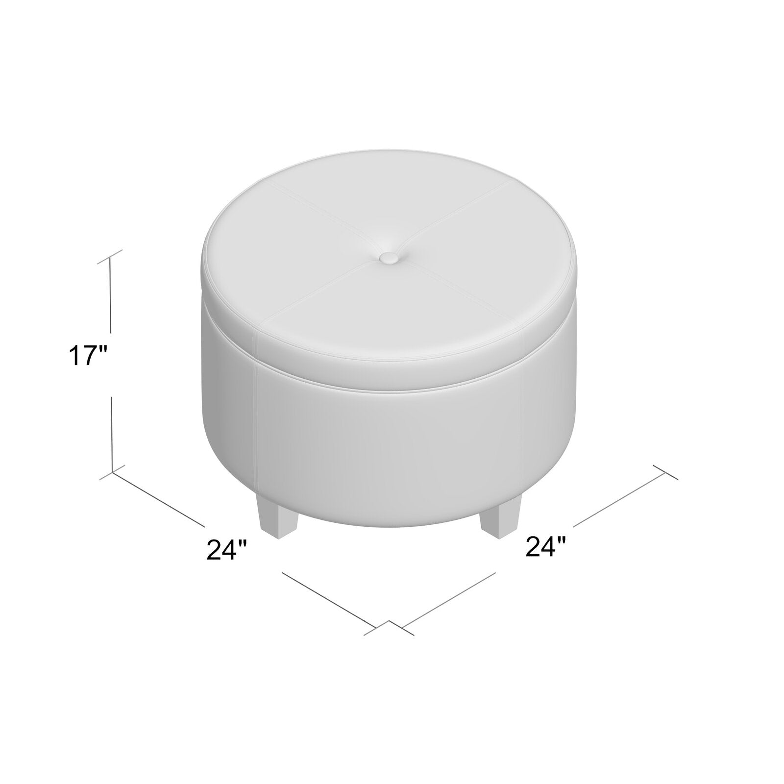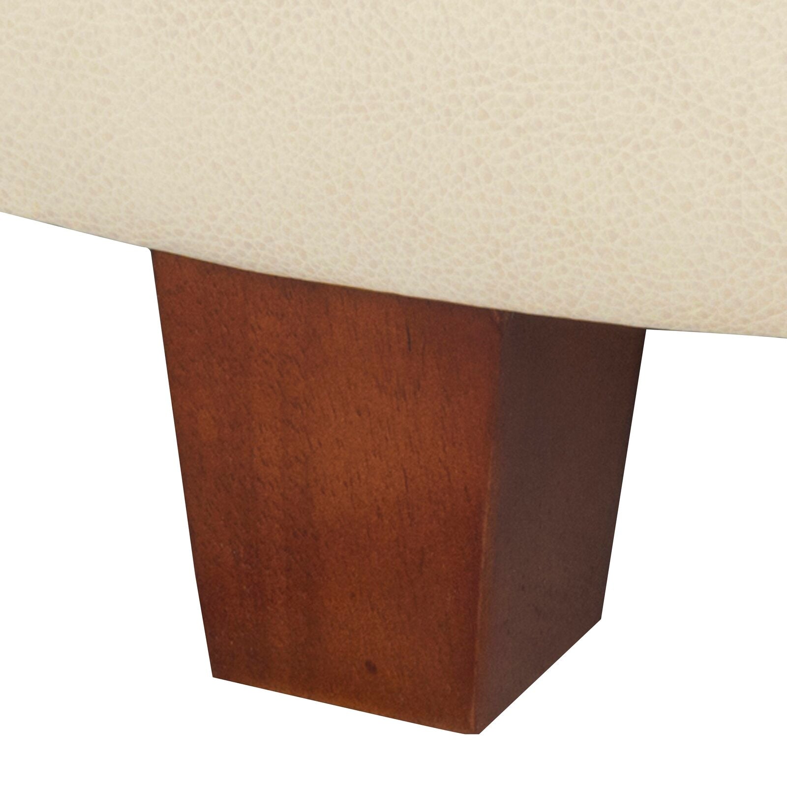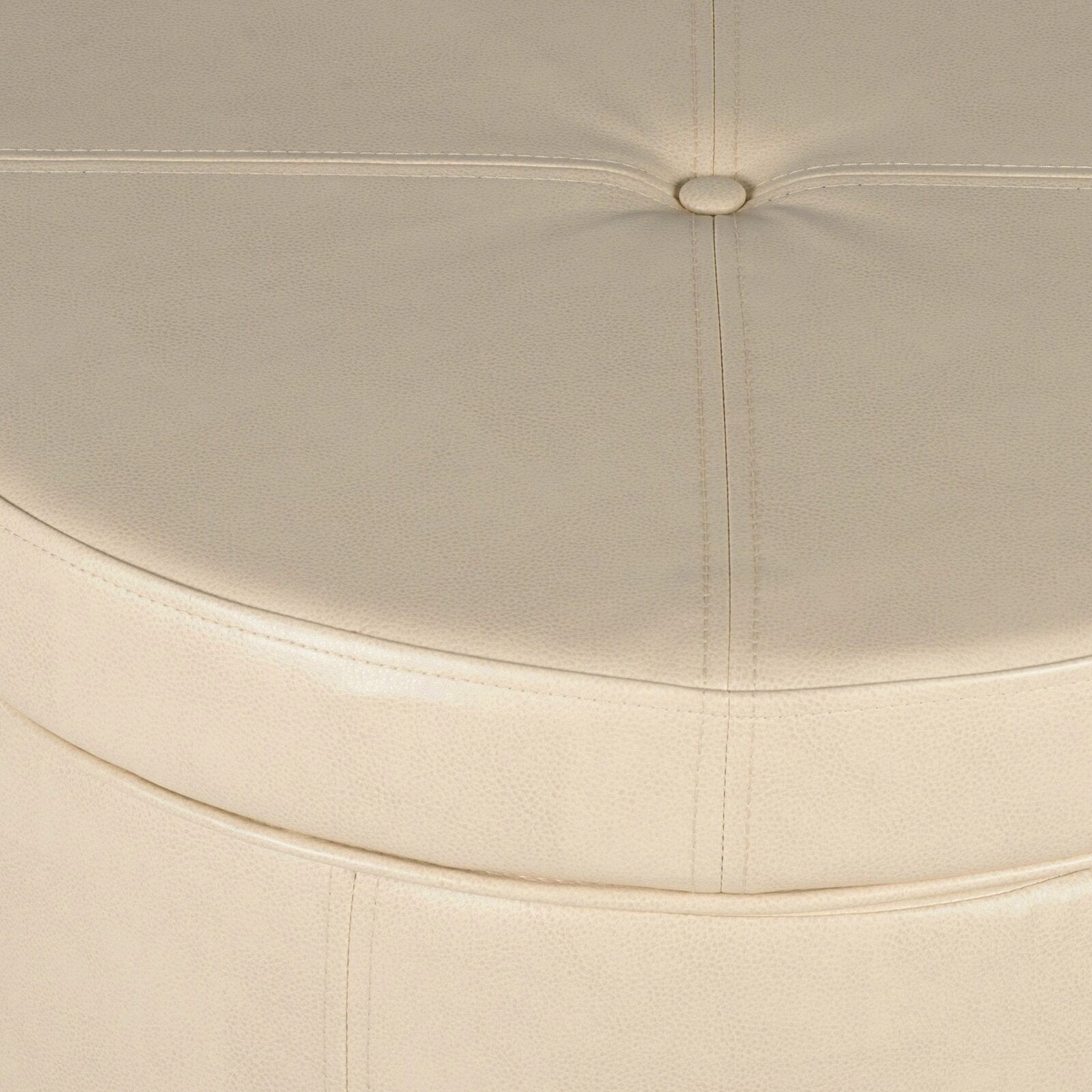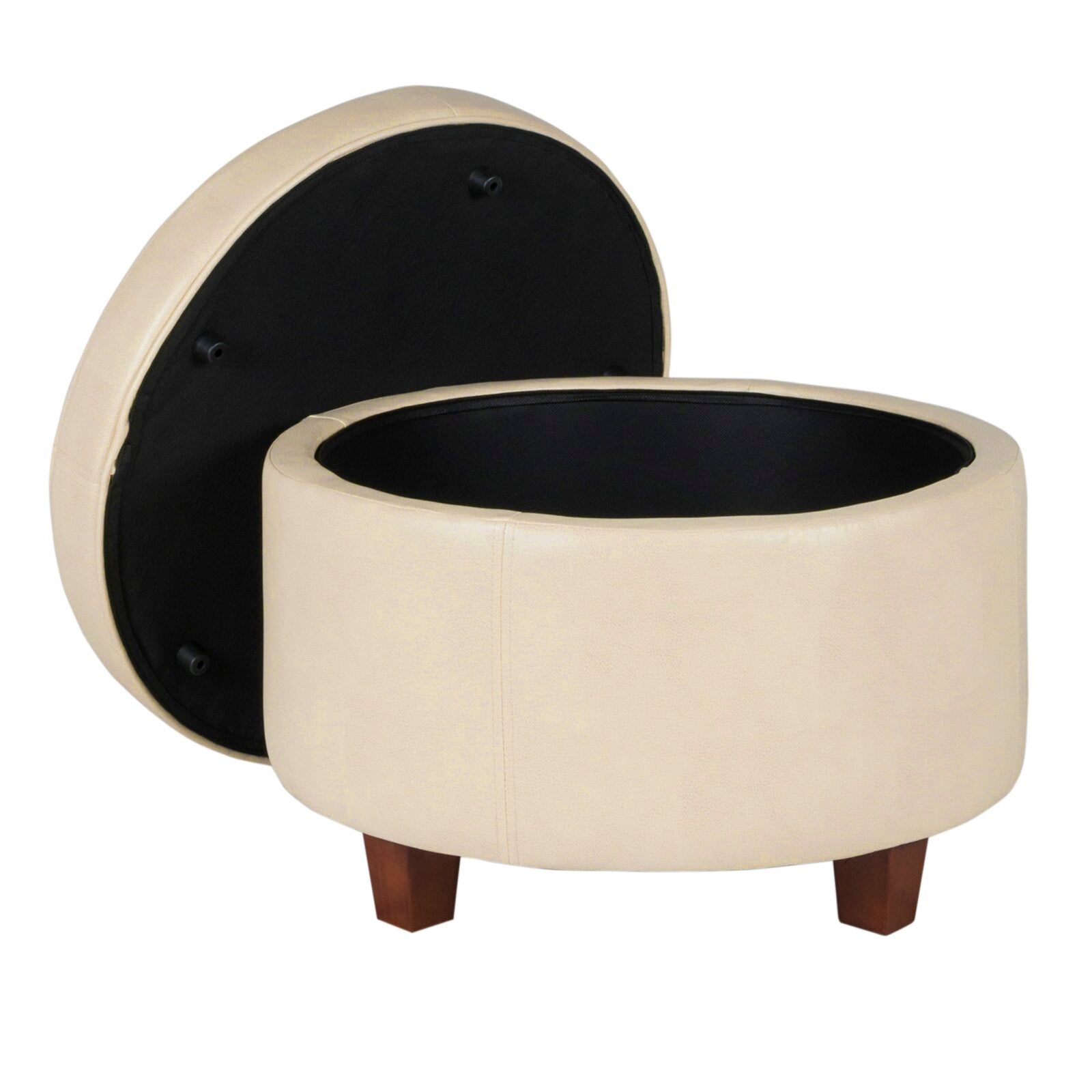 लेदरेट अपहोल्स्ट्री और लकड़ी के बेस वाला ओटोमन स्टोरेज के साथ