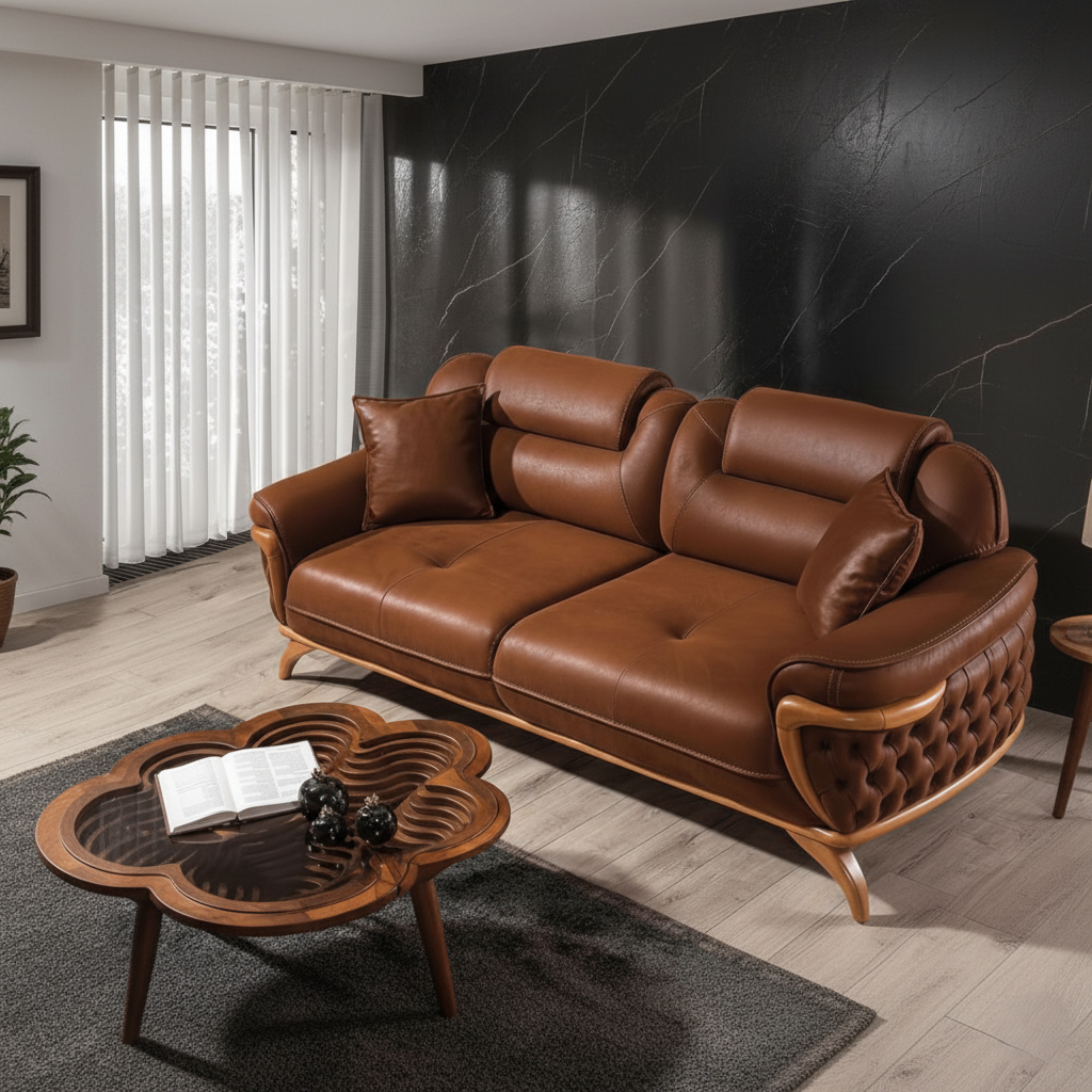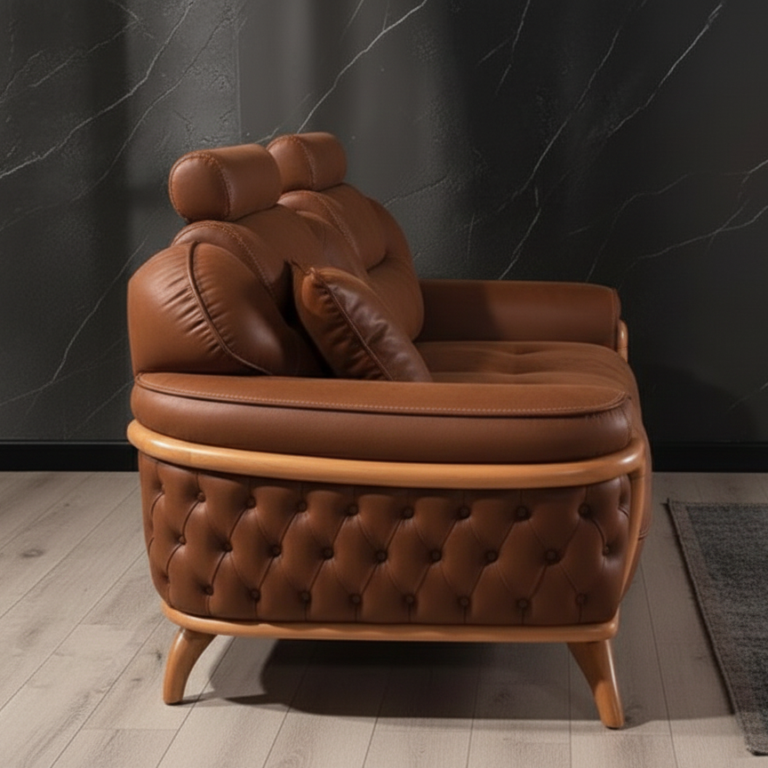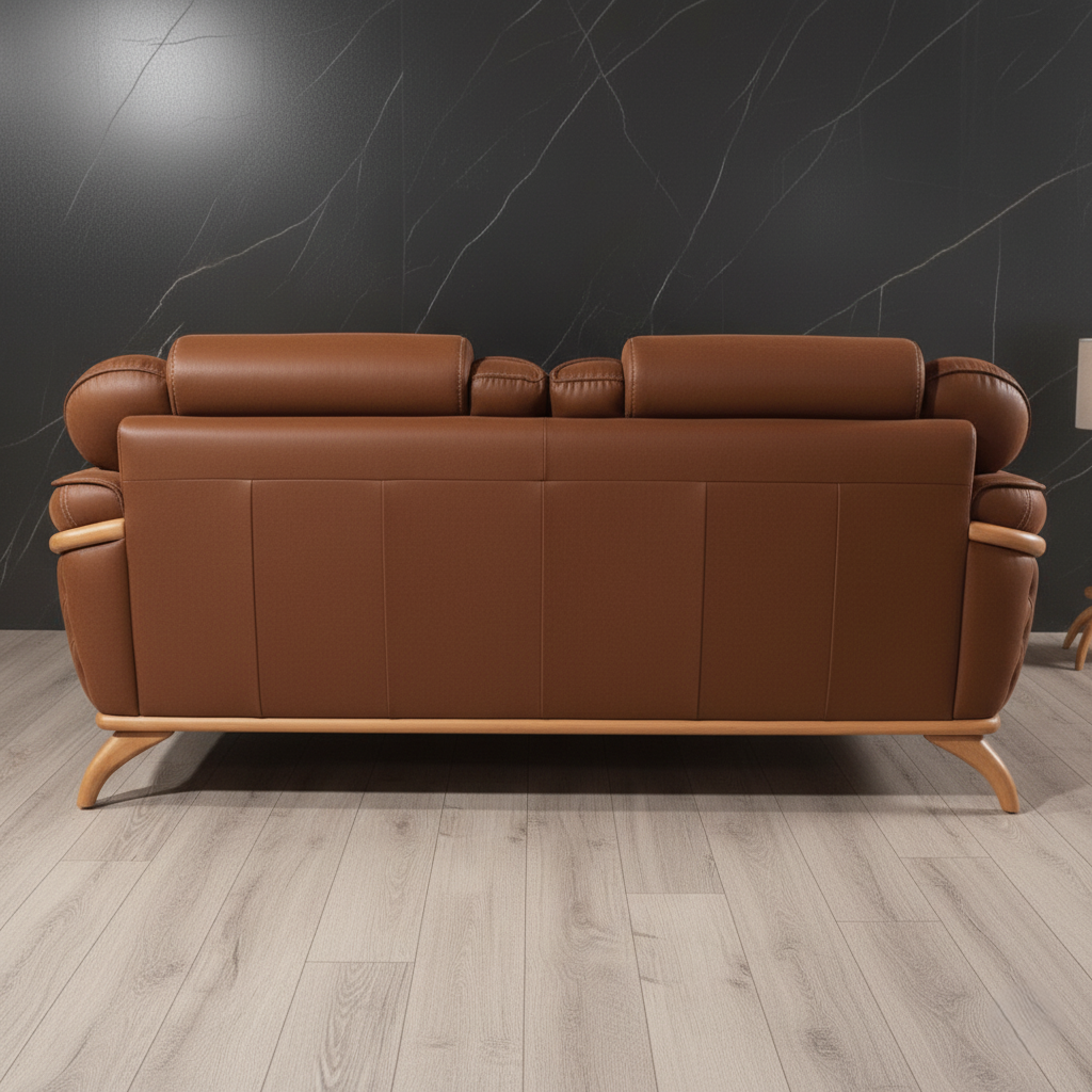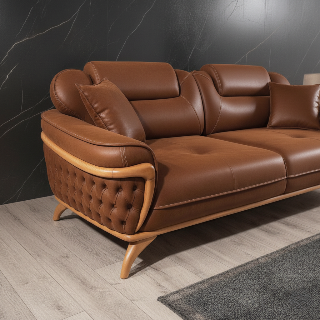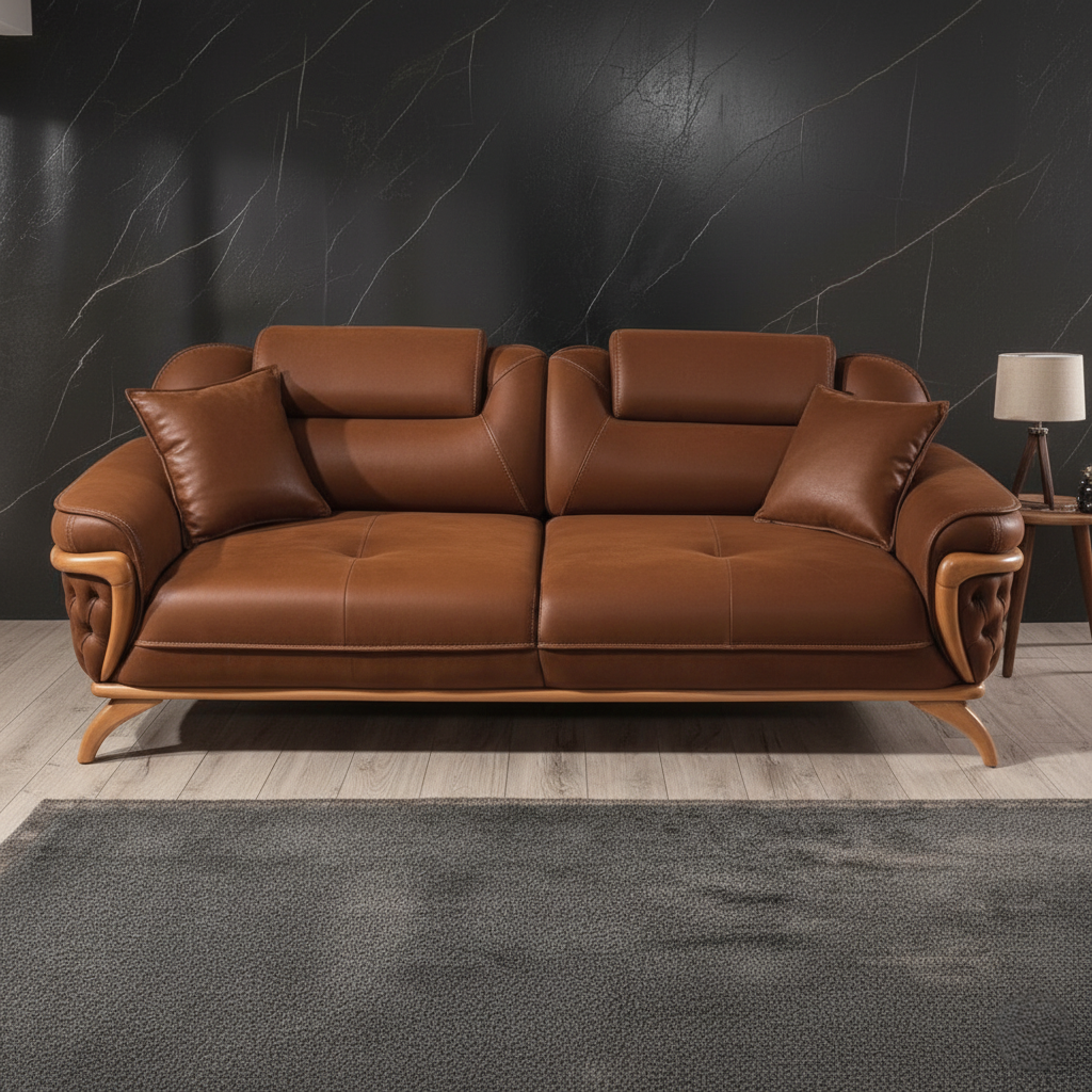 सामग्री : मरांडी लकड़ी से तैयार मजबूत आंतरिक फ्रेम और पीयू लेदरेट असबाब, उच्च घनत्व फोम कुशनिंग और लकड़ी के पैरों के साथ स्तरित।