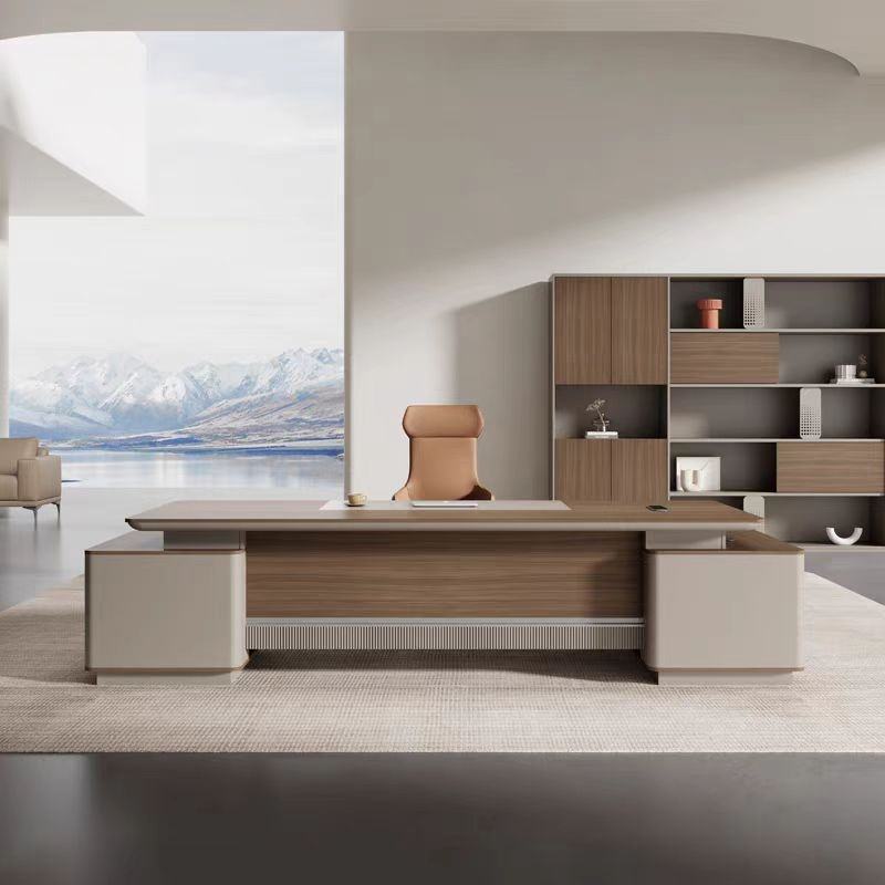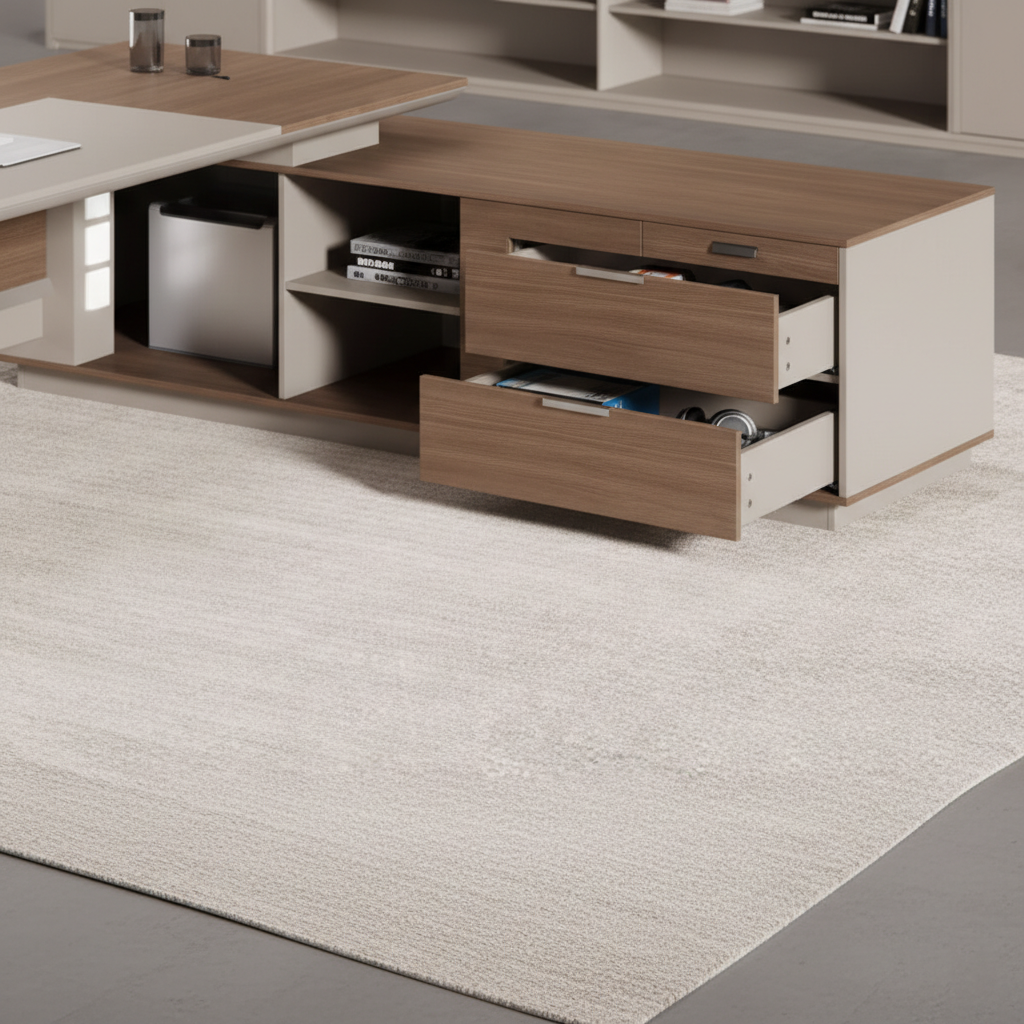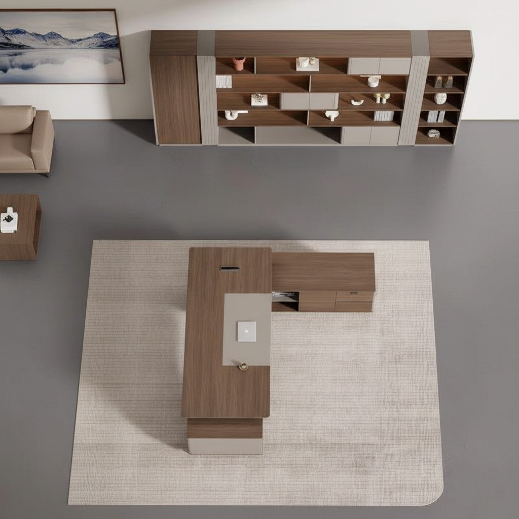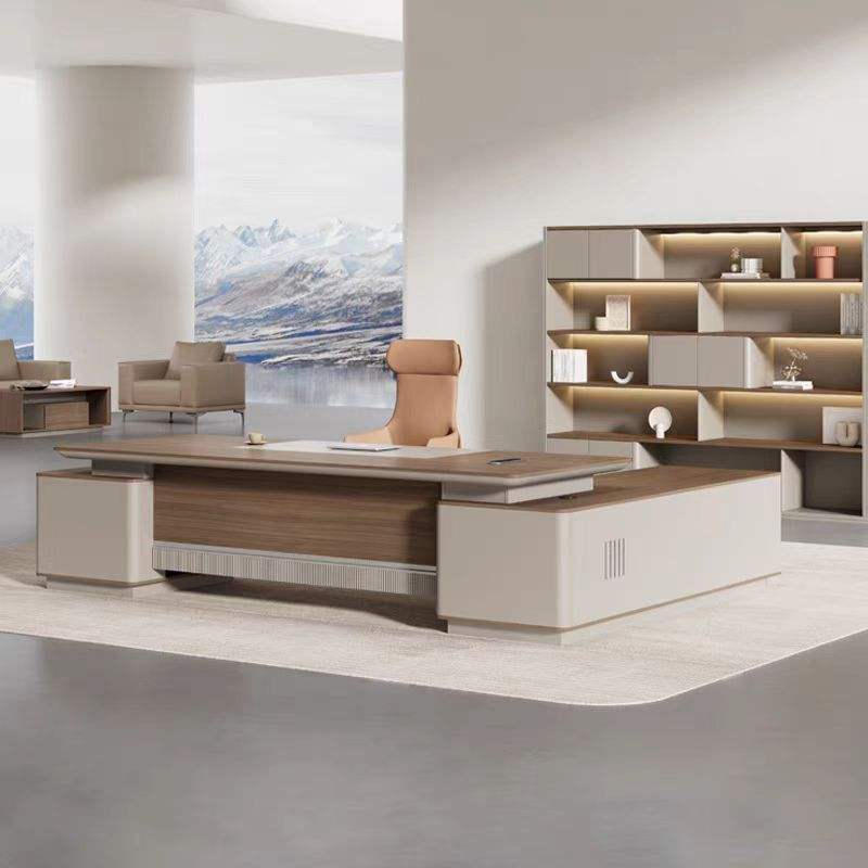 फ़ीचर: Spacious L-shape tabletop, integrated side unit, smooth edge detailing, concealed cable management, sturdy base structure, and ergonomic executive workspace.