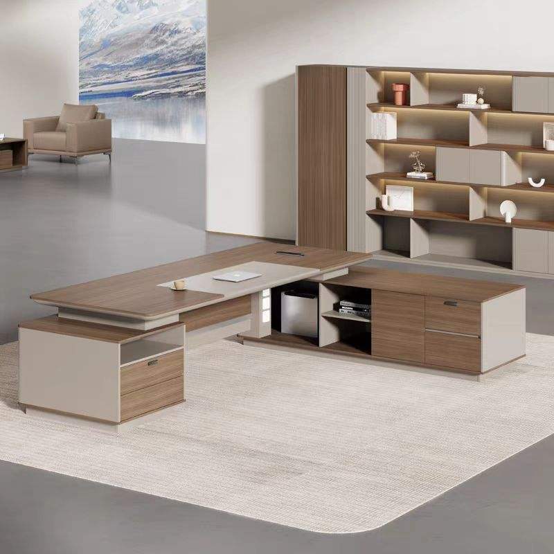 डायरेक्टर एल-आकार का ऑफिस टेबल, आधुनिक डेस्क, पार्टिकल बोर्ड से बना, दराज, रिवर्सिबल ओरिएंटेशन, सीपीयू स्टोरेज और वायर मैनेजमेंट के साथ