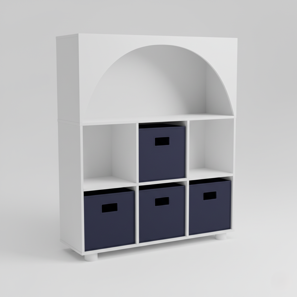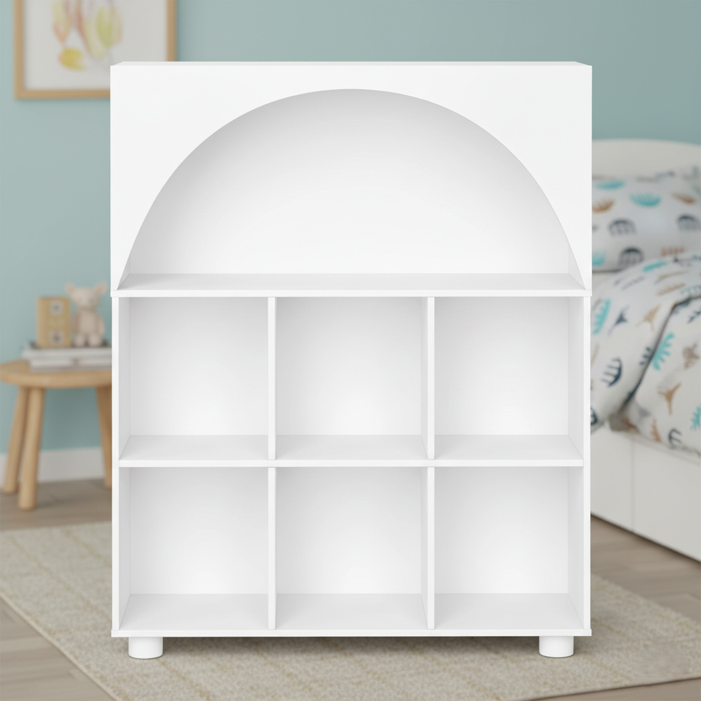 Feature: Large arch open display shelf, six spacious storage cubes, removable fabric bins, sturdy base support, compact vertical design, and child-friendly structure.