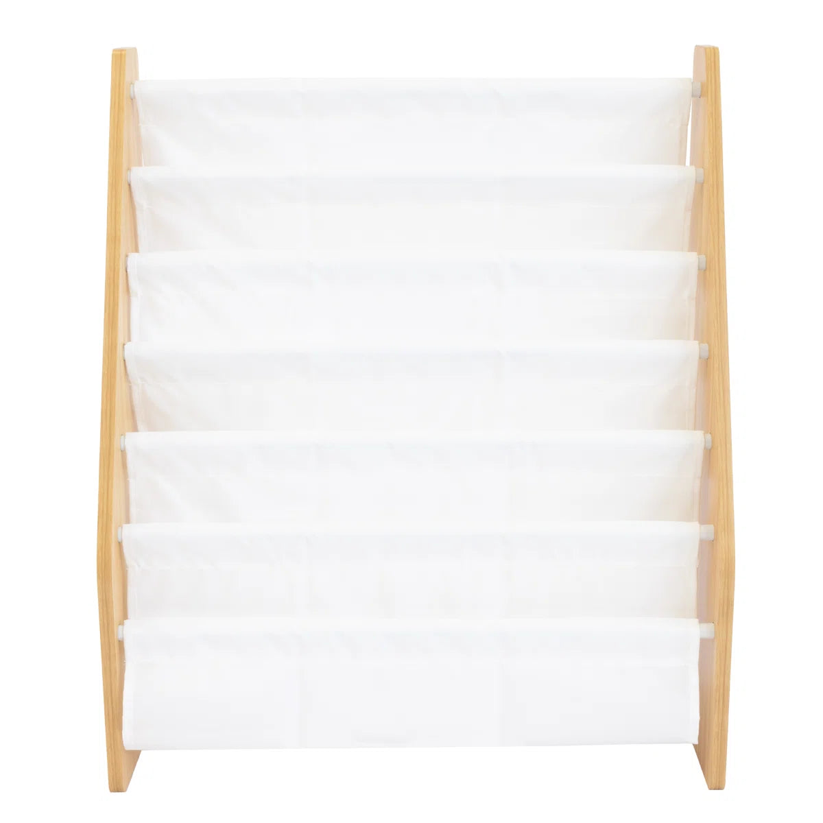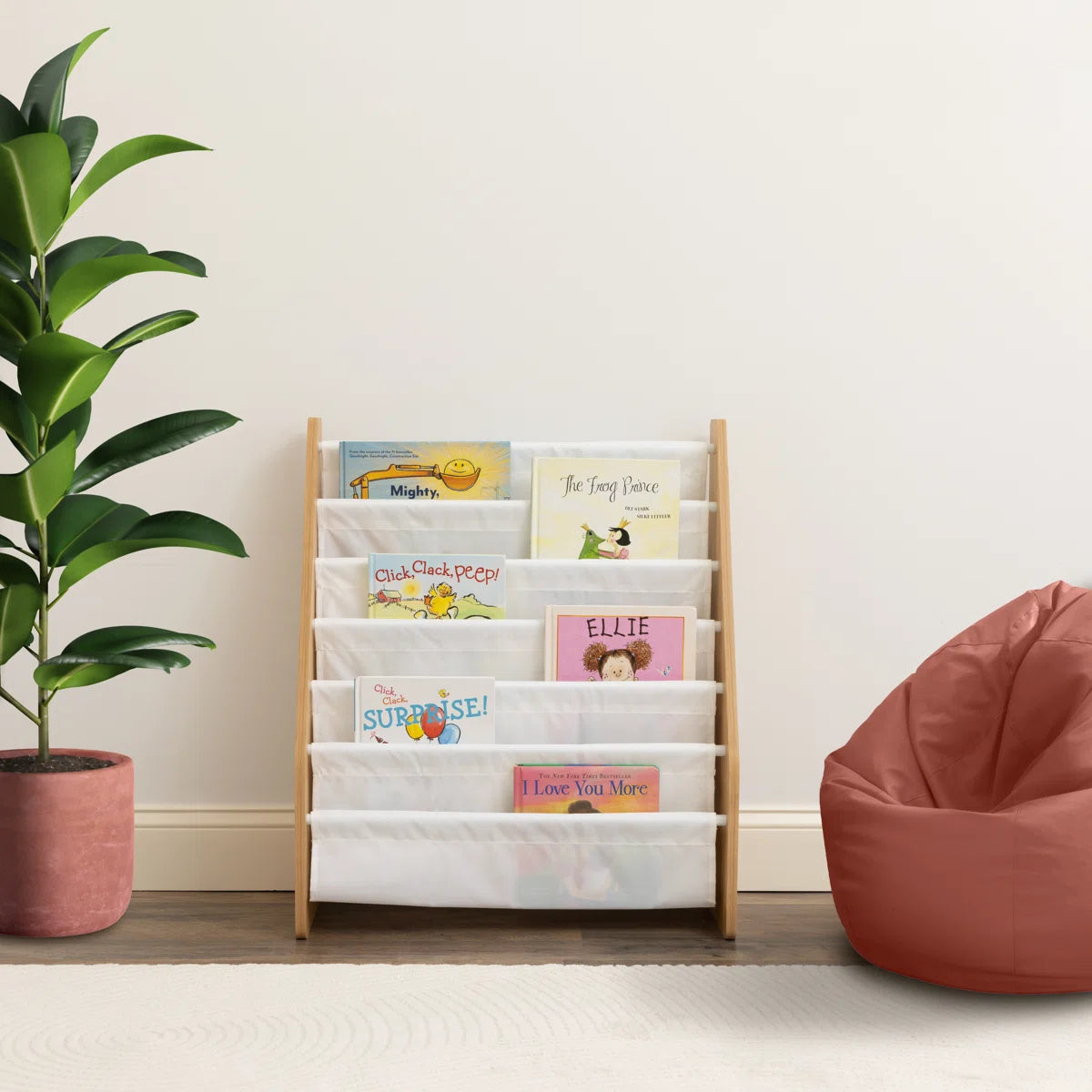 Modern Kids Wooden Sling Bookcase with Front Facing Fabric Shelves – Space Saving Children’s Book Display Rack for Nursery, Bedroom and Playroom