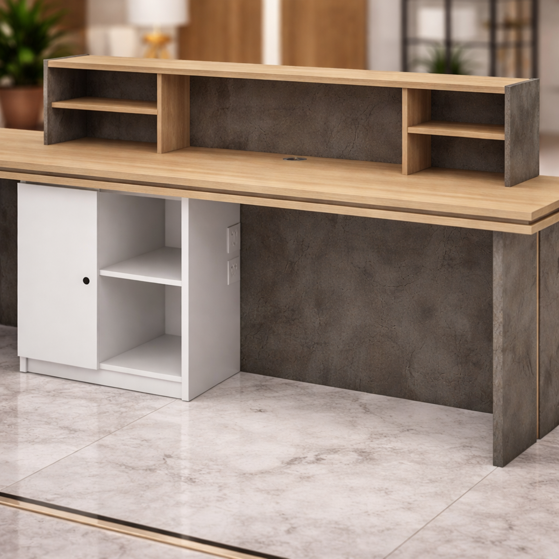 विशेषता: रिसेप्शन टेबल - 1 दराज-भंडारण और खुलने योग्य बॉक्स, 2 स्विच बोर्ड और टॉप-वायर मैनेजर के साथ