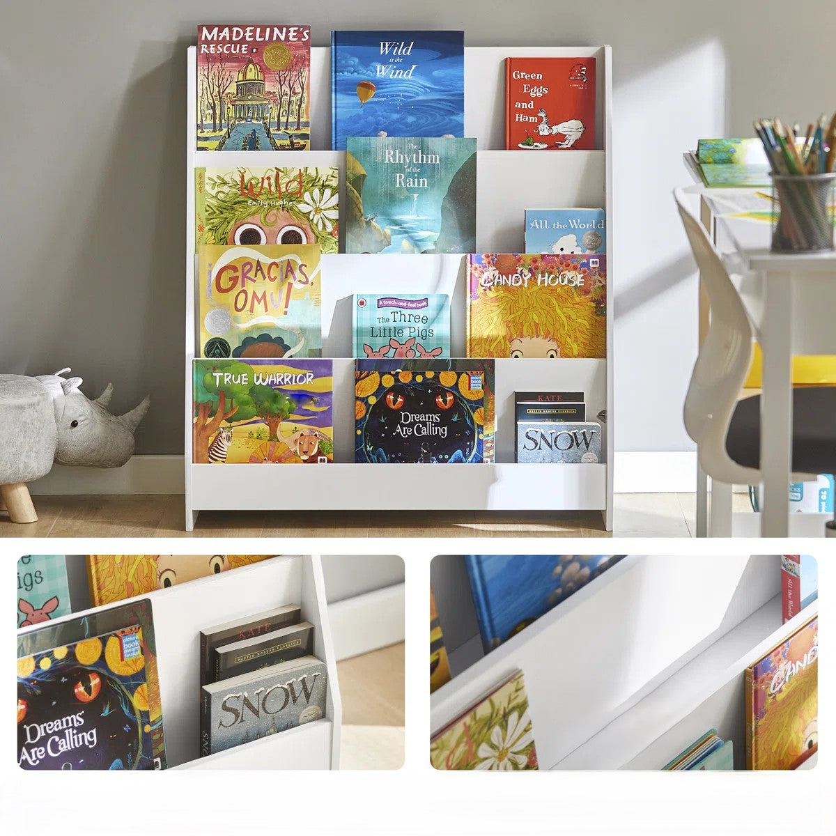 Feature: Tiered front-facing shelves for clear book visibility, space-saving vertical design, sturdy base support, child-friendly height, and easy-access organization.