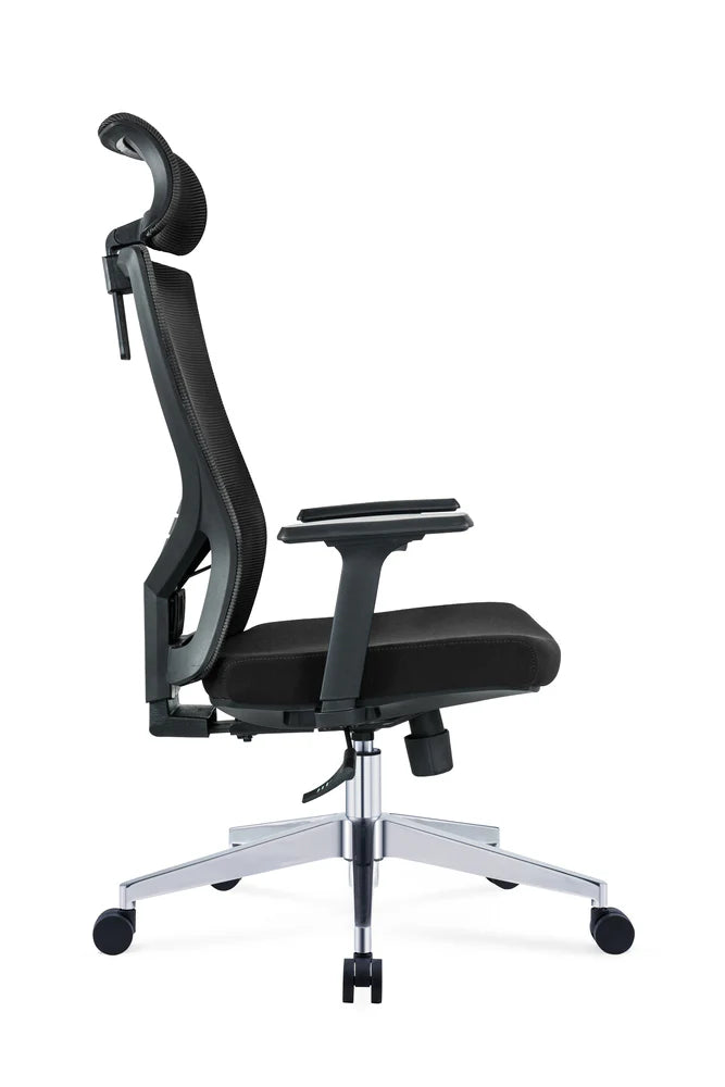 सामग्री:- हाई बैक चेयर, पीयू आर्म्स, गैस लिफ्ट, नायलॉन बेस, नेट बैक और सीट फोम नेट अपहोल्स्ट्री