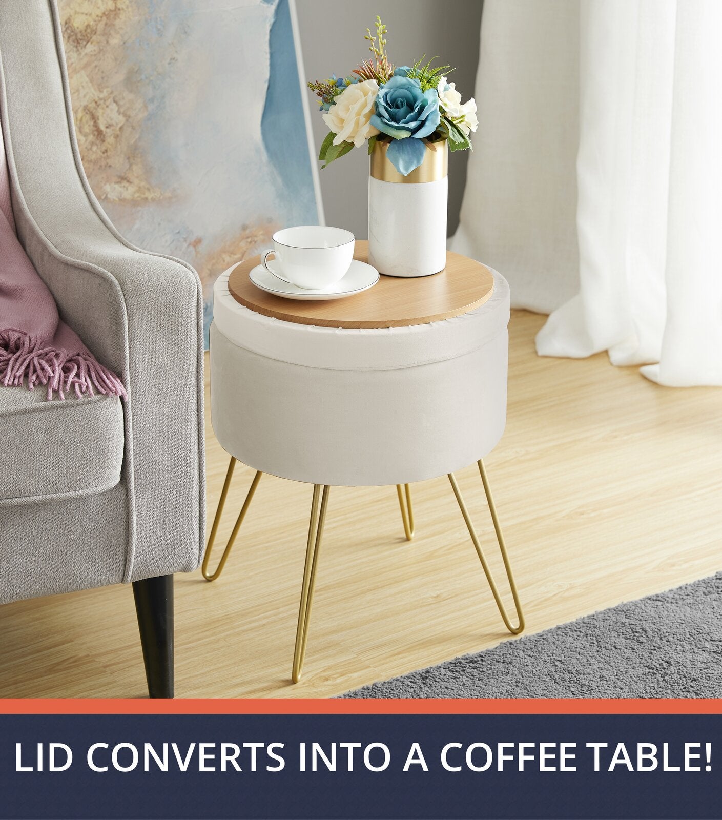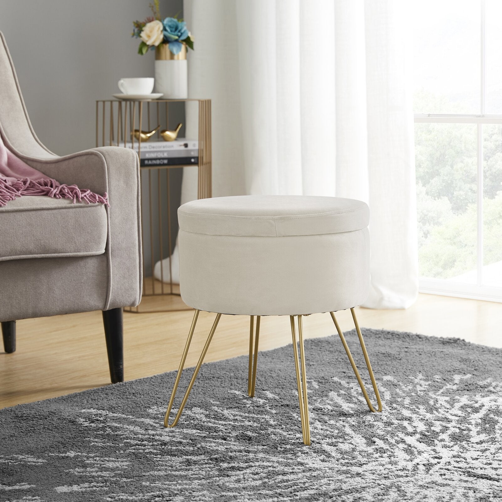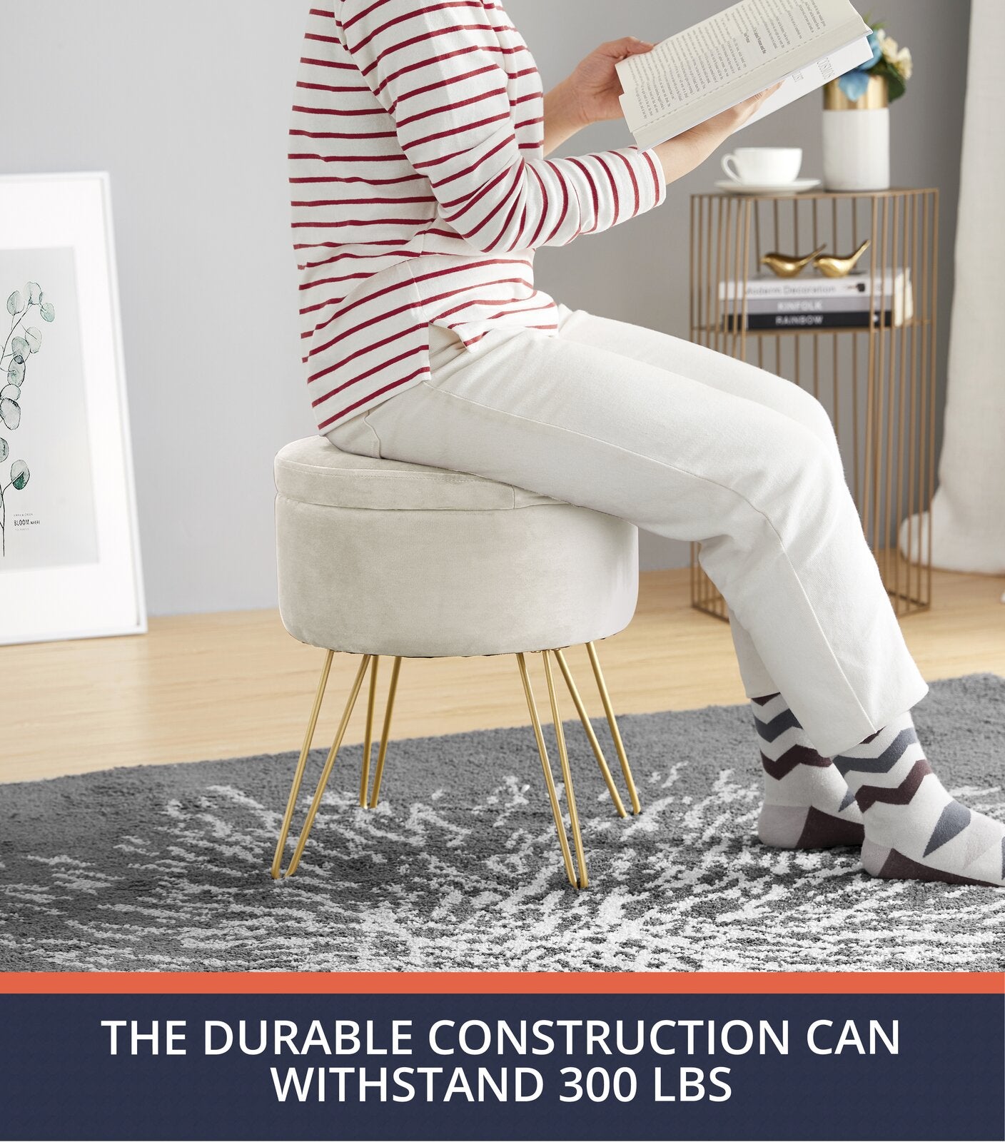 फ़ैब्रिक अपहोल्स्ट्री और मेटल लेग्स बेस पाउफ़ स्टोरेज के साथ