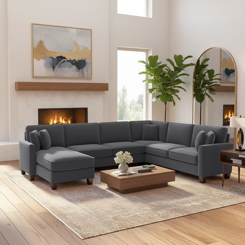 घर के फर्नीचर के लिए 3 सीटर यू आकार सोफा, लिविंग रूम और ऑफिस के लिए आधुनिक और टिकाऊ डिज़ाइन - नीला