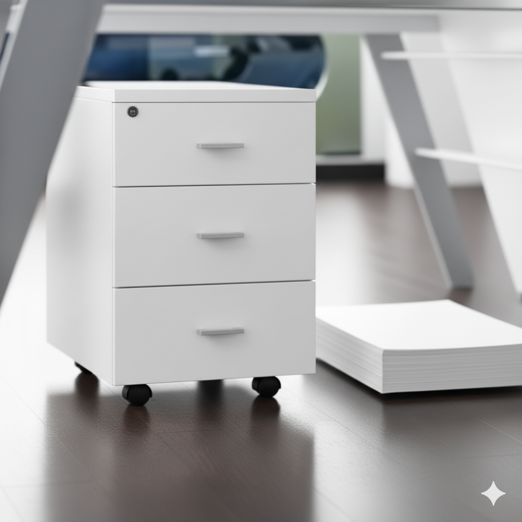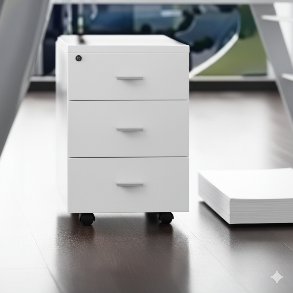 लॉक और पहियों वाले बेस के साथ लकड़ी का पेडस्टल दराज